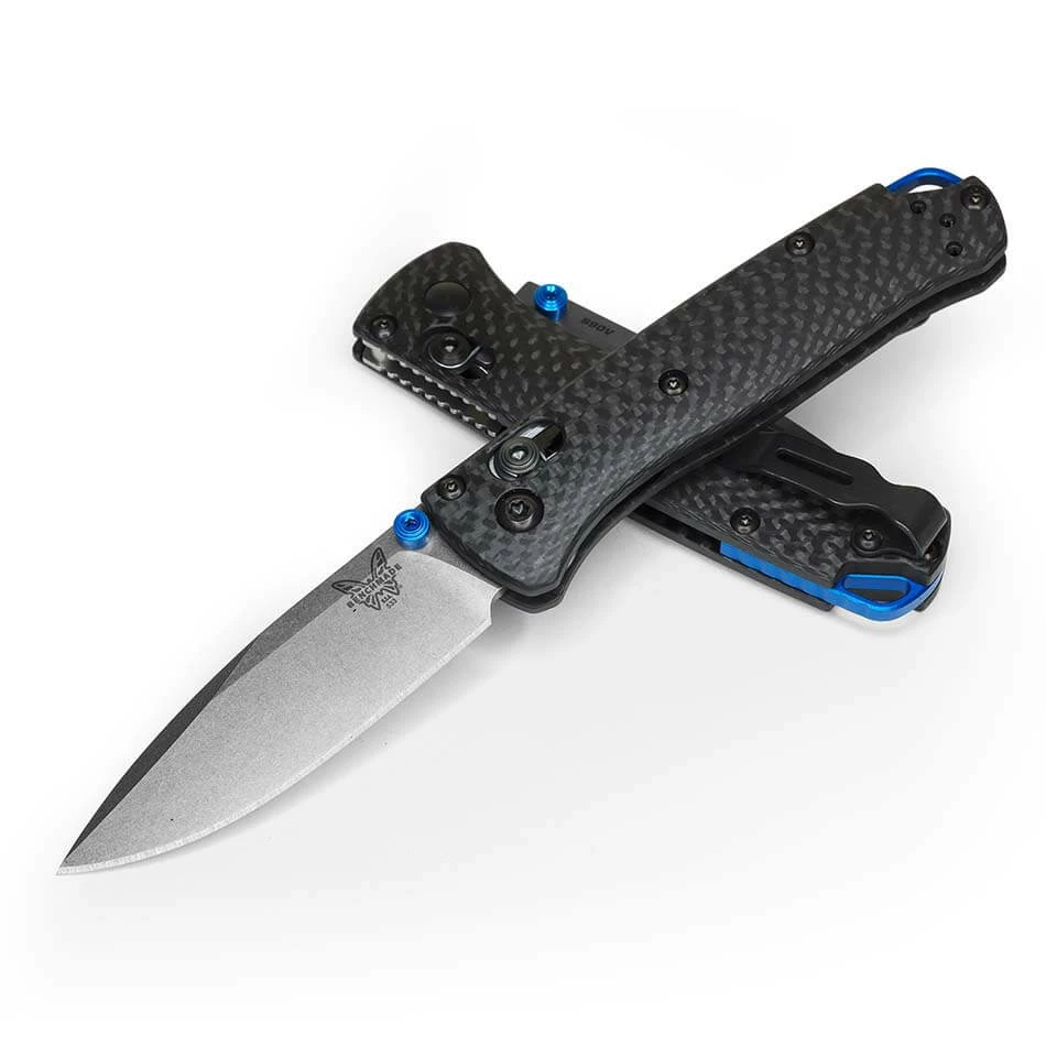 Compact with a touch of class. For those looking to elevate their everyday carry, look no further than the all-new 533-3 Mini Bugout®. Taking cues from its larger counterpart, the 533-3 makes the leap to CPM-S90V super steel and milled carbon fiber handle, featuring a blue anodized aluminum back-spacer and blue thumb studs. Merging signature ultralight utility with ultra-premium materials, the 533-3 Mini Bugout® sets a new standard for this popular line of sub-compact EDC pocket tools.