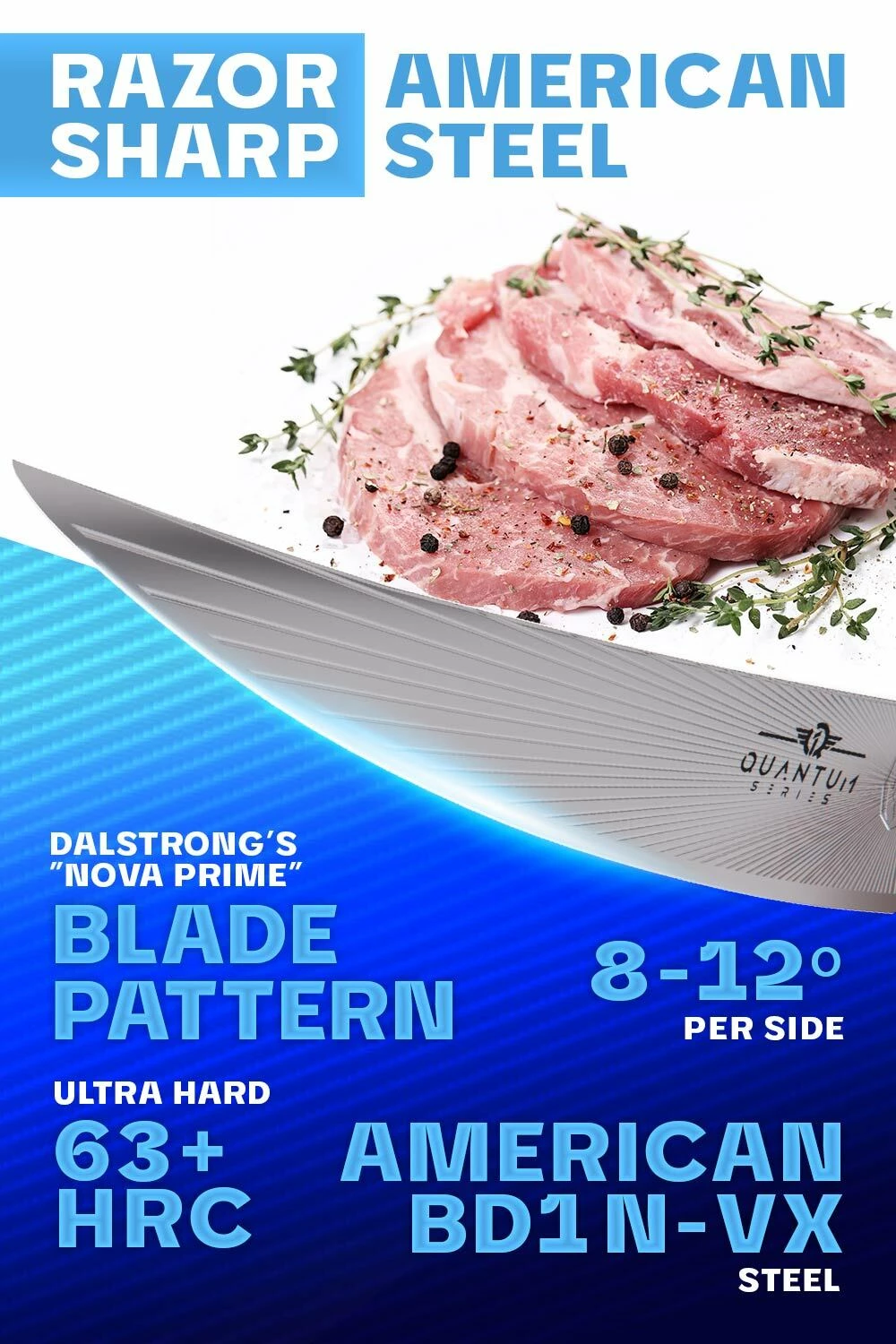 The future is here. This is the start to a new beginning, and you’ve taken the very first step by joining the culinary revolution with your Dalstrong Quantum 1 Series knife – A knife meticulously crafted and proudly engineered for exceptional performance, and painstakingly hand sharpened by expert bladesmiths. Carefully designed to withstand the harsh environments of today’s modern kitchen, the Quantum 1 Series knife is the epitome of culinary magnificence. Boasting extra-durable, ultra-sharp BD1N-VX steel that is uniquely designed with our Nova Prime blade pattern that reduced drag and increases efficiency, the focal point of the Quantum 1 Series has always been effortless prep that will leave you wanting more. Complete with a Dragon Skin G10-carbon fibre handle, The Quantum 1 Series knives is ushering in a new era of culinary adventure with you in total control.