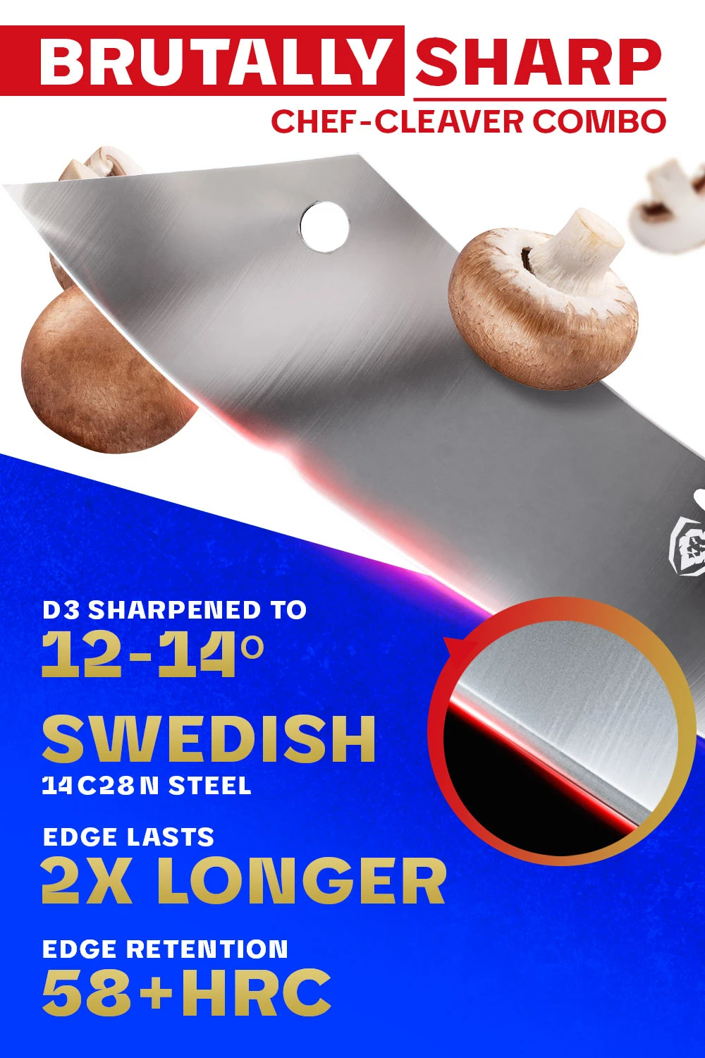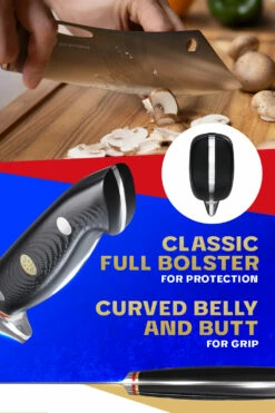 - Unique hybrid chef-cleaver combo blade shape