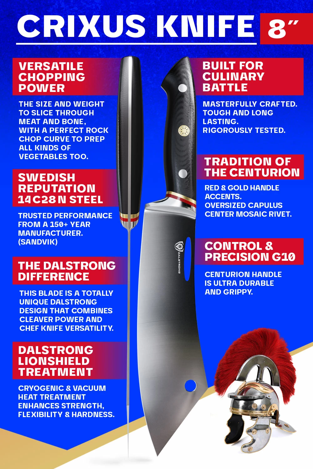 At it’s height, the Roman Empire was the most extensive political and social structure in western civilization, stretching over 5,000 km of territory. Leading its expansion were the noble but ruthless Centurions. Strong, agile, balanced, and always ready to execute the task at hand — these are just a few of the attributes that determined whether a soldier was chosen, and were contemplated heavily in the crafting of this regal knife series. Command your kitchen effortlessly with the strength and sharpness of high-carbon Swedish steel, rated at 58+ Rockwell hardness for impressive cutting prowess. Hand-sharpened to 12-14 degrees, you can slice through every obstacle with the might of 80 trained soldiers.