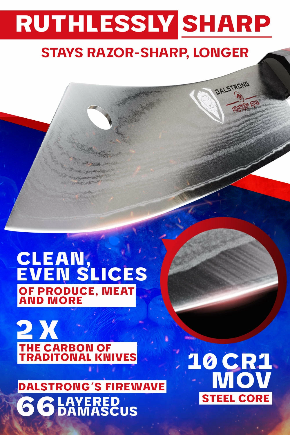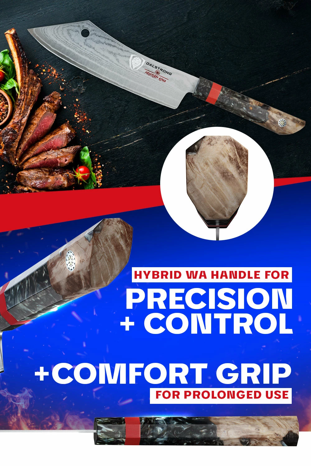 The Firestorm Alpha series Crixus is a specialty blade unique to Dalstrong, designed for meat lovers and BBQ enthusiasts. Part chef knife, part cleaver, this hybrid is the go-to tool of choice for those who prepare a lot of meat, especially from start to finish. This blade has the size and weight to slice through tough cuts of meat and bone, while still being maneuverable and versatile enough to wield through the rest of your prep work as well.