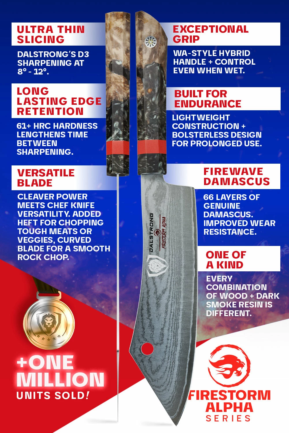 - Laser-etched Dalstrong and Firestorm marks with engraved lionhead logo