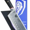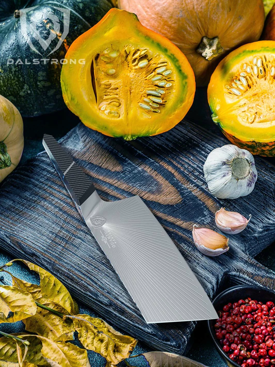 The best cleavers are synonymous with resilience, holding a razor-sharp cutting edge that fails to chip, buckle or roll, even when subject to rigorous chopping. Built on the most advanced knife technology available, the Quantum 1 Series 7″ Cleaver Knife makes quick work of boneless meats, poultry, vegetables, and fruits. Forged of ultra premium, American-made BD1N-VX hyper-steel, this space-age blade is vacuum heat-treated to achieve 63+ Rockwell Hardness. The blade’s nitrogen treatment enhances the knife’s flexibility and durability for extreme precision and control, while the laminated “Nova Prime” pattern reduces drag and enhances agility. Painstakingly honed to 8-12 degrees, the knife’s edge will chop through meat, vegetables at warp speeds with remarkable ease. To ensure optimum maneuverability on every culinary expedition, the Dragon Skin G10-carbon fibre handle adds sleek style and ergonomic handling, while remaining nearly impervious to the galactic rigors of heat, cold, and moisture. Enjoy its exceptional reliability and grip for effortless prep that will leave your taste buds ready to soar. Paired with the heavy-duty leather sheath with matching carbon fibre detailing and Dalstrong emblem, it will stay sharp and protected whether on the go or stashed away.