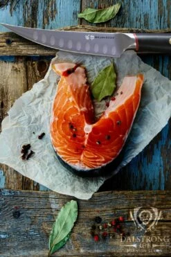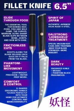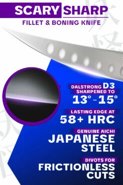 The Phantom Series 6.5” Fillet & Boning Knife is the essential tool for boning beef, pork, fish and wild game. The knife’s curved, narrow and ultra sharp blade gets in close to the bone and in between joints and skin with ease, while the hollow divots ensure minimal drag and reduced friction. Featuring Japanese AUS-8 steel beautifully engraved with the Dalstrong name down the spine as well as the Japanese kanji for ‘phantom’ or ‘ghost’. Each blade is painstakingly hand sharpened using the traditional honbazuke method, bringing the edge to a razor sharp 13-15 degrees, ensuring swift, effortless cuts. A premium-quality polymer Dalstrong saya (sheath) is included.