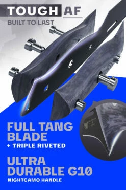 Crafted for the long haul, the onyx-black Titanium Nitride coating reduces friction and adds an extra layer of protection against corrosion. The groove near the spine of the knife lightens the blade and enhances agility, so you can keep chopping and carving with speed. While the blade might be extra nimble, the camouflage G10 handle is reassuringly robust, adding the rugged style and stability you need to move with confidence through every kitchen. Triple-riveted with a triangular, multi-purpose loop on the pommel, you can display the knife magnificently on a kitchen peg or hook. Included leather sheath with snap closure protects your blade on the go.
