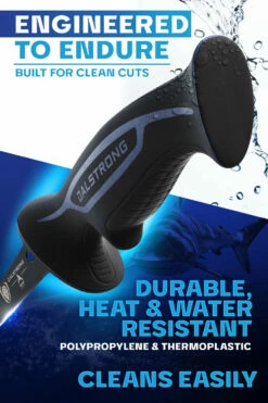 Serious high-tech went into the Night Shark handle. Two incredibly durable, heat resistant plastics are contoured into this super comfortable, ergonomic, textured handle. It feels rough like shark skin, clinging to your palm even when wet. A deep index finger “choil” divot means your grip will never falter. And despite all that texture and shape, it’s still one of the most stain-resistant and easy to clean surfaces technology can provide. A fierce blue streak runs through the otherwise matte black handle.