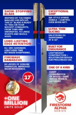 Fierce in presence, stunning in sophistication. The Firestorm Alpha Helios Chef Slicer pulls inspiration from the famed maguro kiri bōchō to bring the storied history of ultra-specialized Japanese cutlery traditions to your kitchen.