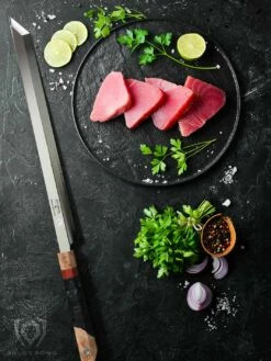 It is both a powerful tool and a breathtaking centerpiece. The impressive but still manageable 17” single-bevel blade with solid AUS-10V Japanese steel is ready to take on your biggest conquests — from tuna and swordfish to large roasts and whole hogs. Experience effortless, ultra-thin slicing with a hand-sharpened, 20° angle blade, while the traditional Japanese octagon handle lets you get the firm, two-handed grip to strike and slice with a single stroke.