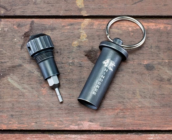 This pocket size kit is a complete disassembly tool. It includes a built in spanner wrench, which makes it very easy to hold both the wrench and the knife at the same time while making pivot adjustments. The head unscrews from the main body, which contains a precisely machined screw driver blade that matches the slot on the pivot screw of most all of Rick Hinderer Knives folder pivot screws. The head will also hold any standard 1/4″ bit. We include a 5/64″ hex that works on the XM-18 3.5″ & XM-24 handle screws. For use with Torx and other sized hex drives on our other models you may purchase that corosponding bit from any online or regular hardware store. The crossed drilled hole in the male end is there so you can use it as a “T” handle for extra torque. These are made from 17-4 PH hardened stainless steel with a variety of finishes.