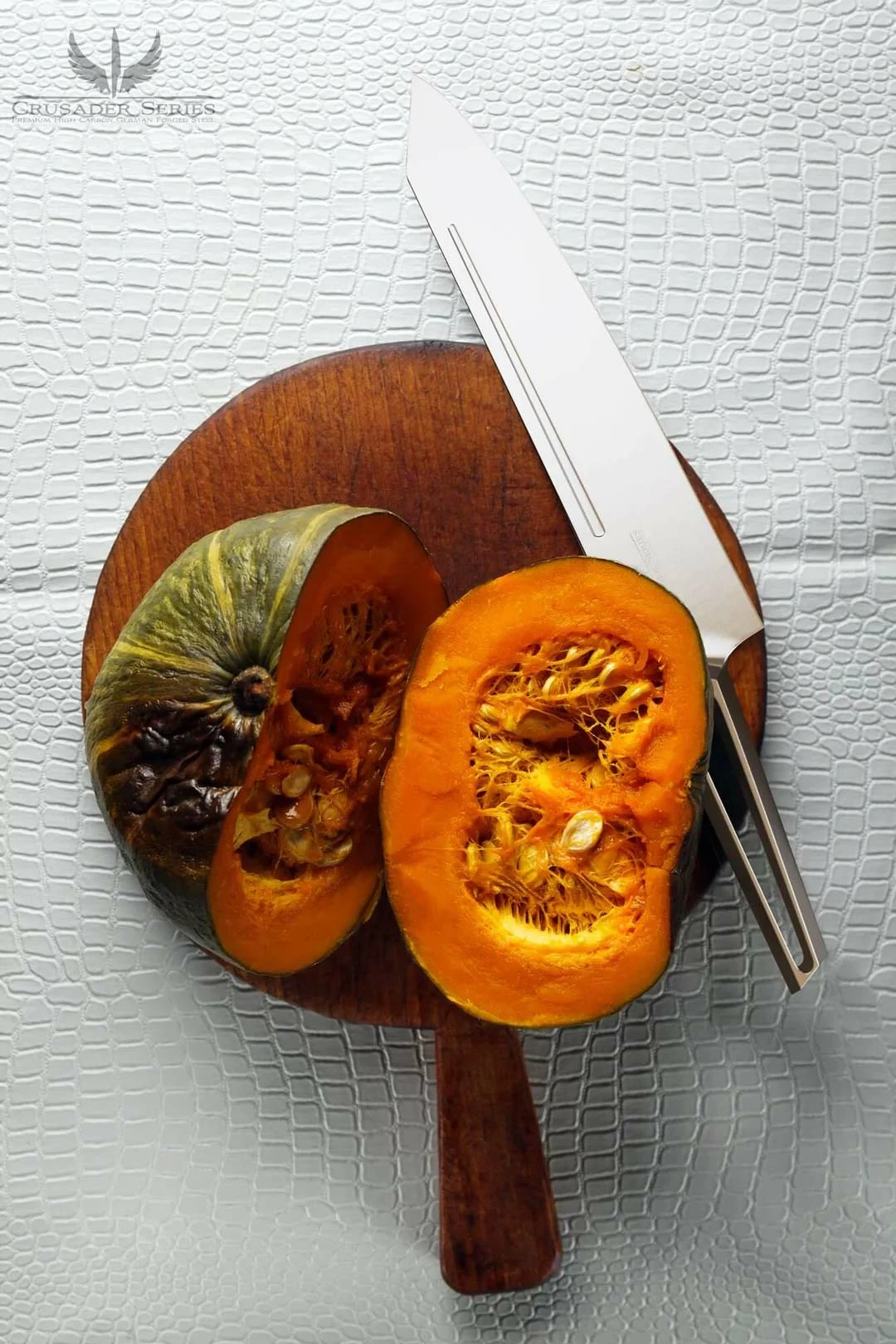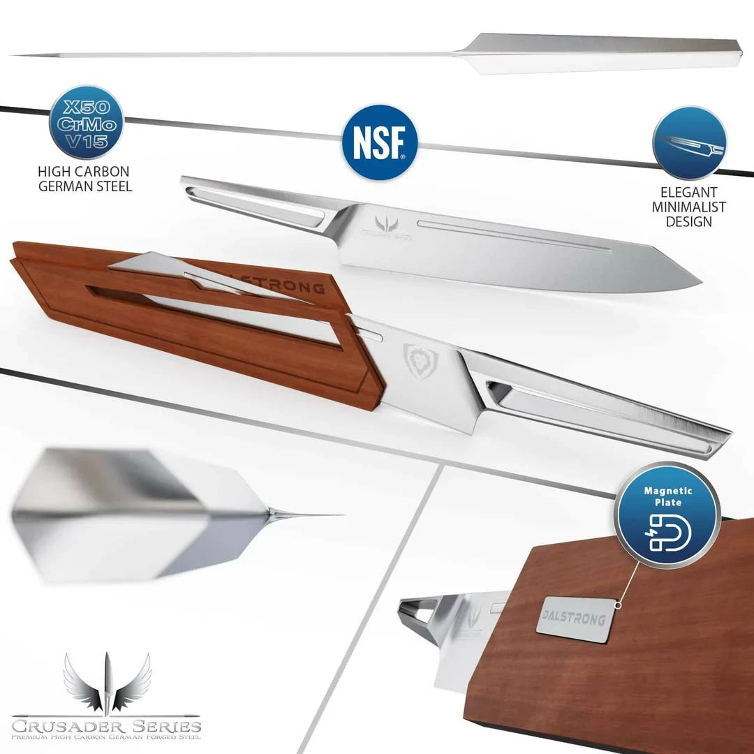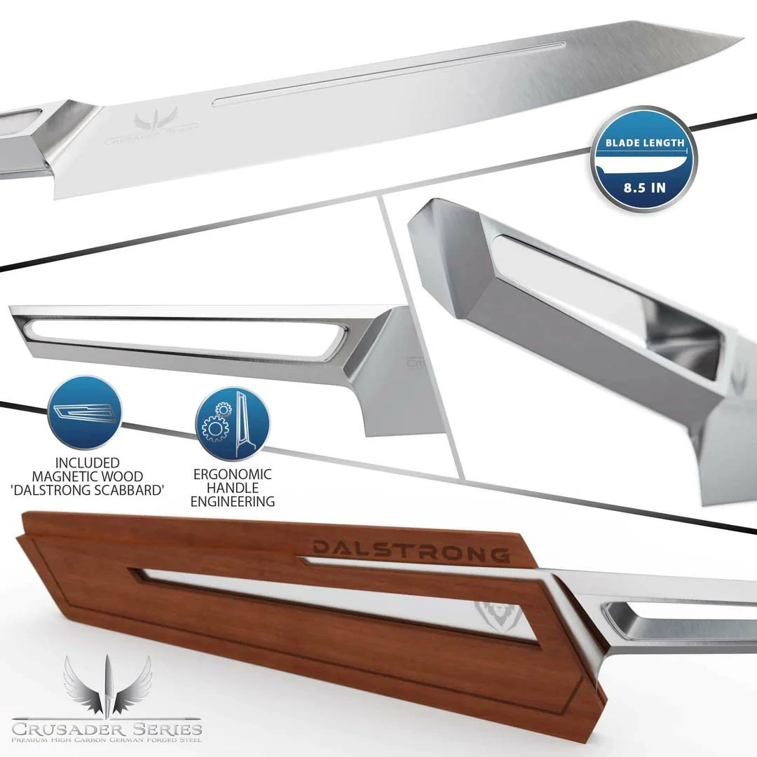 The Dalstrong Crusader Series is a new collection of stunningly designed, all-steel knives, offering a minimalist aesthetic with unobtrusive beauty. The less is more approach to this series’ design ensures a perfect pairing with any decor, while the razor sharp German made ThyssenKrupp x50crmov15 blade steel at 58+ Rockwell delivers exceptional performance. A seamless and hygienic transition from the blade to a high-chromium stainless steel handle characterizes the knives with an aggressive, forward moving stance. The sharply drawn lines forming the profile of each knife are indicative of modern design, while the ‘fuller’ groove machined into every blade is reminiscent of historical medieval swords, welding the past and present together. The stylized groove along the knife offers the added benefits of reducing friction and stuck on food, while also subtly lightening the knife and improving balance.