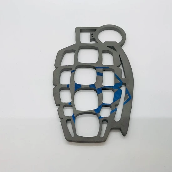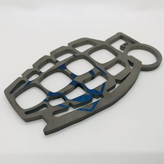 Medford Grenuckle All Titanium Gray Knuckles “Paperweight” with Blue MKT Logo Laser. The Medford Grenuckles takes the utility task and makes it cool with US sourced 6Al4V titanium. The Grenuckels are nice and light and handy to open bottles. And if somebody just so happens to ‘pull your pin’, you can explode with a fistful of some retro looking, aerospace material!