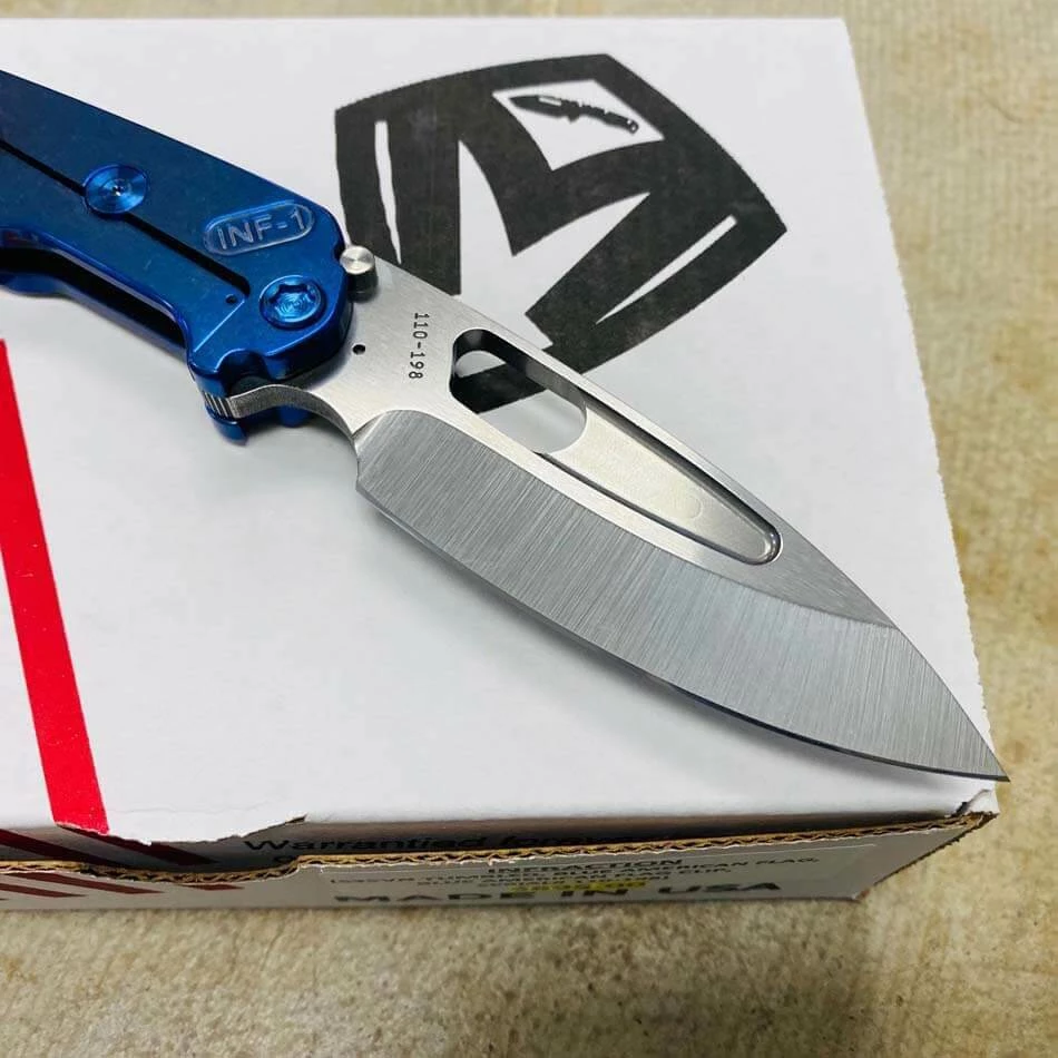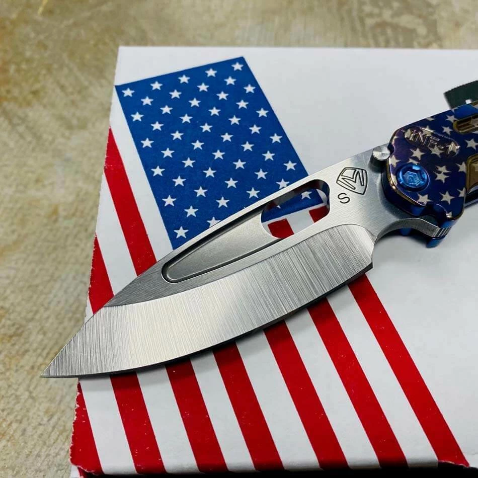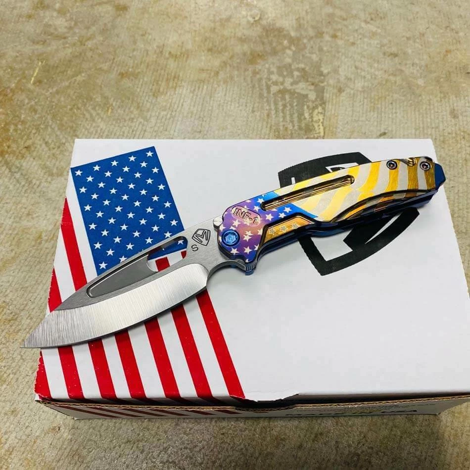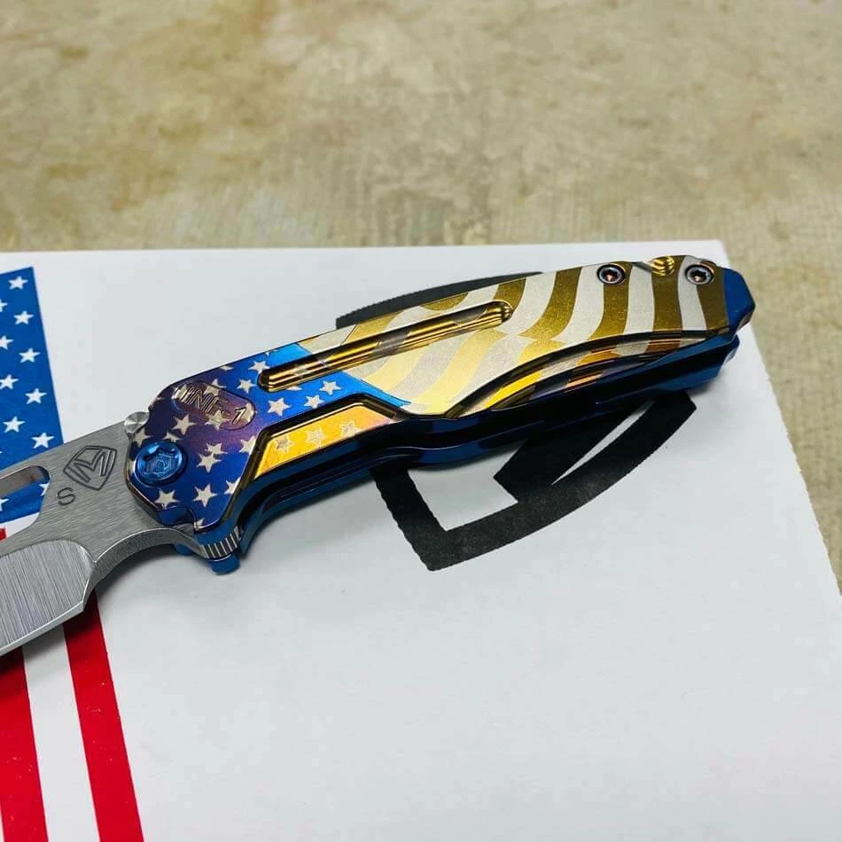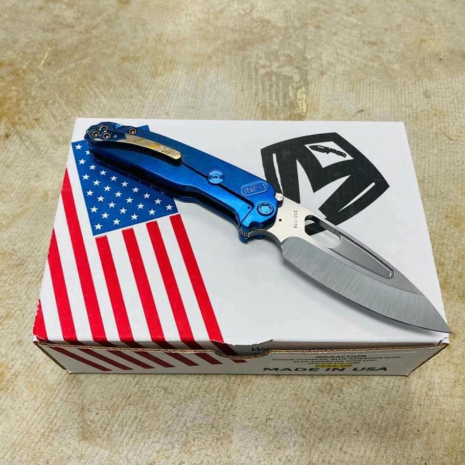 Medford Infraction S35VN tumbled blade, Blue American flag handles, blue hardware, blue flag clip, NP3 breaker. For those of you that find a full-sized pocket knife a bit cumbersome, we developed this rocket ship just for you. In Stock in Houston Texas!