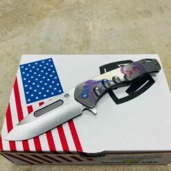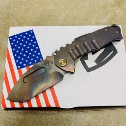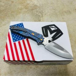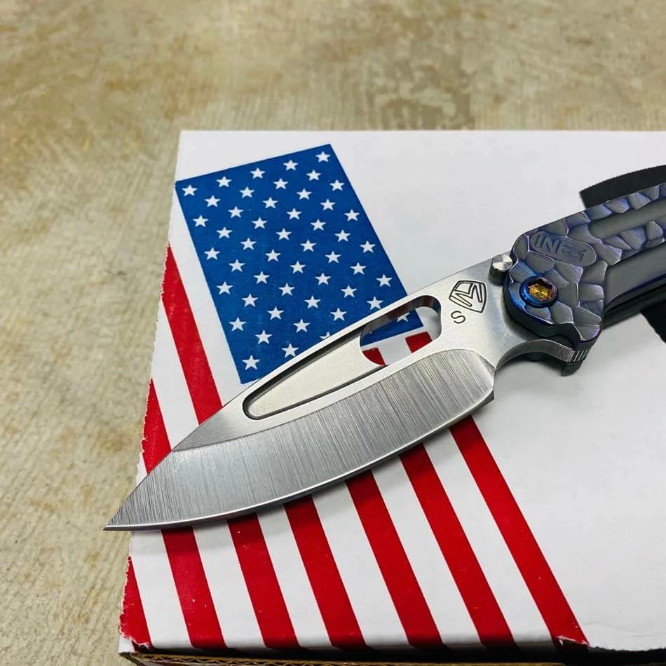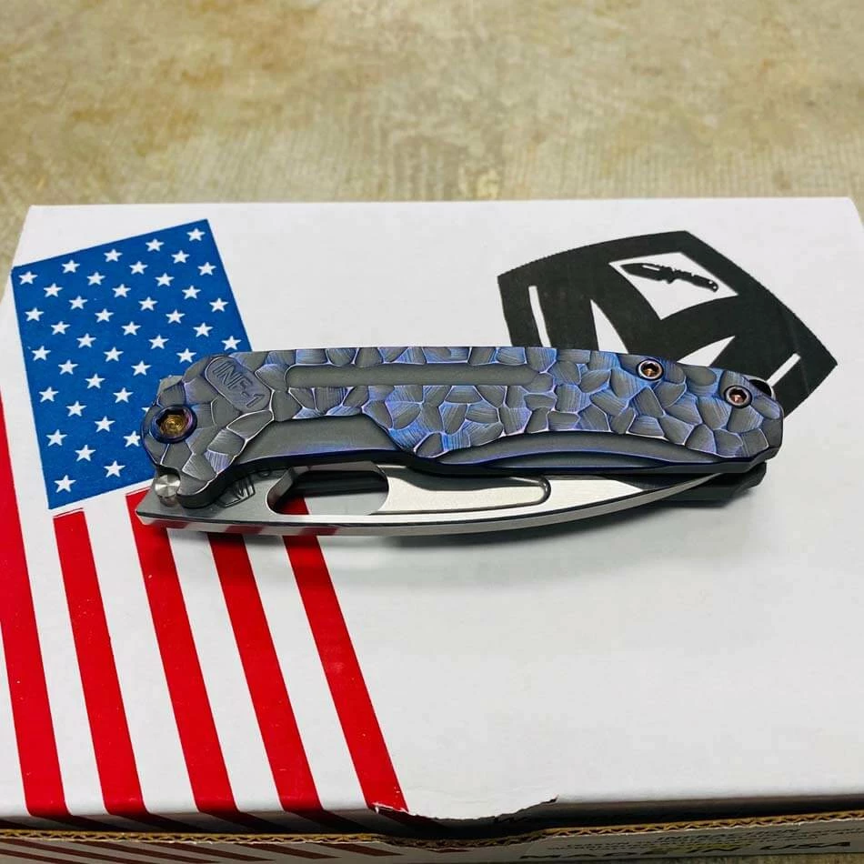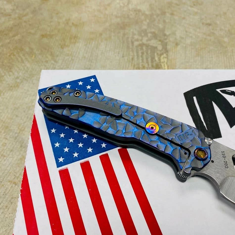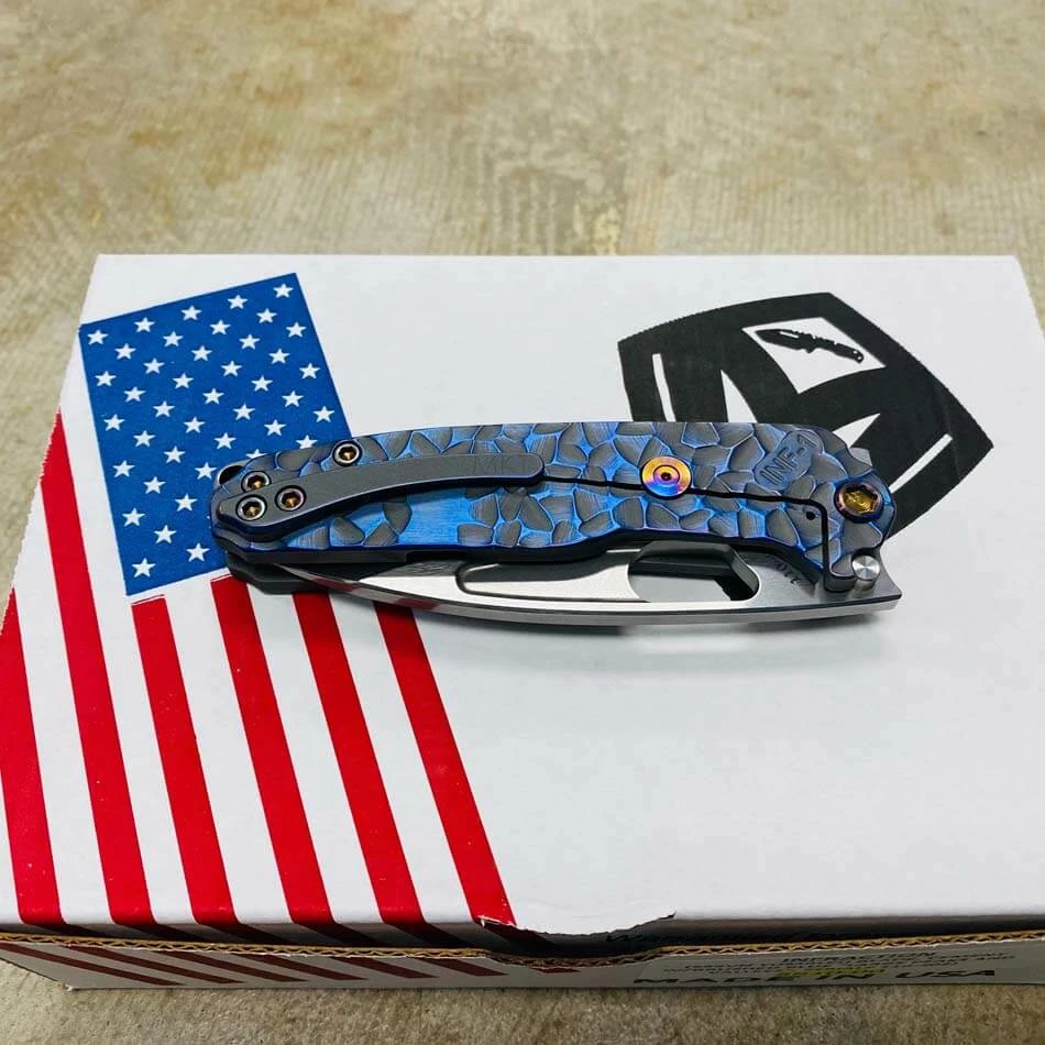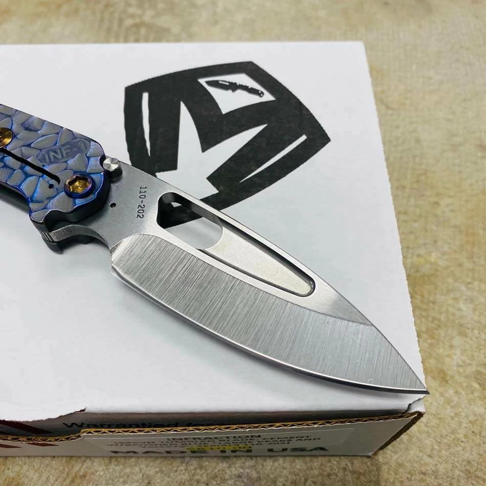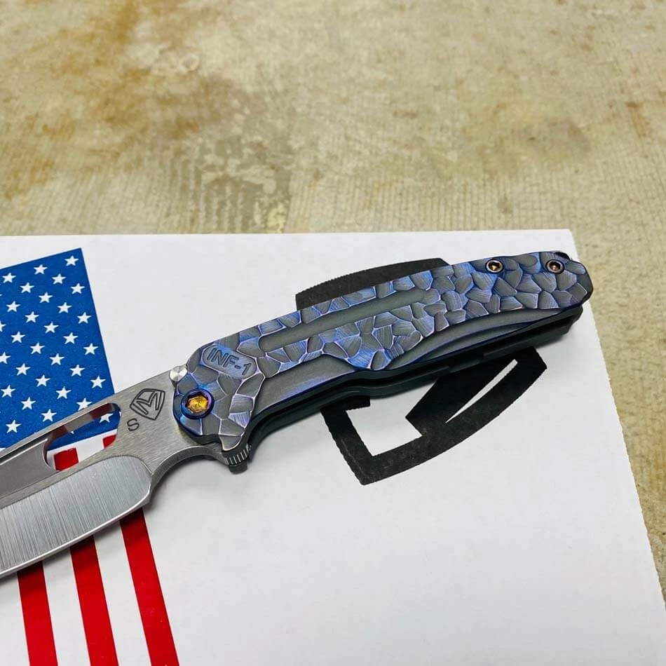 Medford Infraction S35VN tumbled blade, cement with brushed blue large peaks and valleys handles, flamed hardware, brushed flamed clip. For those of you that find a full-sized pocket knife a bit cumbersome, we developed this rocket ship just for you. In Stock in Houston Texas!