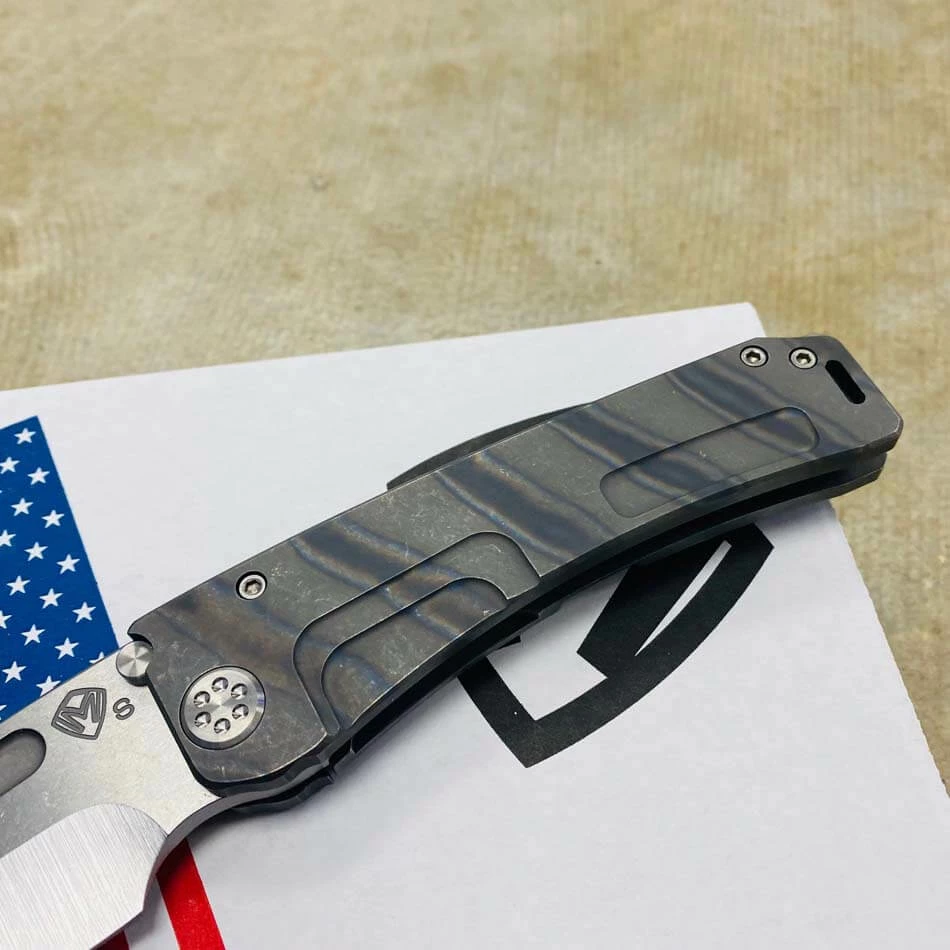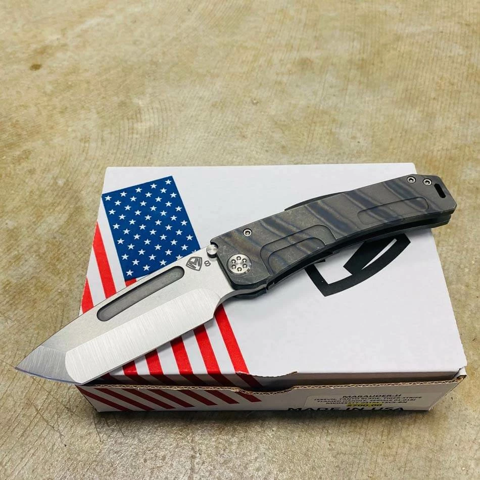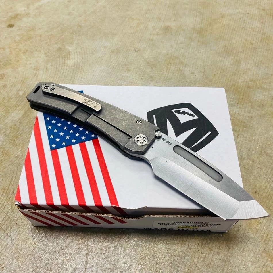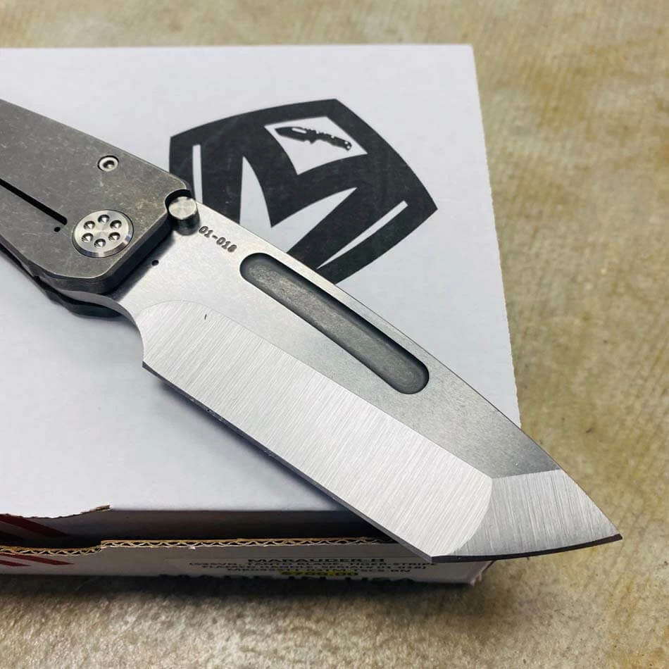 This Marauder H has 3V PVD blade, PVD spring, PVD Handle, PVD glass breaker, stainless steel hardware and clip. The Marauder is a mean design that utilizes the awesome tip strength of the Flat-Grind and the tried and true performance of a Hollow-Ground main cutting edge. This Combo ground knife has a function driven form that is unique in the knife world. The clean lines of the knife are self-evident, and, in this case, less is more. Note the curved Fuller-groove that doubles to not only lighten the forward weight of the design but also as a sneaky thumb-slide groove for opening. The sides are Titanium and the blade is 0.19″ thick. This design gets its name from the A-26 Marauder of WW II repute. The Marauder was known for awesome fire-power and brute force toughness in battle. A great moniker.