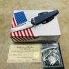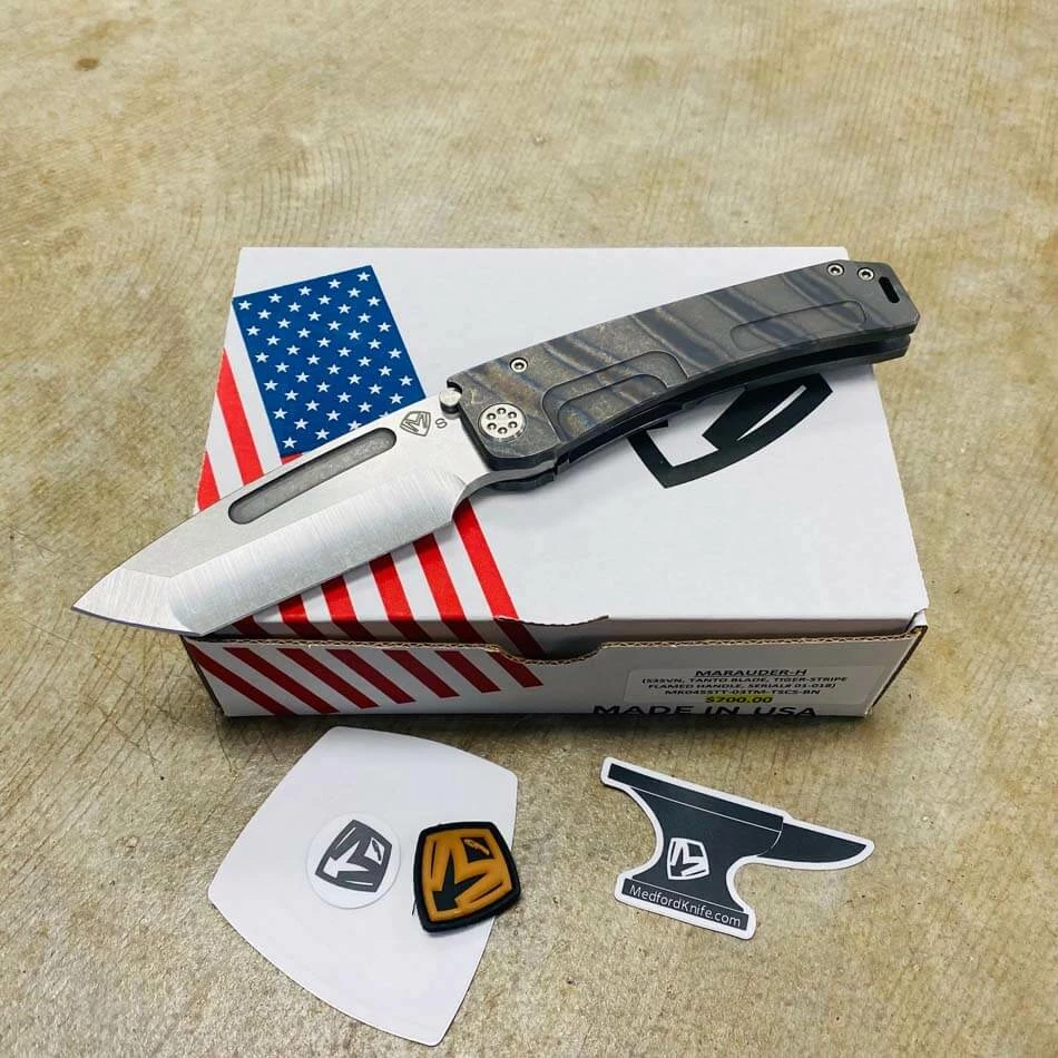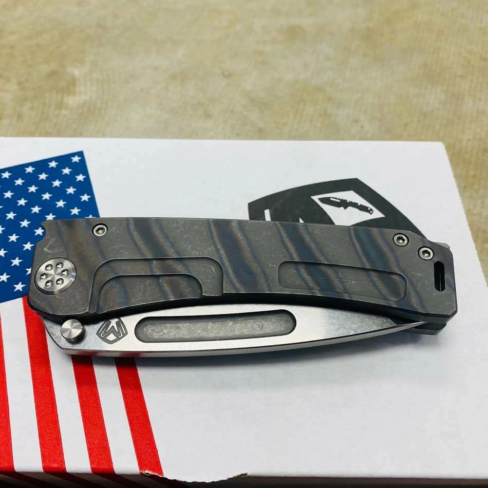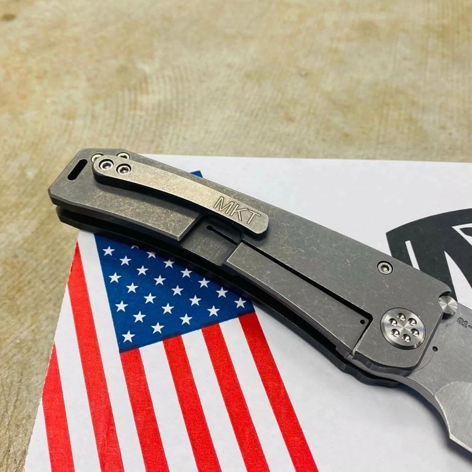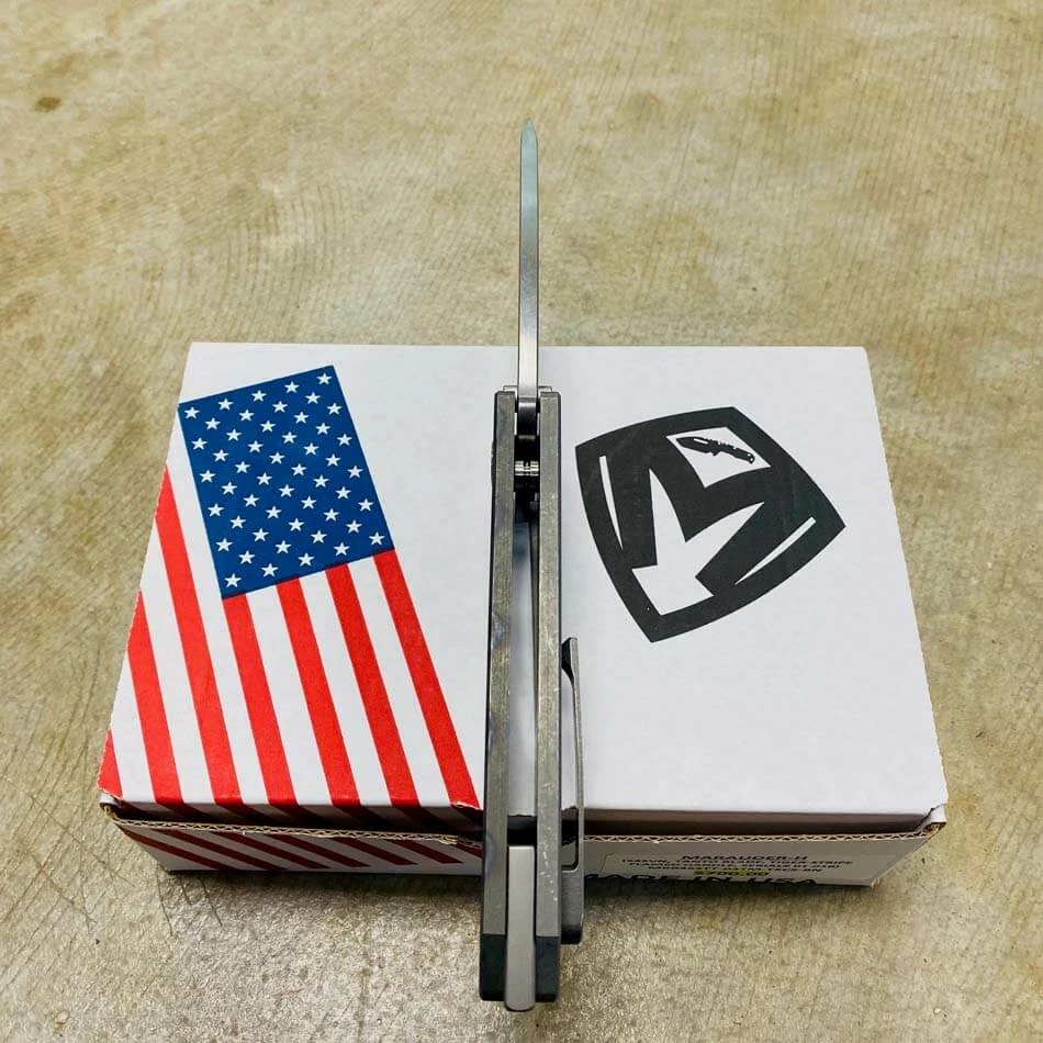 This Marauder H has 3V PVD blade, PVD spring, PVD Handle, PVD glass breaker, stainless steel hardware and clip. The Marauder is a mean design that utilizes the awesome tip strength of the Flat-Grind and the tried and true performance of a Hollow-Ground main cutting edge. This Combo ground knife has a function driven form that is unique in the knife world. The clean lines of the knife are self-evident, and, in this case, less is more. Note the curved Fuller-groove that doubles to not only lighten the forward weight of the design but also as a sneaky thumb-slide groove for opening. The sides are Titanium and the blade is 0.19″ thick. This design gets its name from the A-26 Marauder of WW II repute. The Marauder was known for awesome fire-power and brute force toughness in battle. A great moniker.