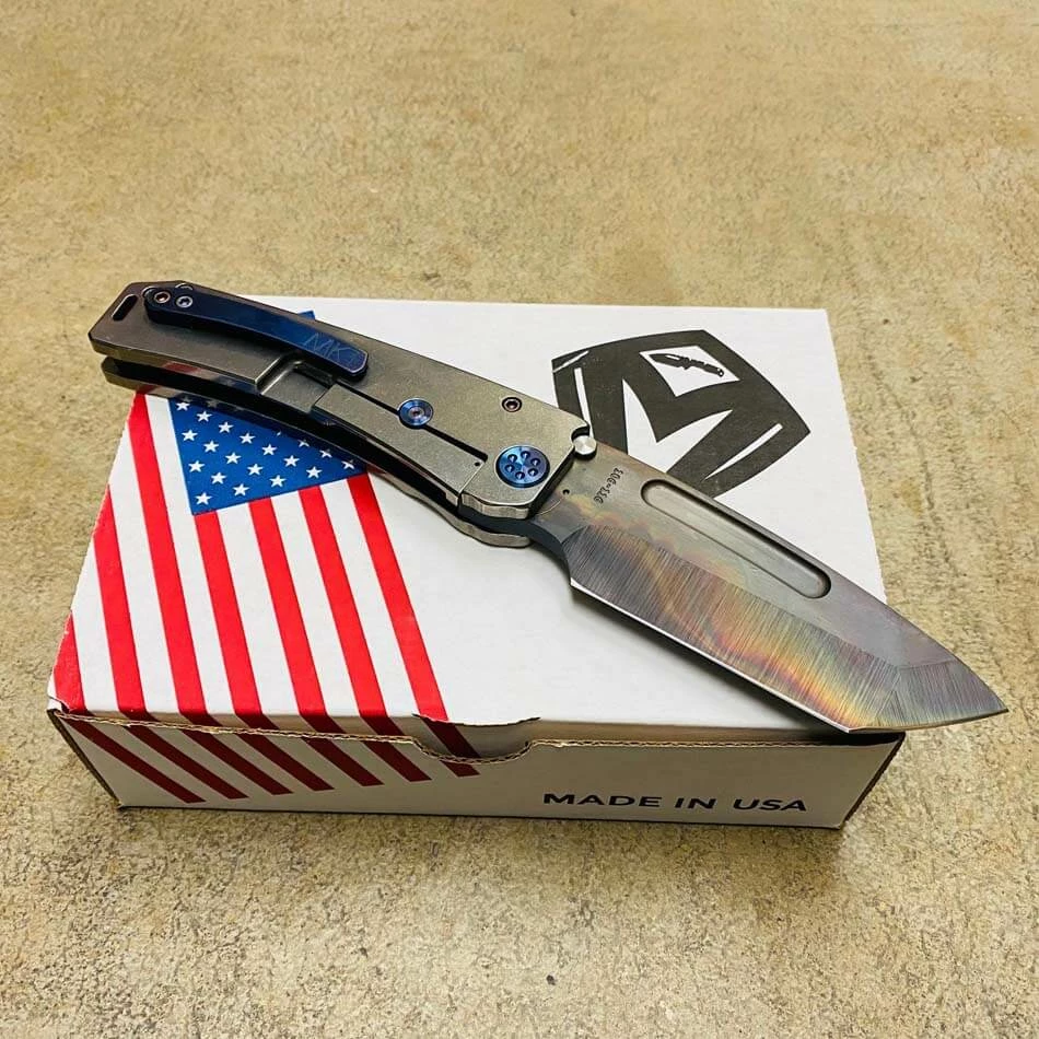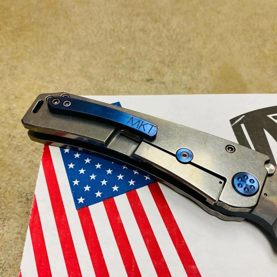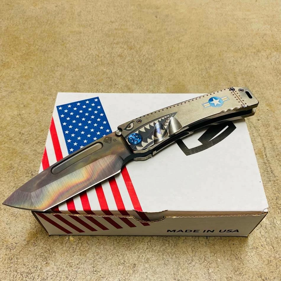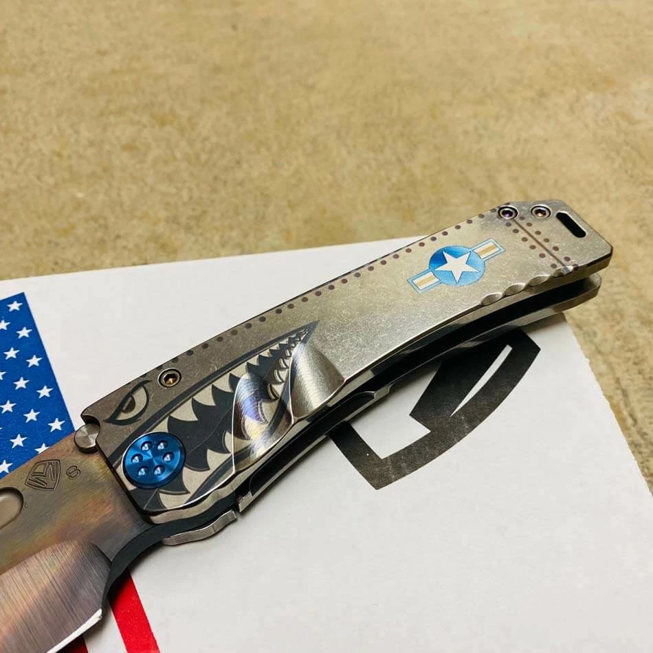The Marauder is a mean design that utilizes the awesome tip strength of the Flat-Grind and the tried and true performance of a Hollow-Ground main cutting edge. This Combo ground knife has a function driven form that is unique in the knife world. The clean lines of the knife are self-evident, and, in this case, less is more. Note the curved Fuller-groove that doubles to not only lighten the forward weight of the design but also as a sneaky thumb-slide groove for opening. The sides are .187″ Titanium and the blade is .260″ thick. This design gets its name from the A-26 Marauder of WW II repute. The Marauder was known for awesome fire-power and brute force toughness in battle. A great moniker.