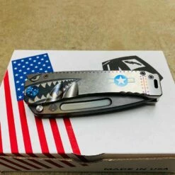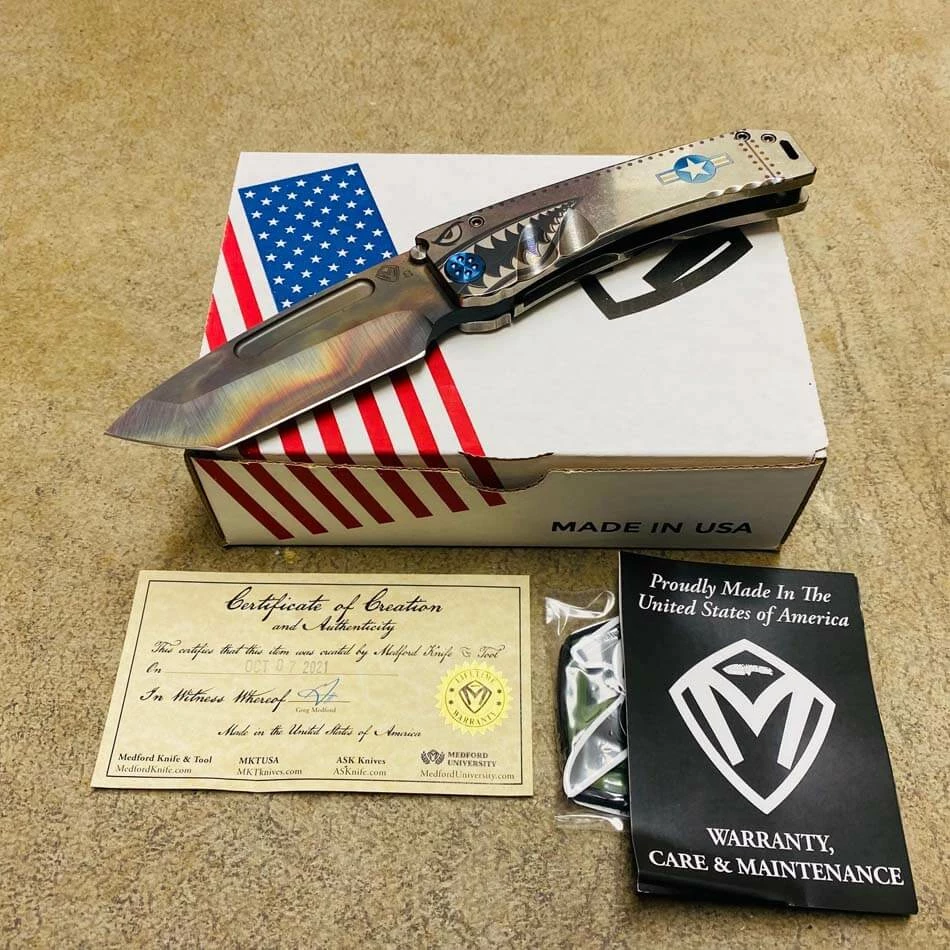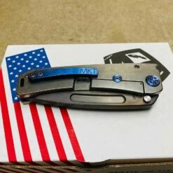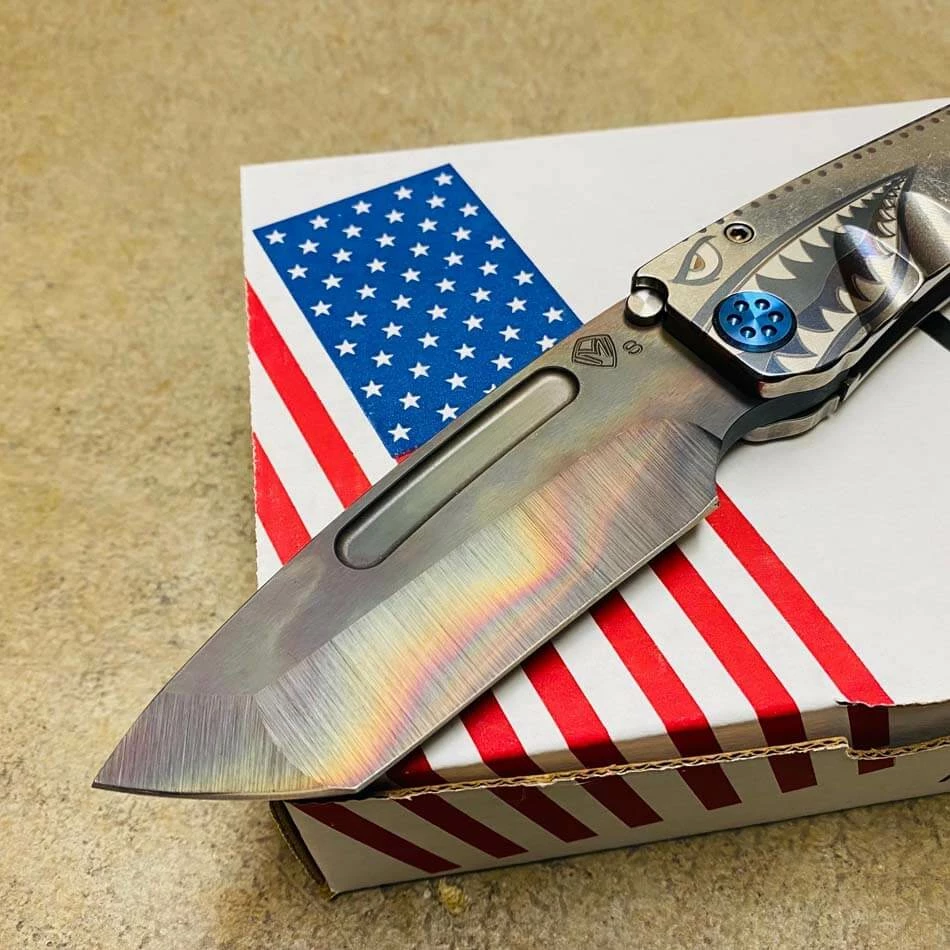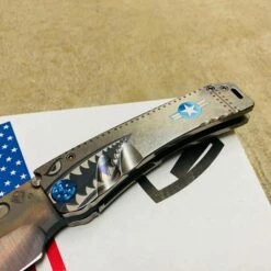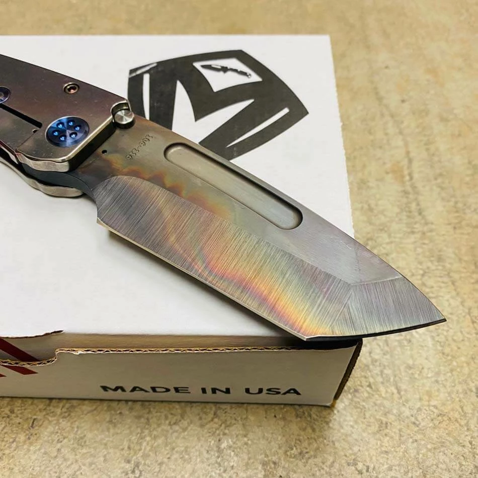 The Marauder is a mean design that utilizes the awesome tip strength of the Flat-Grind and the tried and true performance of a Hollow-Ground main cutting edge. This Combo ground knife has a function driven form that is unique in the knife world. The clean lines of the knife are self-evident, and, in this case, less is more. Note the curved Fuller-groove that doubles to not only lighten the forward weight of the design but also as a sneaky thumb-slide groove for opening. The sides are .187″ Titanium and the blade is .260″ thick. This design gets its name from the A-26 Marauder of WW II repute. The Marauder was known for awesome fire-power and brute force toughness in battle. A great moniker.