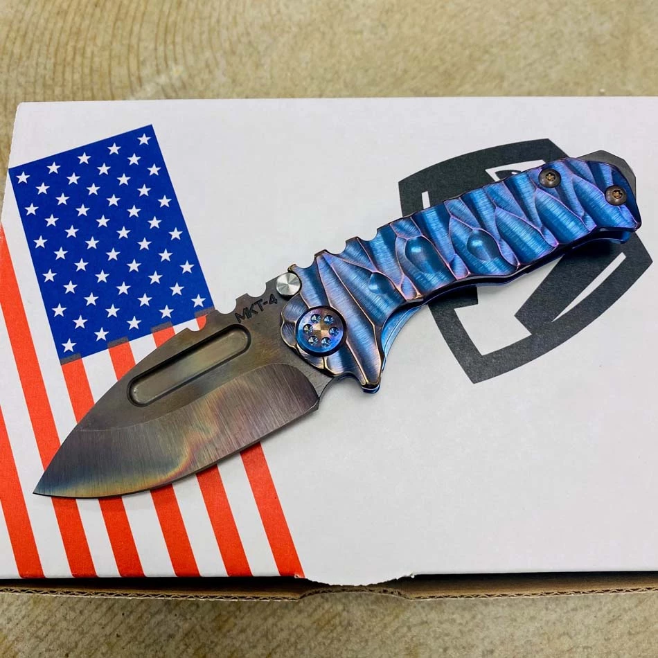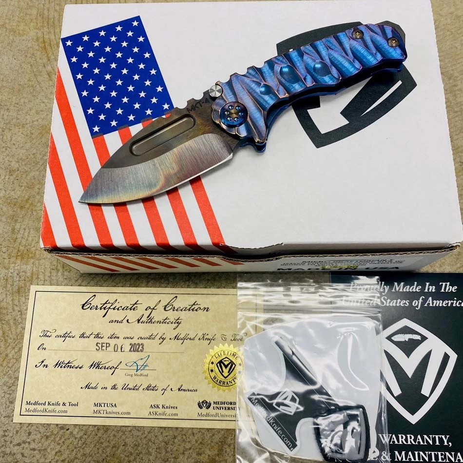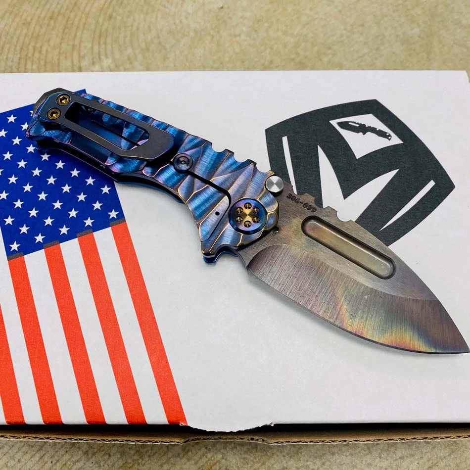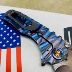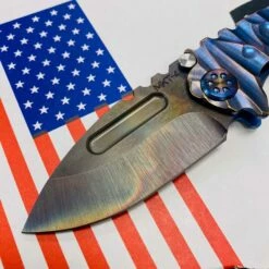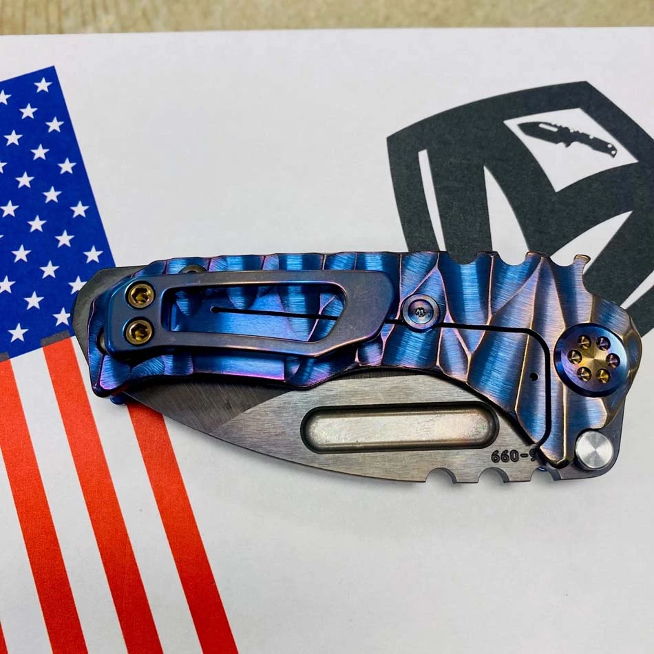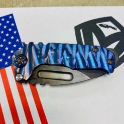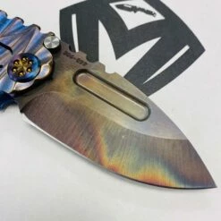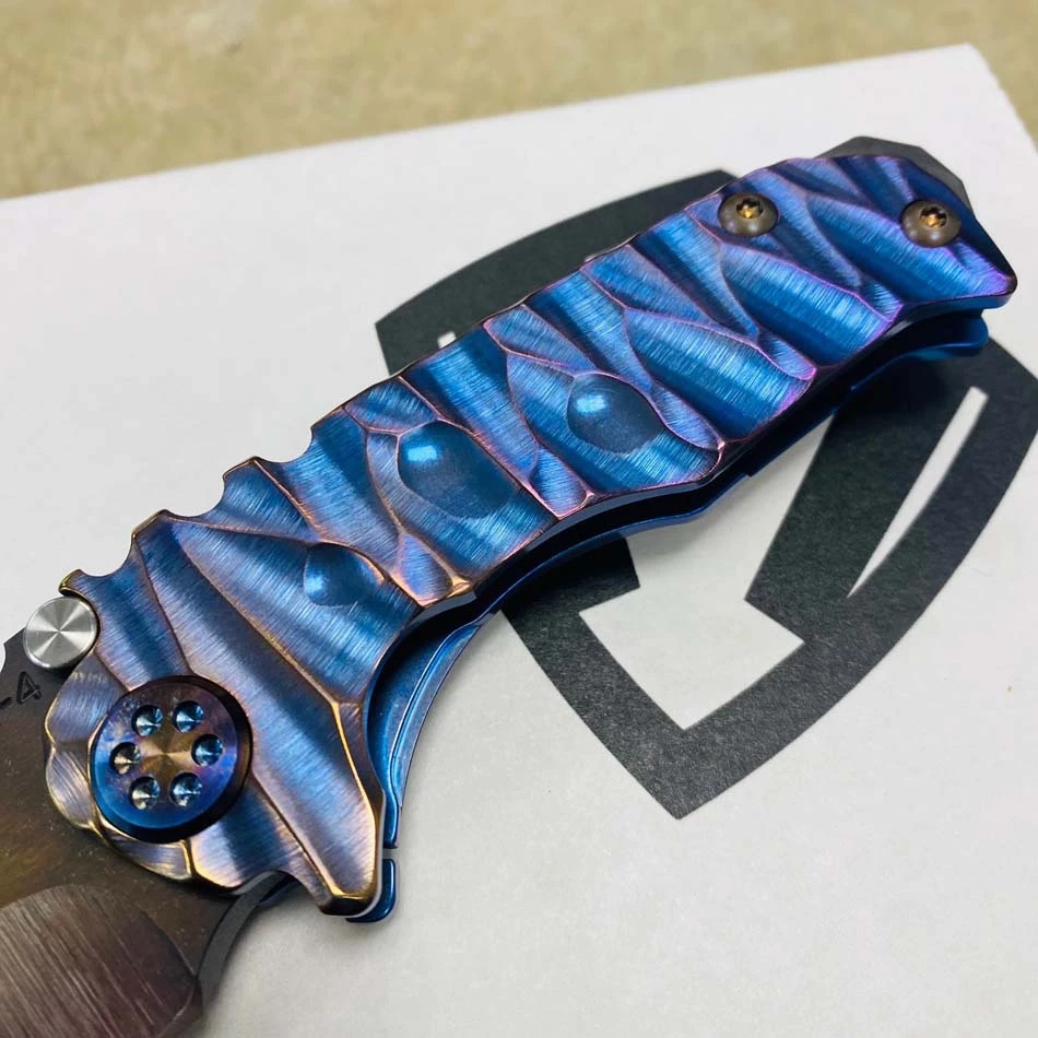 This sexy Medford Micro Praetorian T has an S35VN Vulcan drop point blade, blue with bronze to violet fade twisted predator handles, flamed hardware, flamed clip, PVD breaker. 2/3 the size of the standard sized Praetorian G/T, this chunky knife offers the same blade and scale thickness as its larger counterpart. You can slip this beefy little monster into smaller pockets, with the same nasty grip and punch of its big brother. So, if you’re looking for a smaller version of the Praetorian G/T you already own, or just want a smaller chunky folder, this knife is definitely for you!