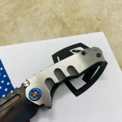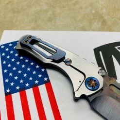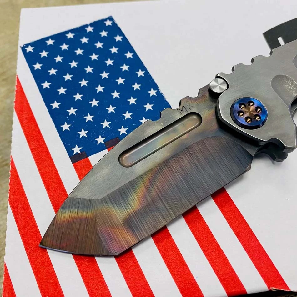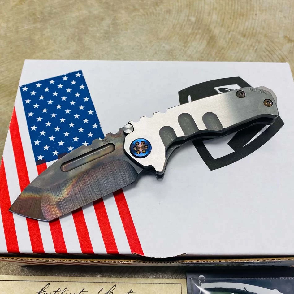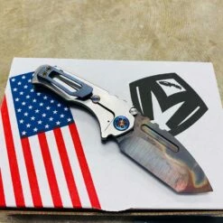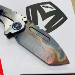 This sexy Medford Micro Praetorian T has an S35VN Vulcan blade with satin flats, faced silver handles, flamed hardware serial number 011-098 2/3 the size of the standard sized Praetorian G/T, this chunky knife offers the same blade and scale thickness as its larger counterpart. You can slip this beefy little monster into smaller pockets, with the same nasty grip and punch of its big brother. So, if you’re looking for a smaller version of the Praetorian G/T you already own, or just want a smaller chunky folder, this knife is definitely for you!