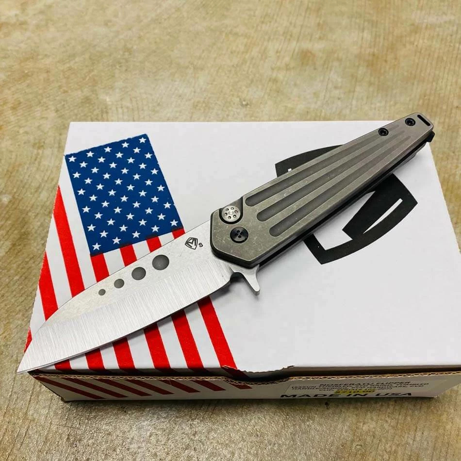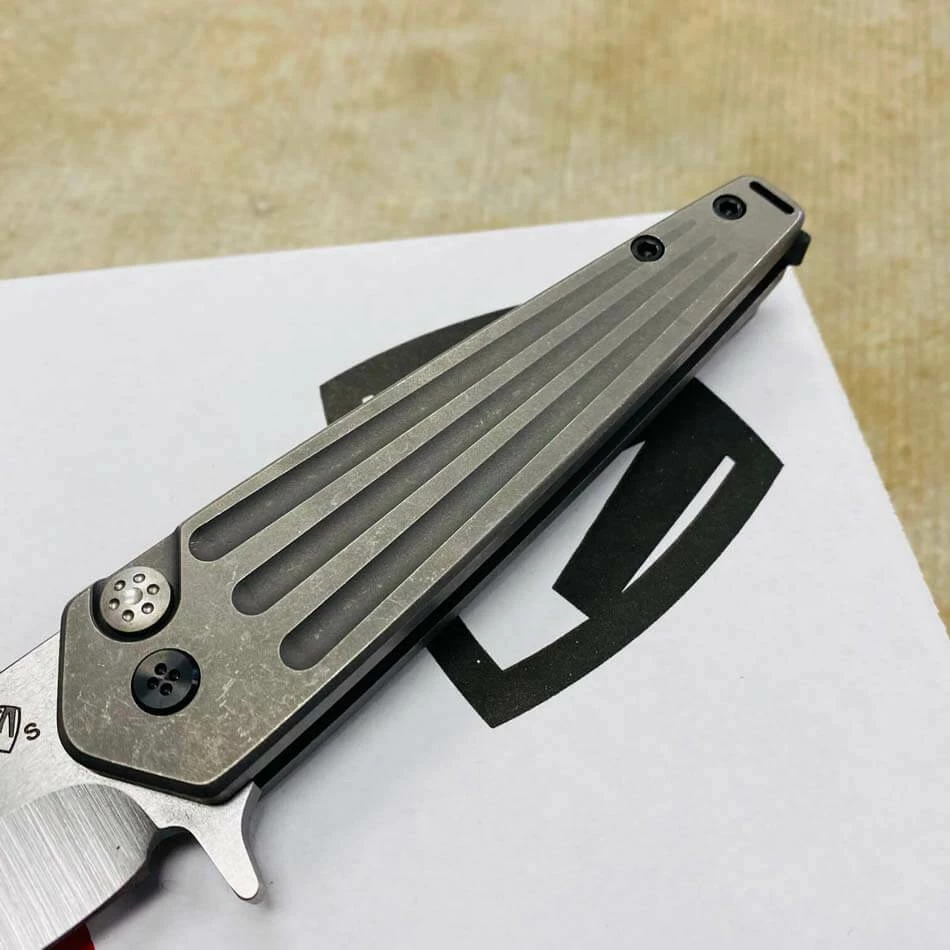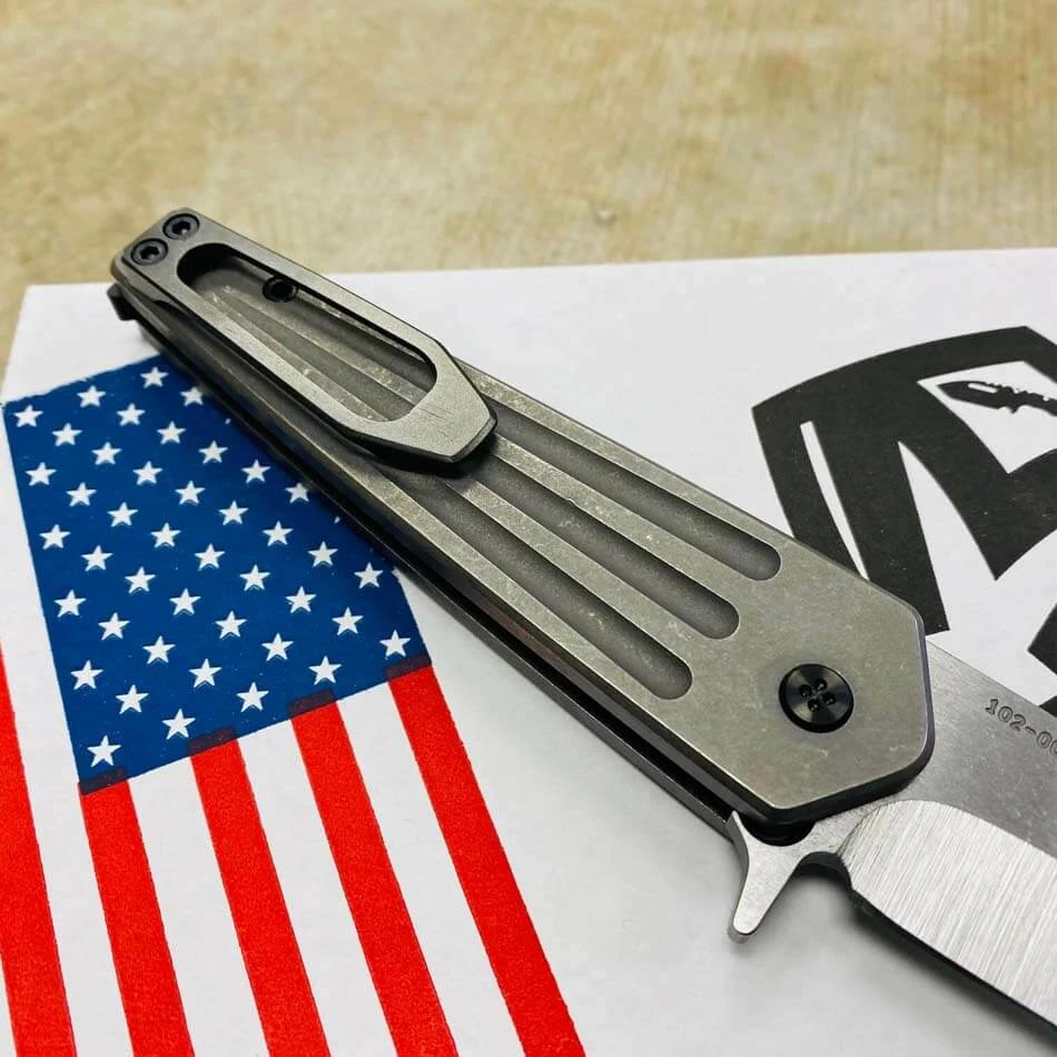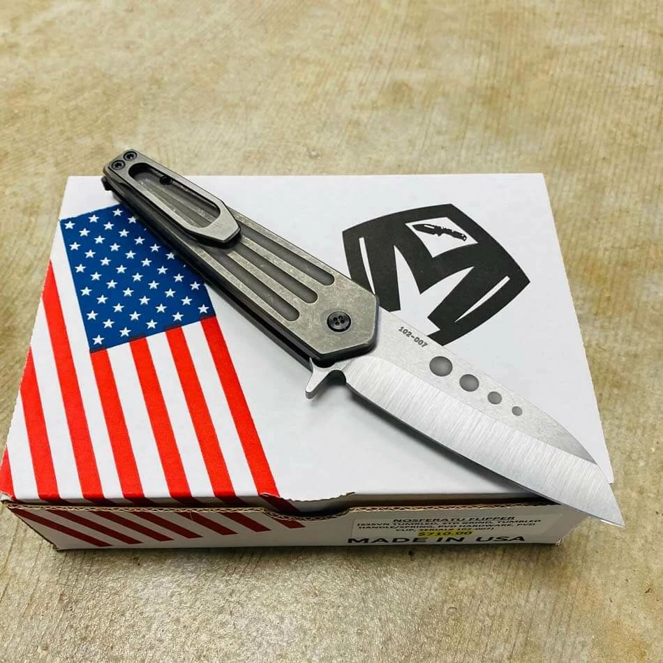 This one of a kind flipper is a hybrid of the Wharncliffe and Sheepsfoot design. Sporting an S35VN blade The Nosferatu Flipper is a more gentlemanly version of the Nosferauto.