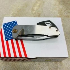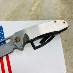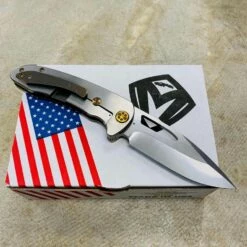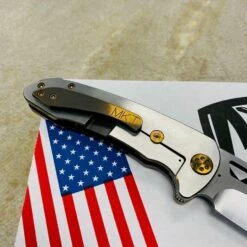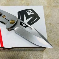 Medford MKT Knife and Tool On Belay S35Vn Tumbled blade, bronze violet with faced silver flats handles, violet bronze hardware and clip, NP3 breaker. Knife makers often lament that NAMING a new knife is the hardest part of making new knives! We agree, but not in this case! As the lines of this design came together, the prominent slotted back strap just screamed Mountain Climbing Gear and with Greg having spent some time hanging on a rope rappelling, the On Belay was born. The false edged drop-point blade is a beast and ready for whatever you have to offer. The thumb opening slot on the blade keeps the part-count down and besides the knife flips like it’s on ball bearings.