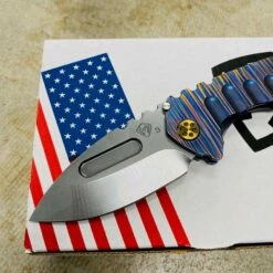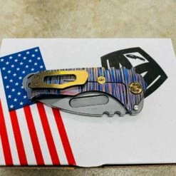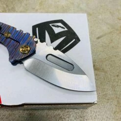 Medford Praetorian Genesis T 3V vulcan tanto, violet bronze dragon scale handles, flamed hardware, serial 105-128. The Knife was made in its current full size as a printing fluke as a novelty! Who knew it would take the knife world by storm? This was the predetermined size of the design. The Praetorian Genesis is for that “This one is too big, this one is too small” knife nut. The Praetorian Genesis is that middle ground that looks as bad-ass as ever but is still large enough for nearly anything. Limited Edition!