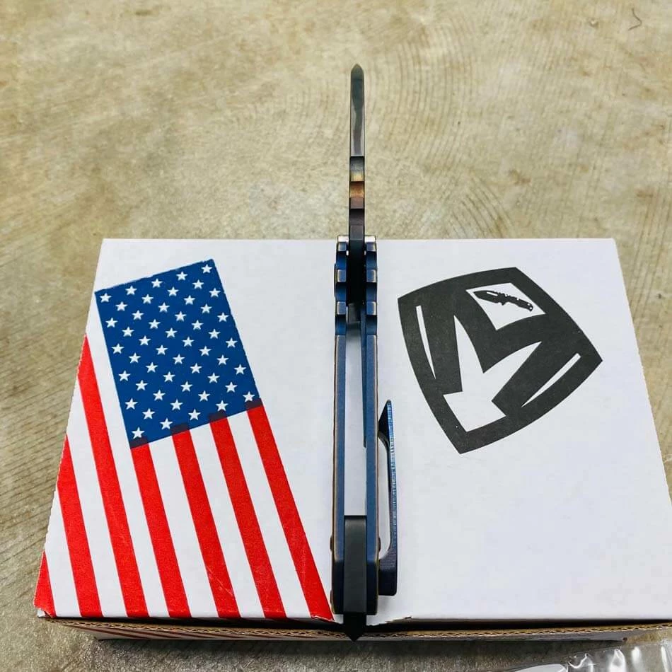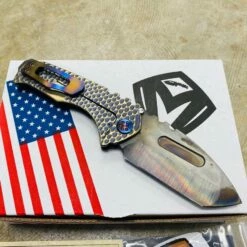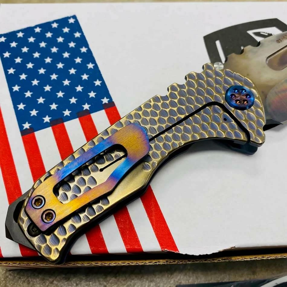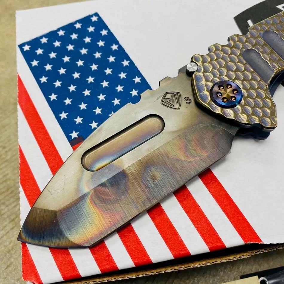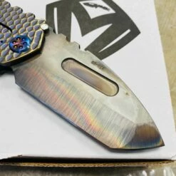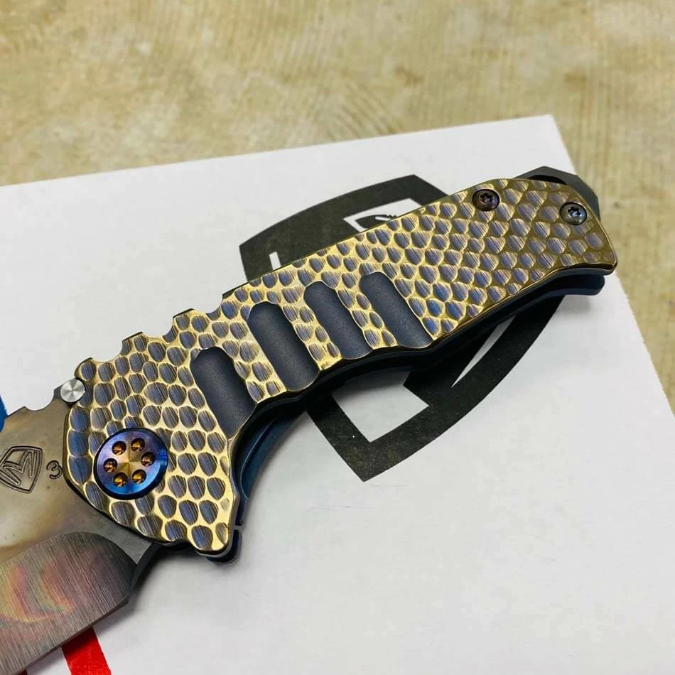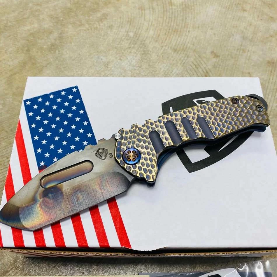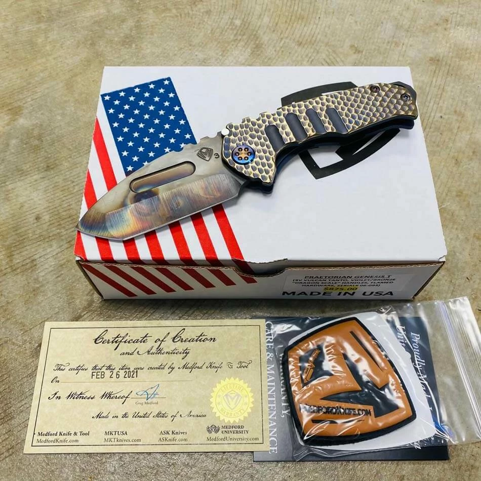 Medford Praetorian Genesis T 3V vulcan tanto, violet bronze dragon scale handles, flamed hardware, serial 06-093. The Knife was made in its current full size as a printing fluke as a novelty! Who knew it would take the knife world by storm? This was the predetermined size of the design. The Praetorian Genesis is for that “This one is too big, this one is too small” knife nut. The Praetorian Genesis is that middle ground that looks as bad-ass as ever but is still large enough for nearly anything. Limited Edition!