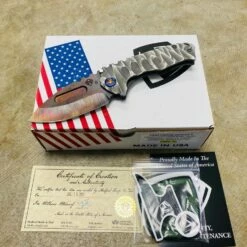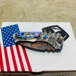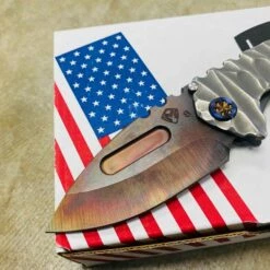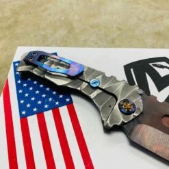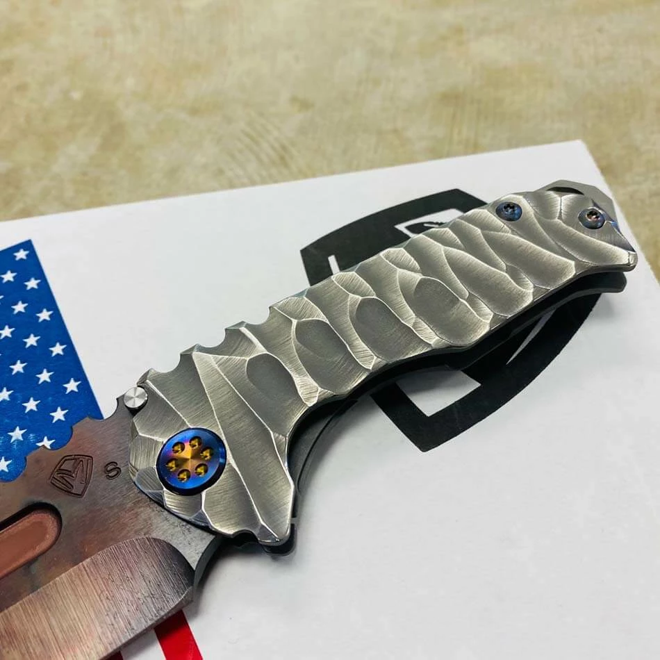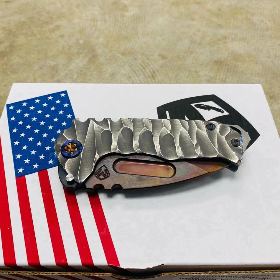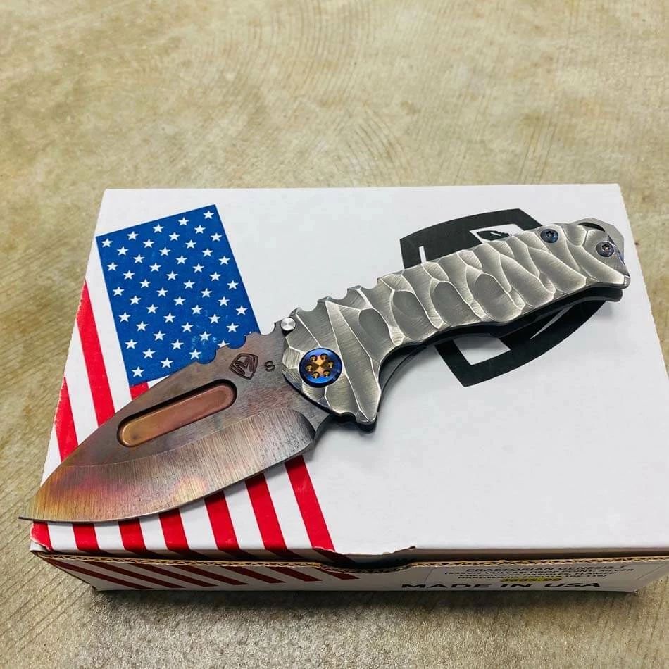 This sexy Medford Praetorian T has an S35VN Vulcan blade, silver predator handles, flamed hardware serial number 105-116. You can slip this beefy little monster into smaller pockets, with the same nasty grip and punch of its big brother.
