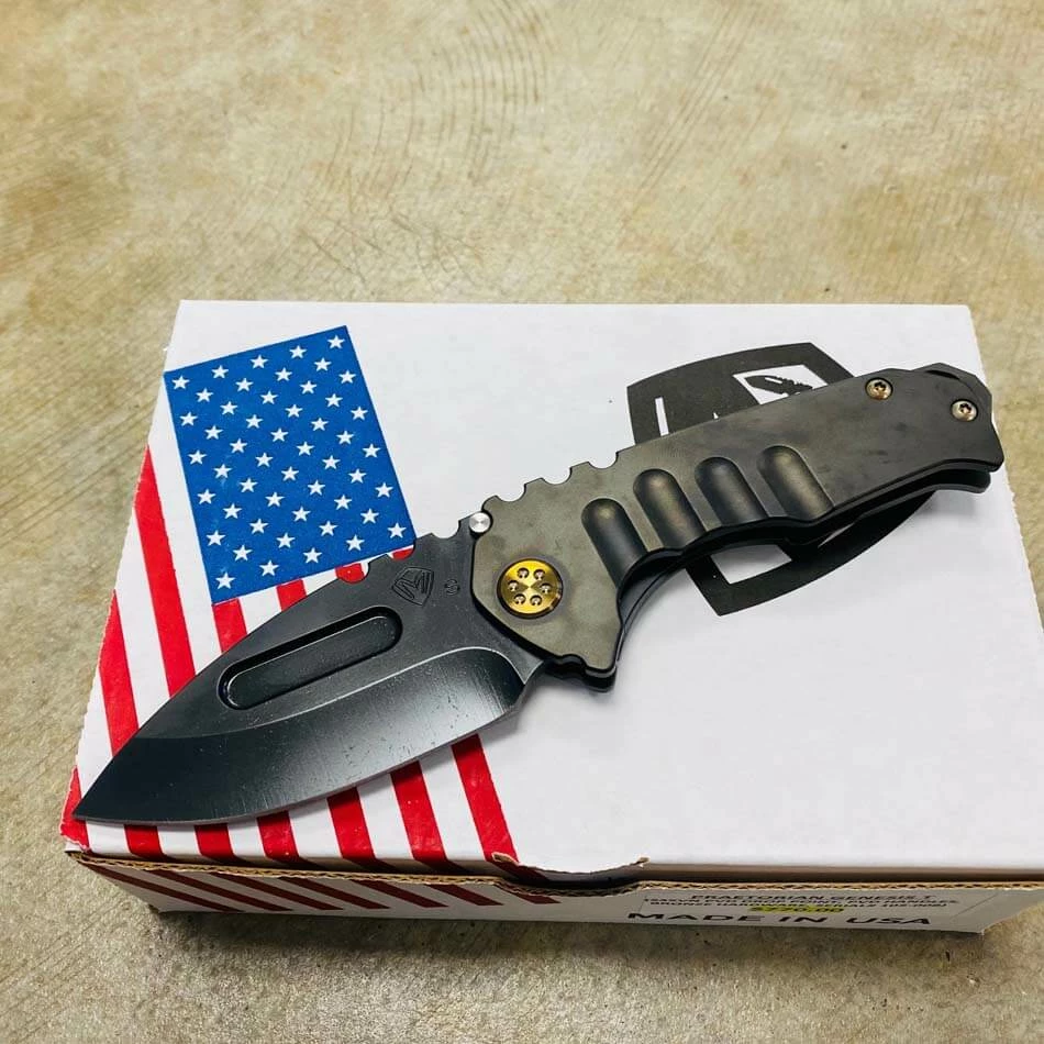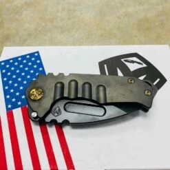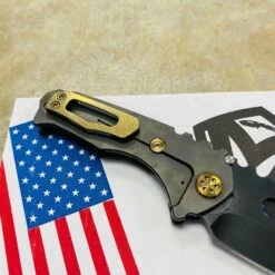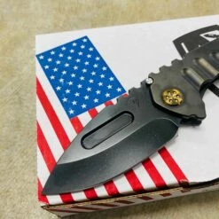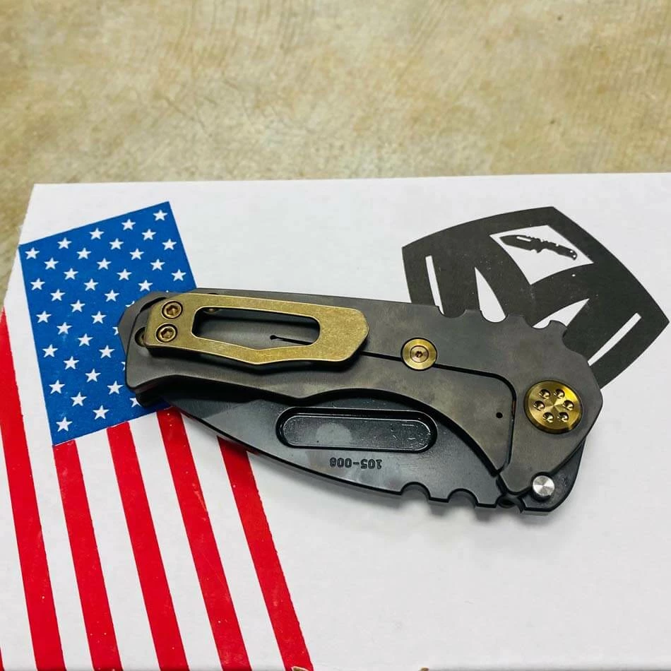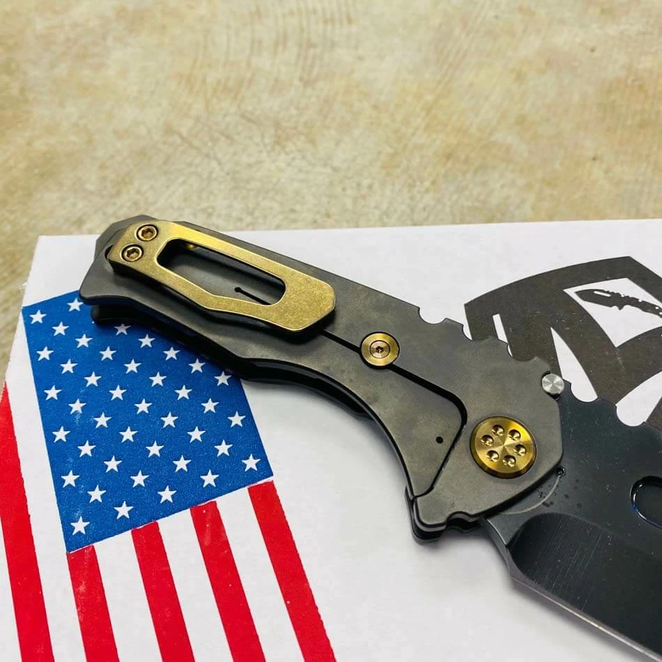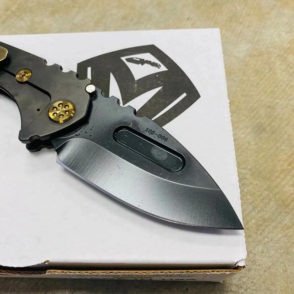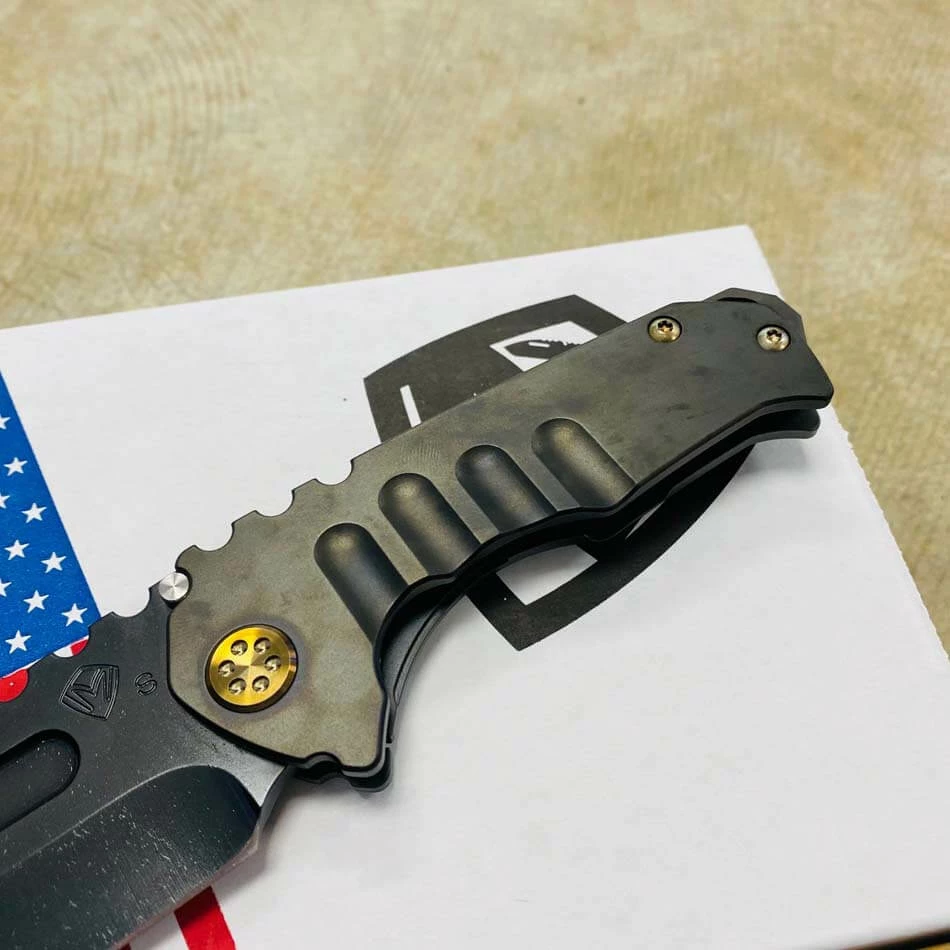 Medford Praetorian Genesis T S35VN PVD drop point, PVD handles, Bronze hardware, serial 105-008. The Knife was made in its current full size as a printing fluke as a novelty! Who knew it would take the knife world by storm? This was the predetermined size of the design. The Praetorian Genesis is for that “This one is too big, this one is too small” knife nut. The Praetorian Genesis is that middle ground that looks as bad-ass as ever but is still large enough for nearly anything. Limited Edition!