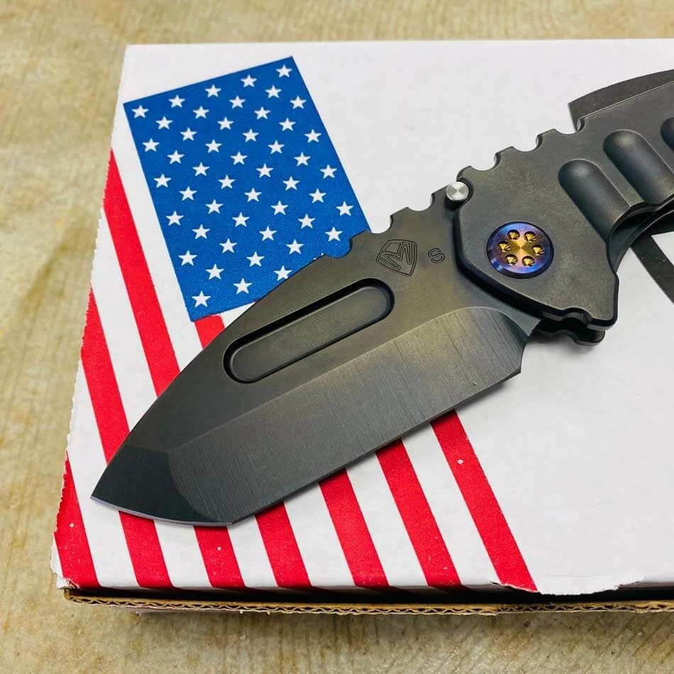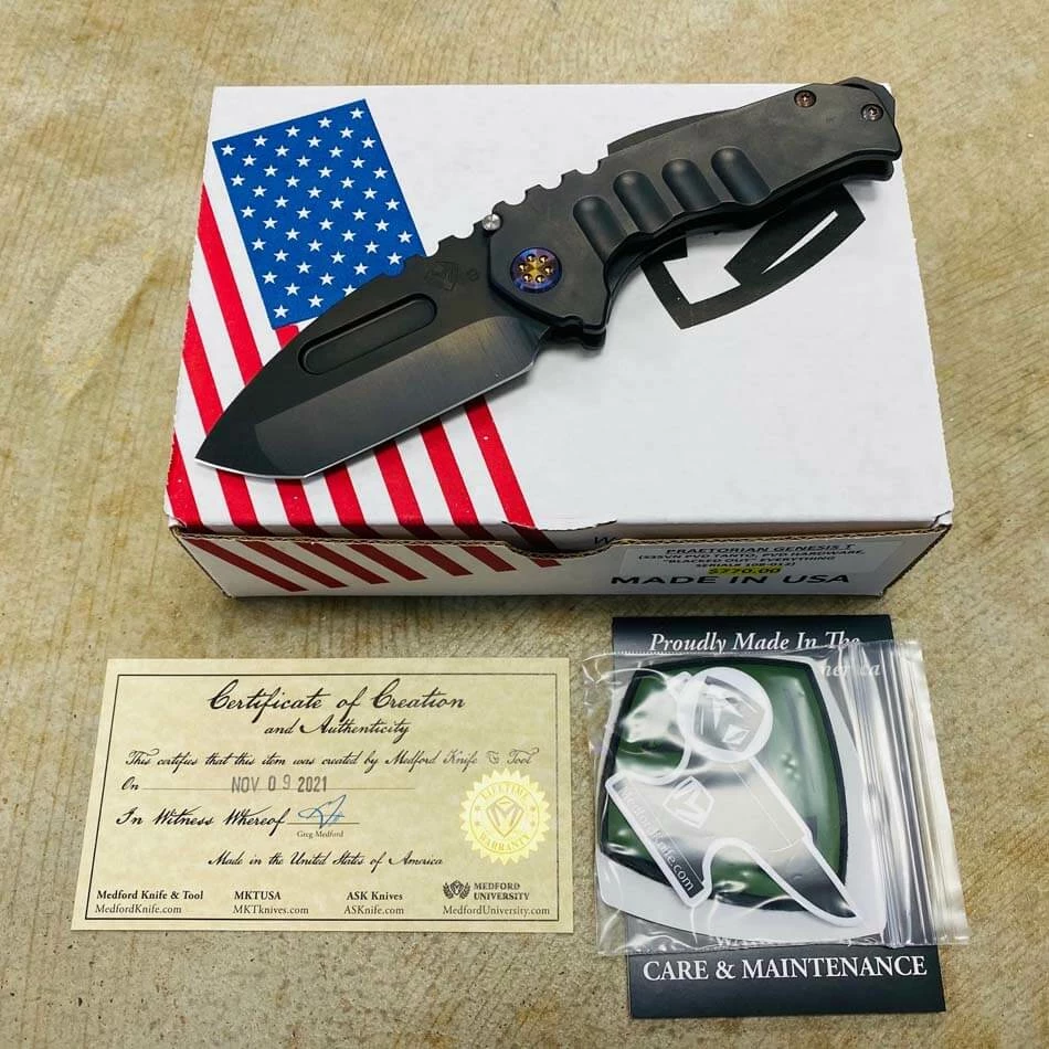 Medford Praetorian Genesis T S35VN PVD tanto, PVD handles, flamed hardware, PVD clip, PVD breaker. The Knife was made in its current full size as a printing fluke as a novelty! Who knew it would take the knife world by storm? This was the predetermined size of the design. The Praetorian Genesis is for that “This one is too big, this one is too small” knife nut. The Praetorian Genesis is that middle ground that looks as bad-ass as ever but is still large enough for nearly anything. Limited Edition!