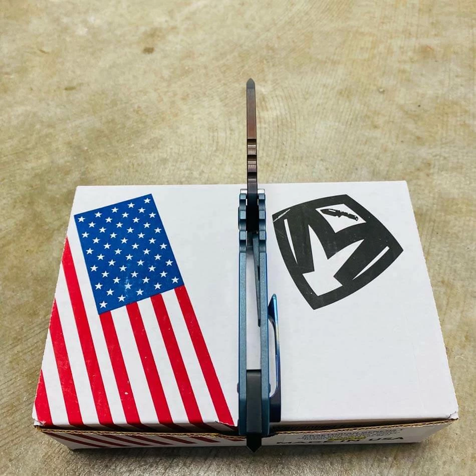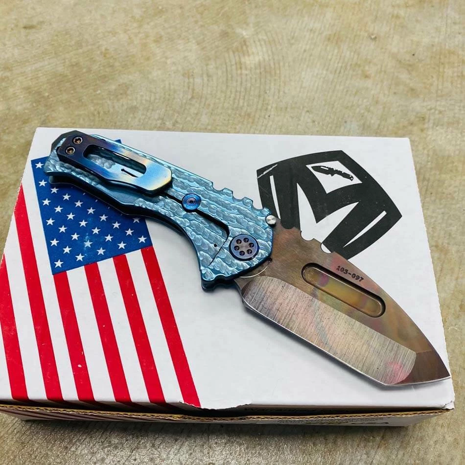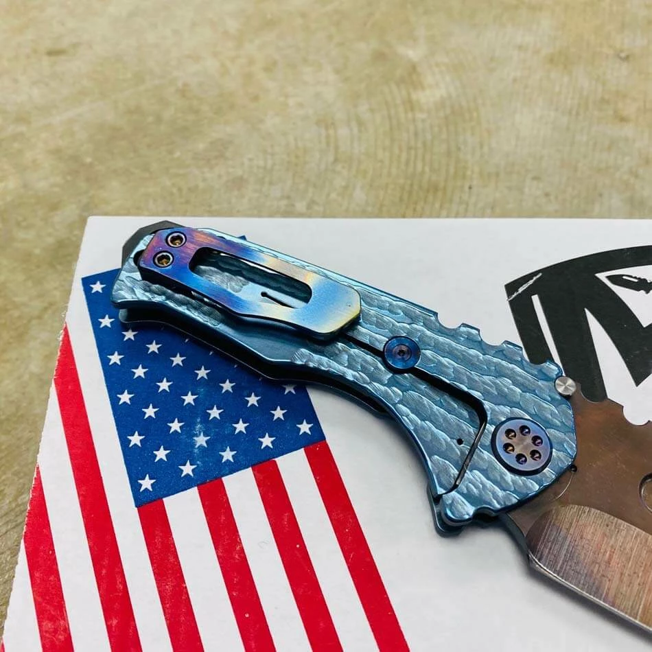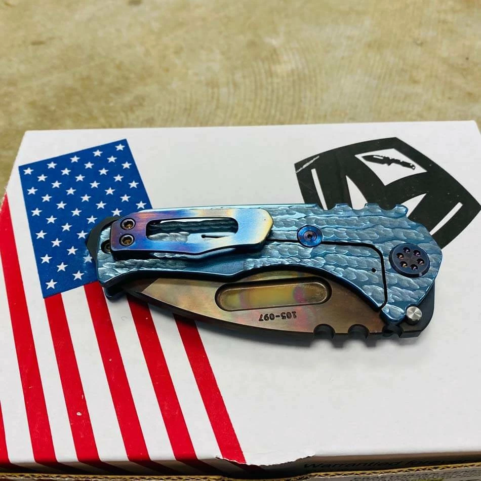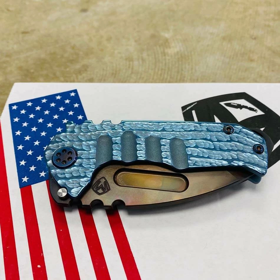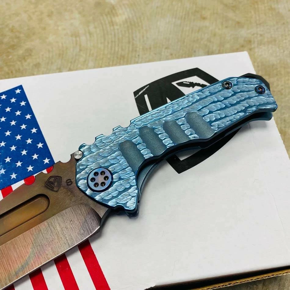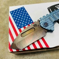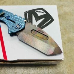 Medford Praetorian Genesis T S35VN vulcan tanto, aquamarine water ripples handles, flamed hardware, serial 105-097. The Knife was made in its current full size as a printing fluke as a novelty! Who knew it would take the knife world by storm? This was the predetermined size of the design. The Praetorian Genesis is for that “This one is too big, this one is too small” knife nut. The Praetorian Genesis is that middle ground that looks as bad-ass as ever but is still large enough for nearly anything. Limited Edition!