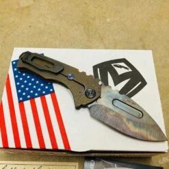 Medford Praetorian Genesis T S35VN vulcan drop point knife, Dark Bronze American Flag, PVD hardware, serial# 012-097. The Knife was made in its current full size as a printing fluke as a novelty! Who knew it would take the knife world by storm? This was the predetermined size of the design. The Praetorian Genesis is for that “This one is too big, this one is too small” knife nut. The Praetorian Genesis is that middle ground that looks as bad-ass as ever but is still large enough for nearly anything. Limited Edition!