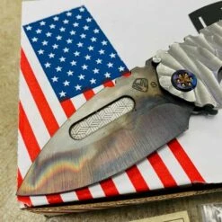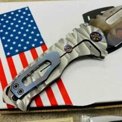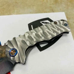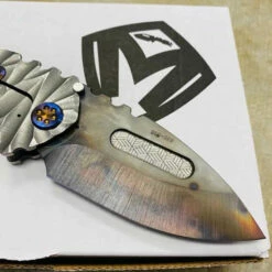 Medford Praetorian Genesis T S35VN vulcan drop point knife, pattern engraved fuller groove, bead blasted/brushed silver predator handles, serial 010-089. The Knife was made in its current full size as a printing fluke as a novelty! Who knew it would take the knife world by storm? This was the predetermined size of the design. The Praetorian Genesis is for that “This one is too big, this one is too small” knife nut. The Praetorian Genesis is that middle ground that looks as bad-ass as ever but is still large enough for nearly anything. Limited Edition!