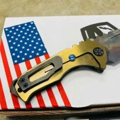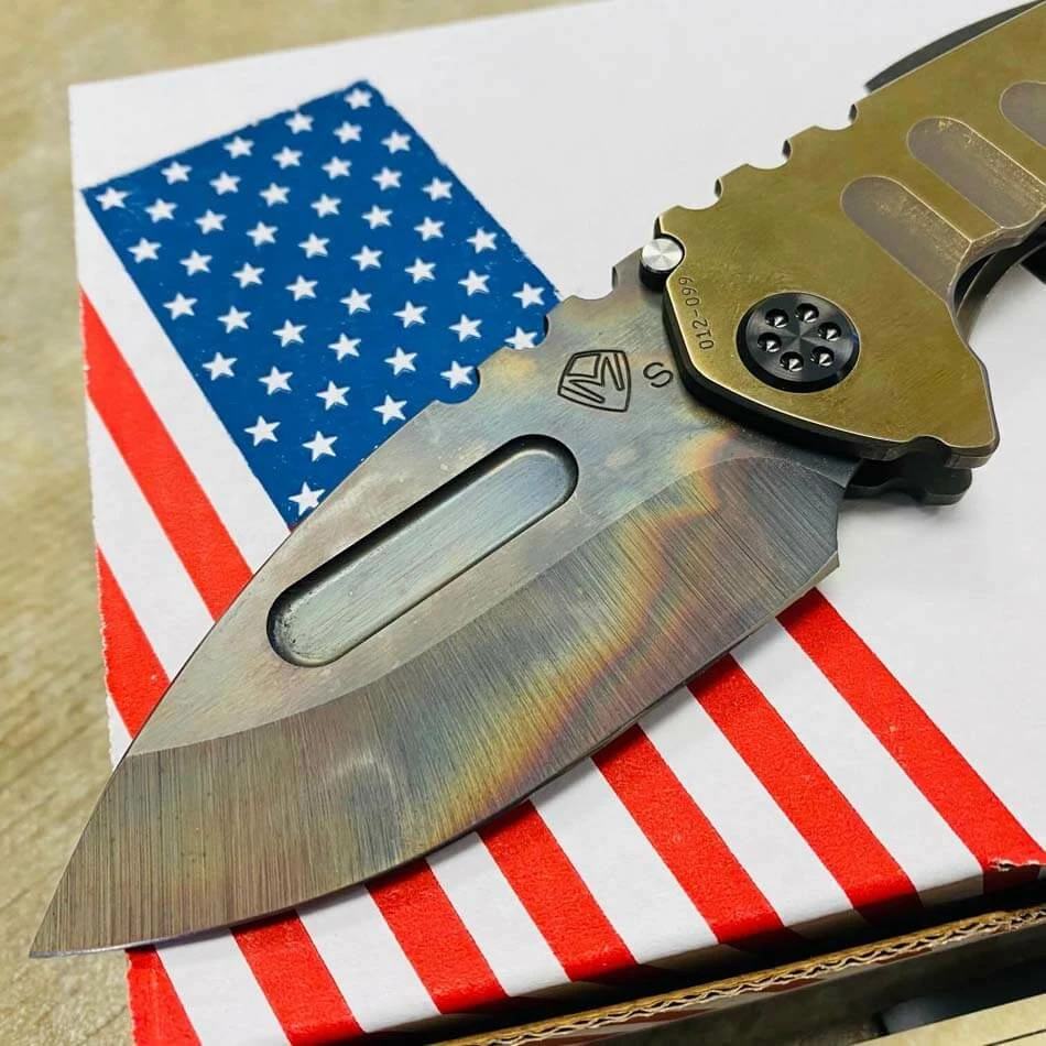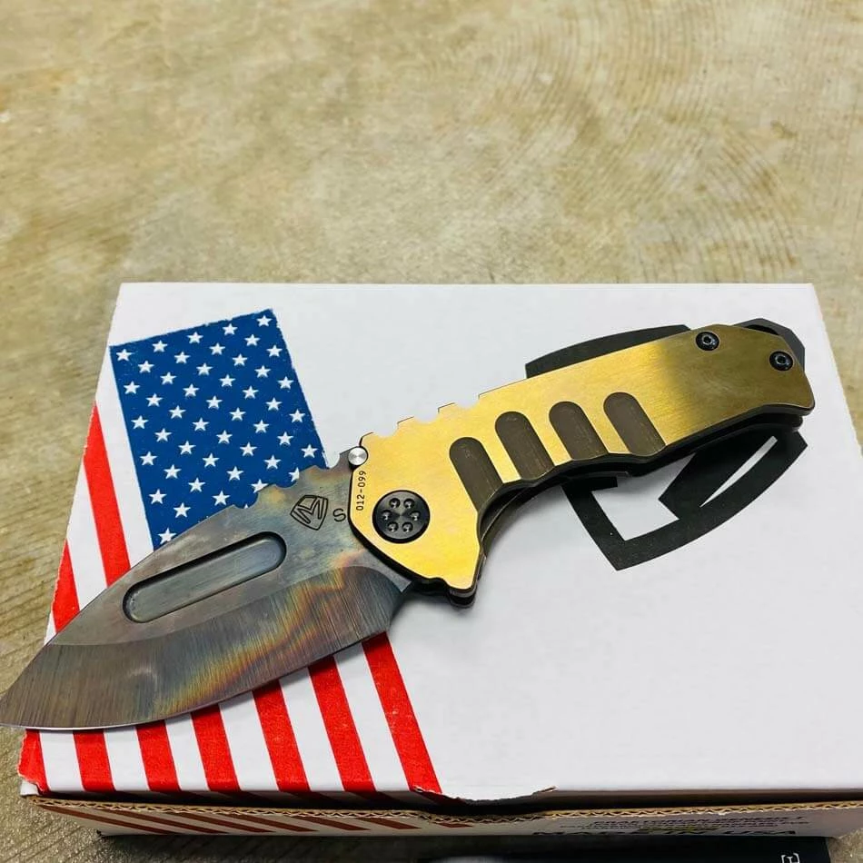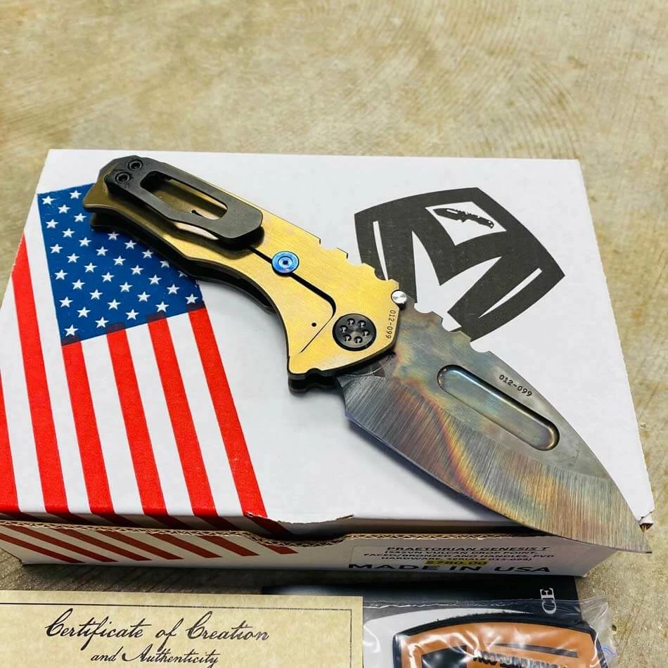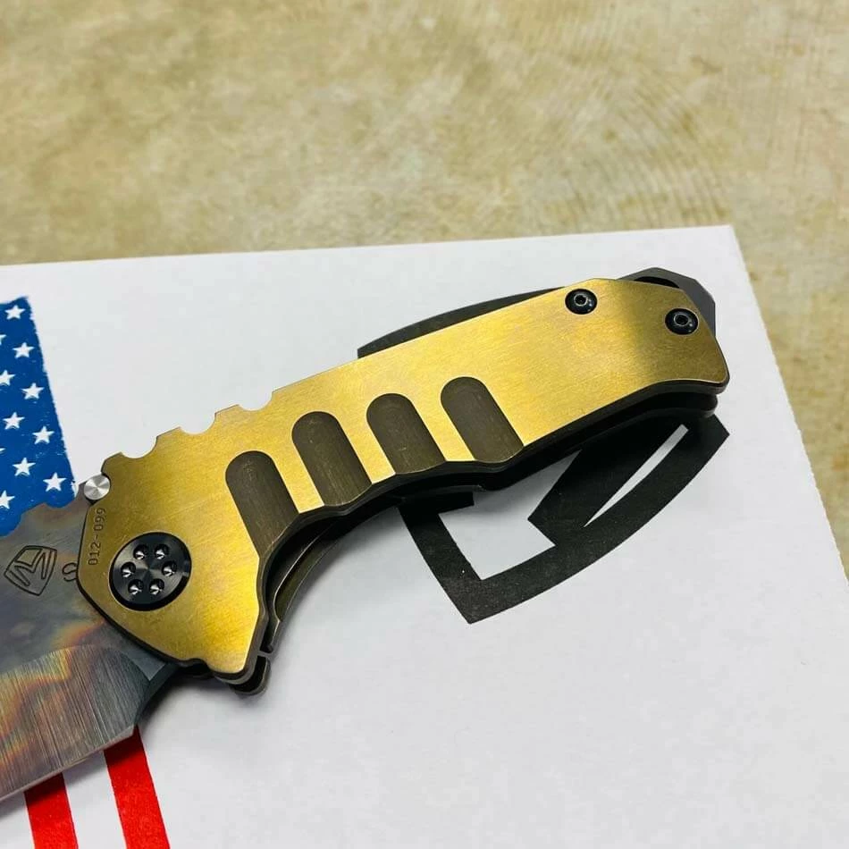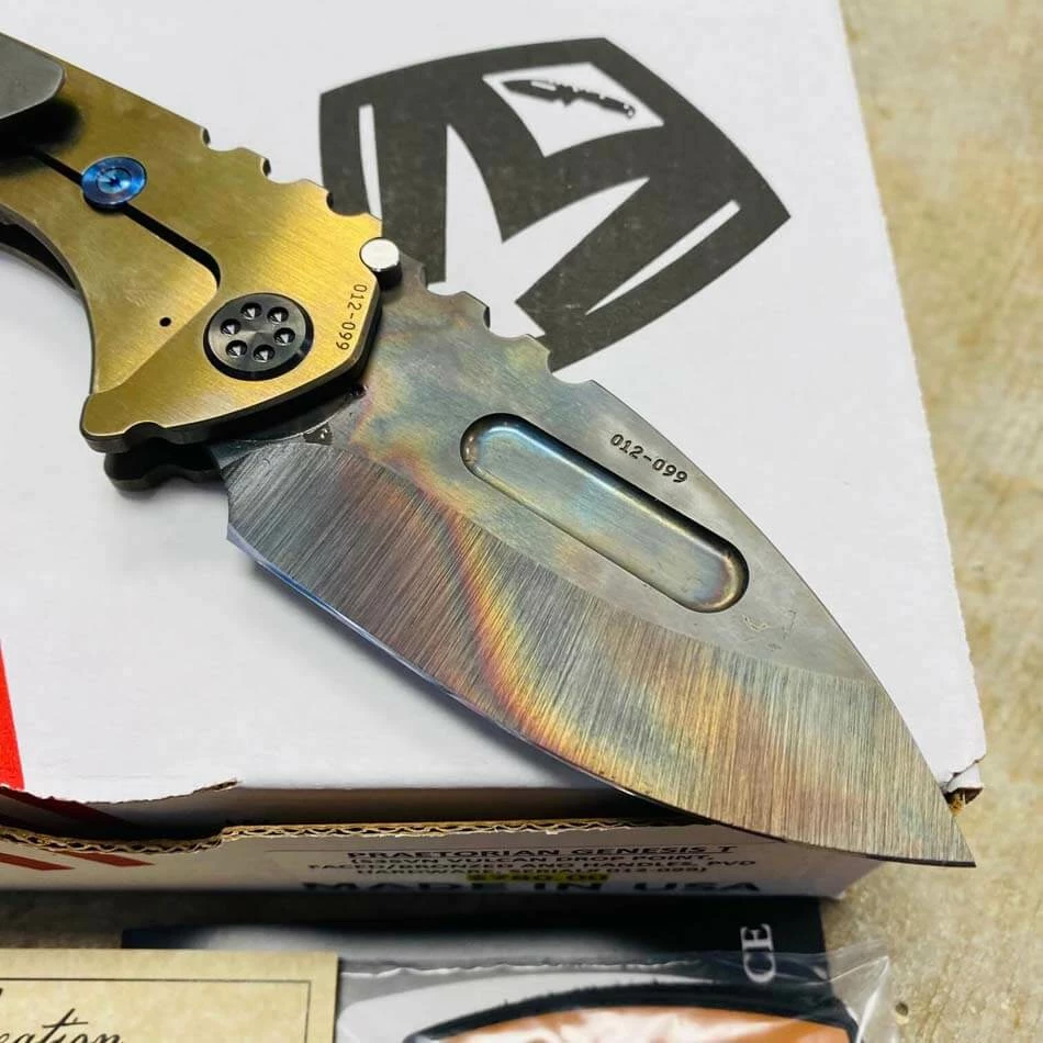 Medford Praetorian Genesis T S35VN vulcan drop point, faced bronzed ano handles,PVD hardware, serial 012-099. The Knife was made in its current full size as a printing fluke as a novelty! Who knew it would take the knife world by storm? This was the predetermined size of the design. The Praetorian Genesis is for that “This one is too big, this one is too small” knife nut. The Praetorian Genesis is that middle ground that looks as bad-ass as ever but is still large enough for nearly anything. Limited Edition!