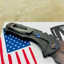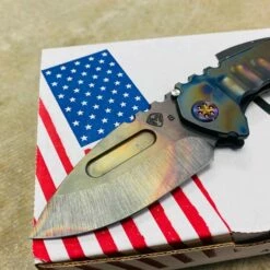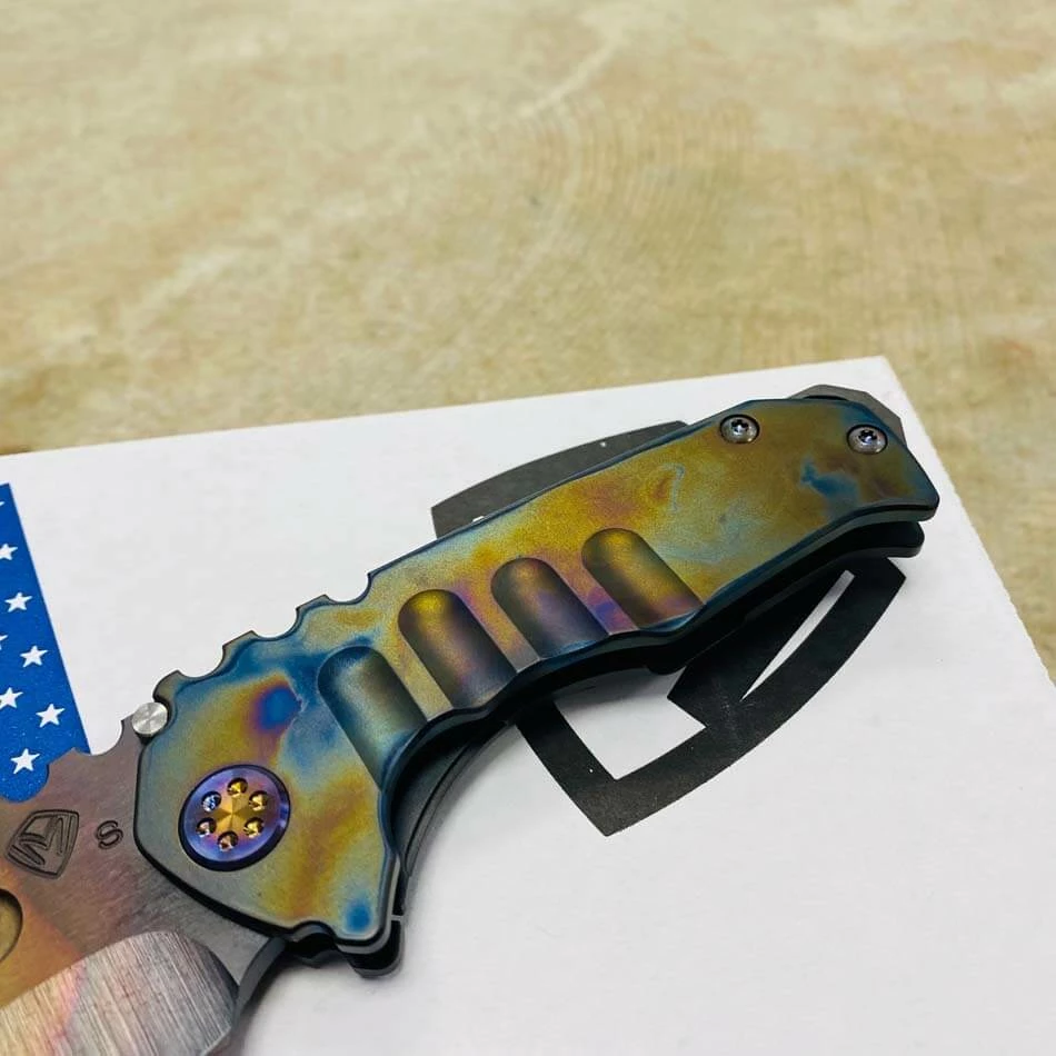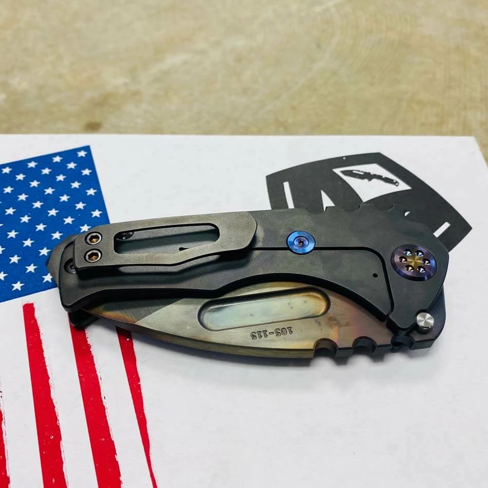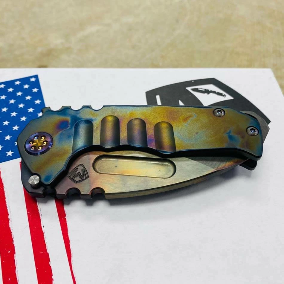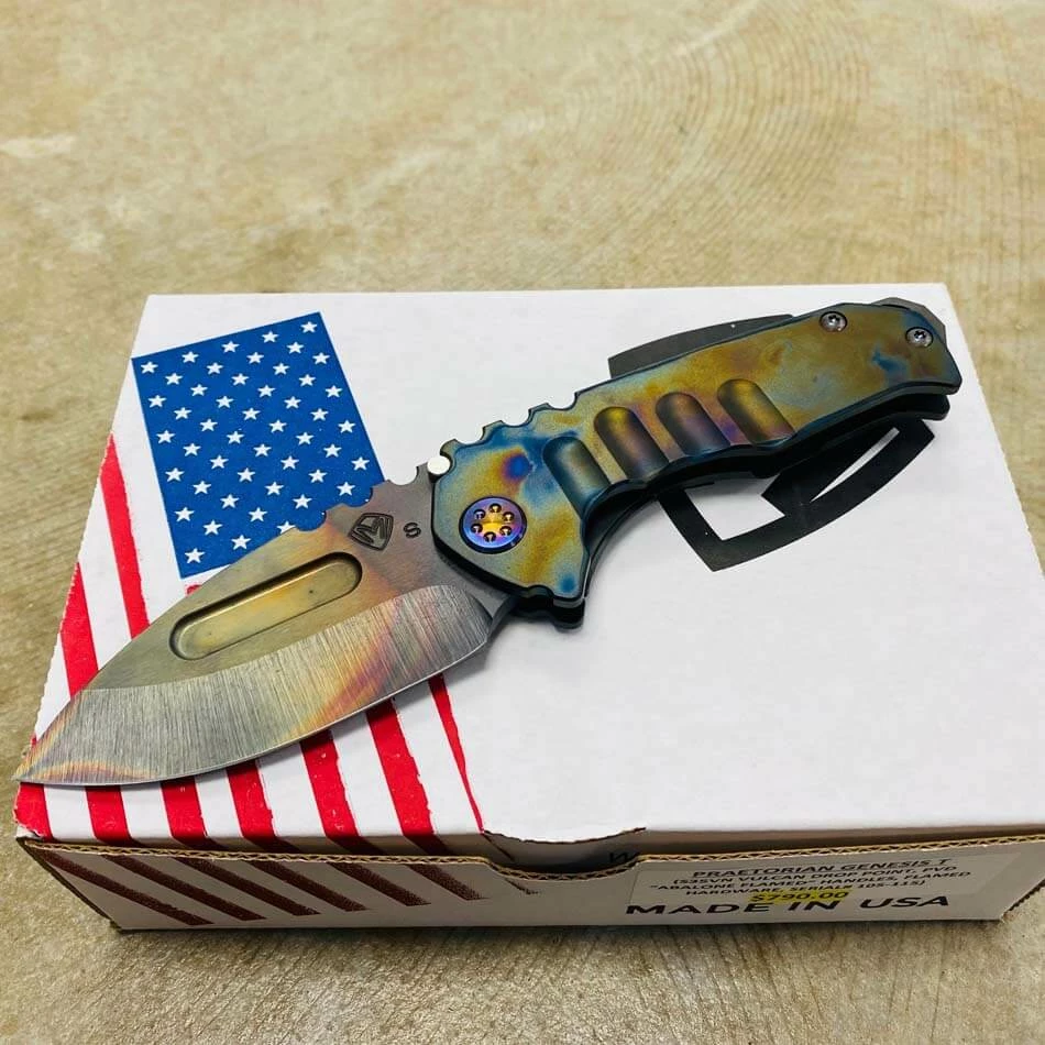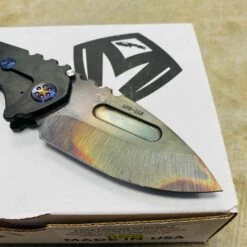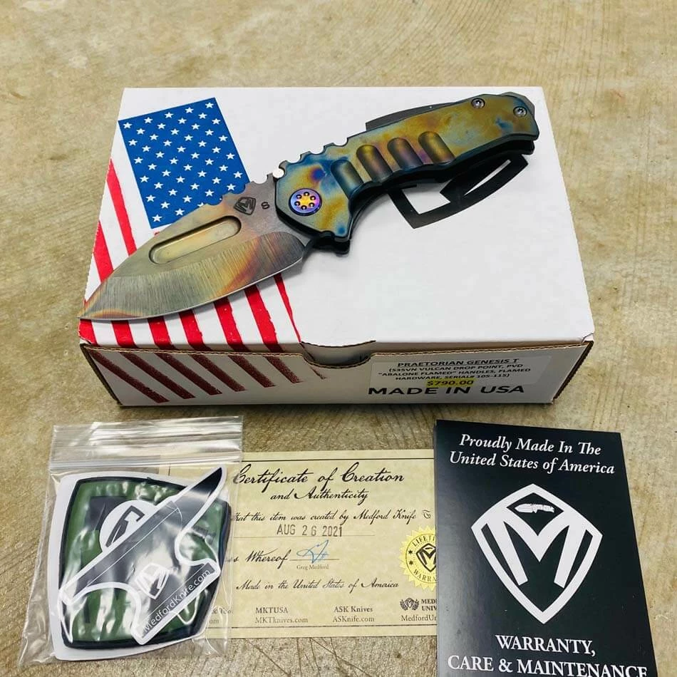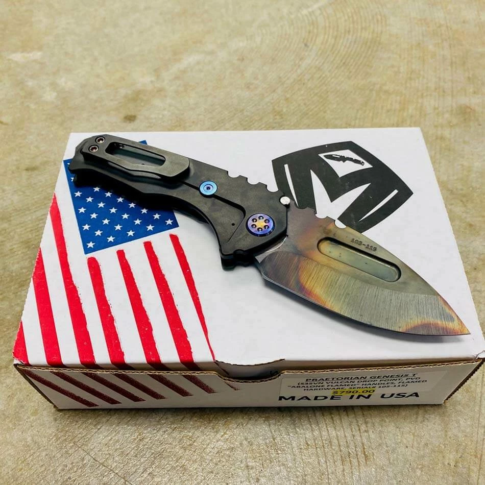 Medford Praetorian Genesis T S35VN vulcan drop point, PVD abalone handle, flamed hardware, PVD abalone clip, serial xx-xx. The Knife was made in its current full size as a printing fluke as a novelty! Who knew it would take the knife world by storm? This was the predetermined size of the design. The Praetorian Genesis is for that “This one is too big, this one is too small” knife nut. The Praetorian Genesis is that middle ground that looks as bad-ass as ever but is still large enough for nearly anything. Limited Edition!