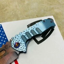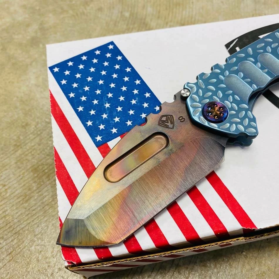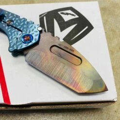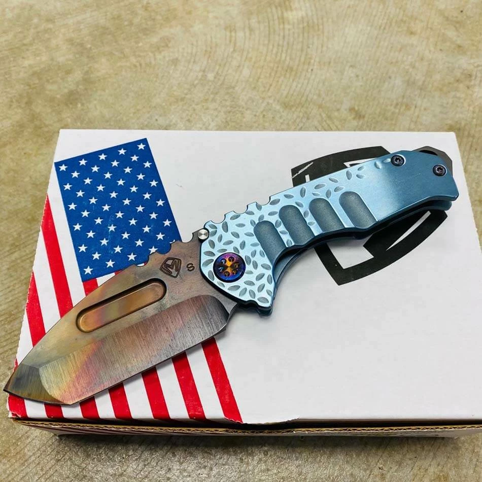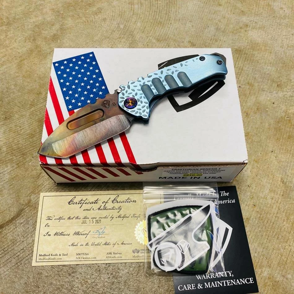 Medford Praetorian Genesis T S35VN vulcan tanto, aquamarine falling leaf handles, flamed hardware, serial 105-098. The Knife was made in its current full size as a printing fluke as a novelty! Who knew it would take the knife world by storm? This was the predetermined size of the design. The Praetorian Genesis is for that “This one is too big, this one is too small” knife nut. The Praetorian Genesis is that middle ground that looks as bad-ass as ever but is still large enough for nearly anything. Limited Edition!