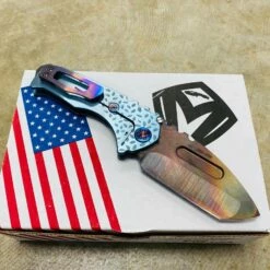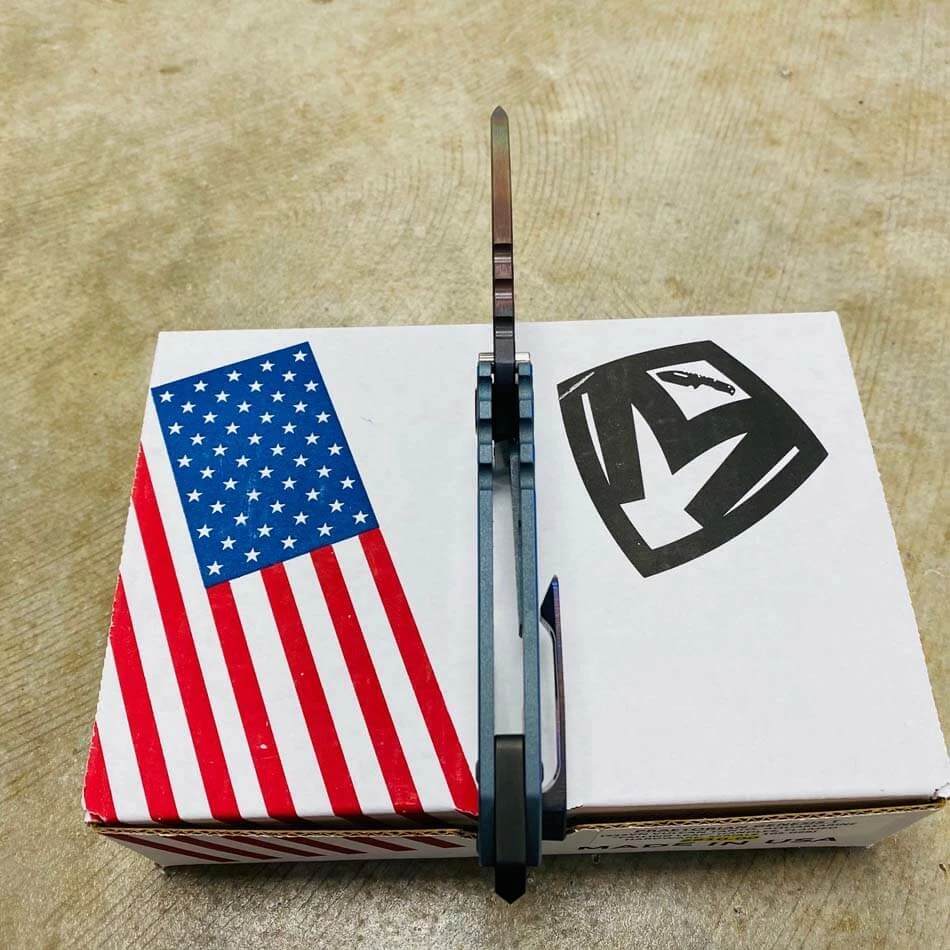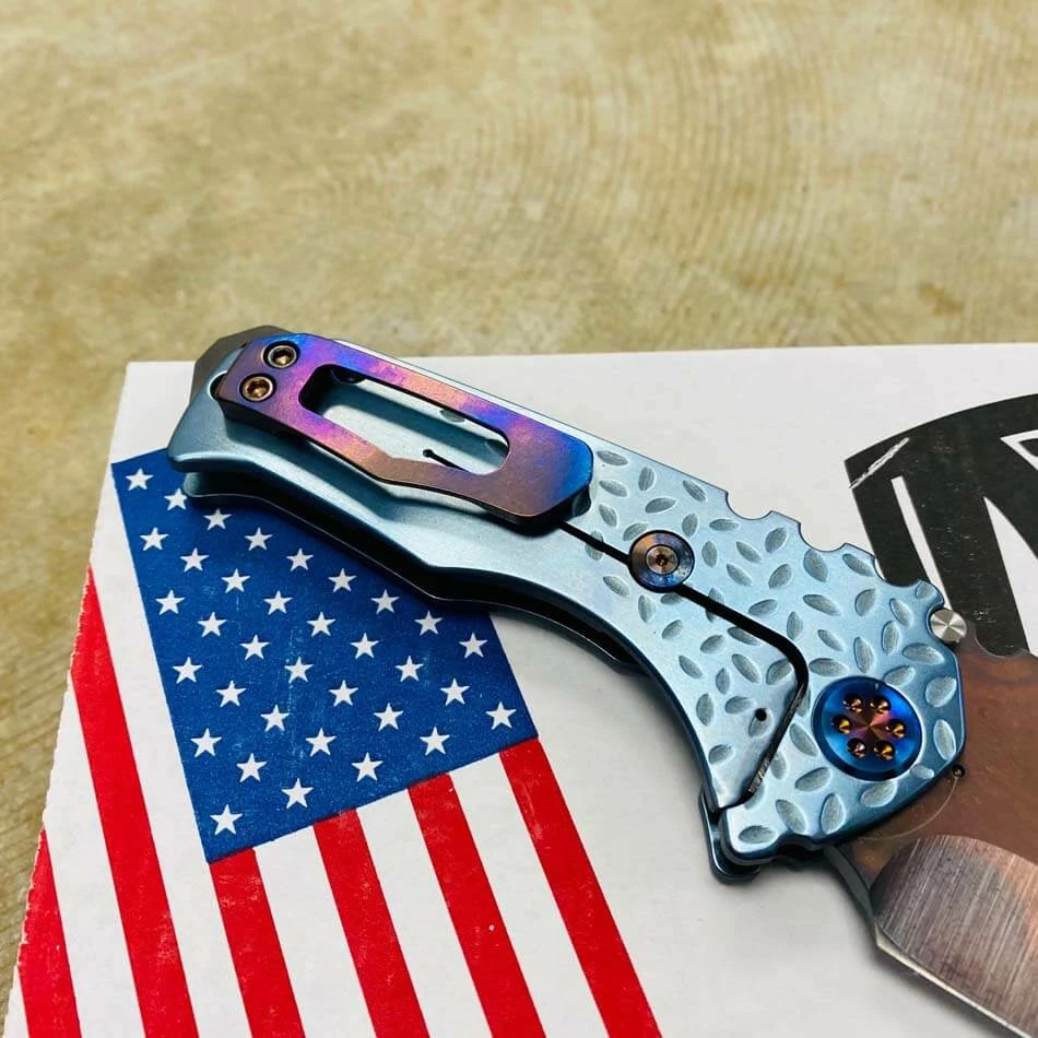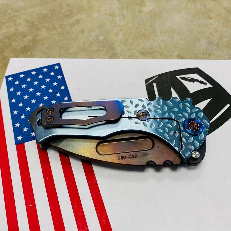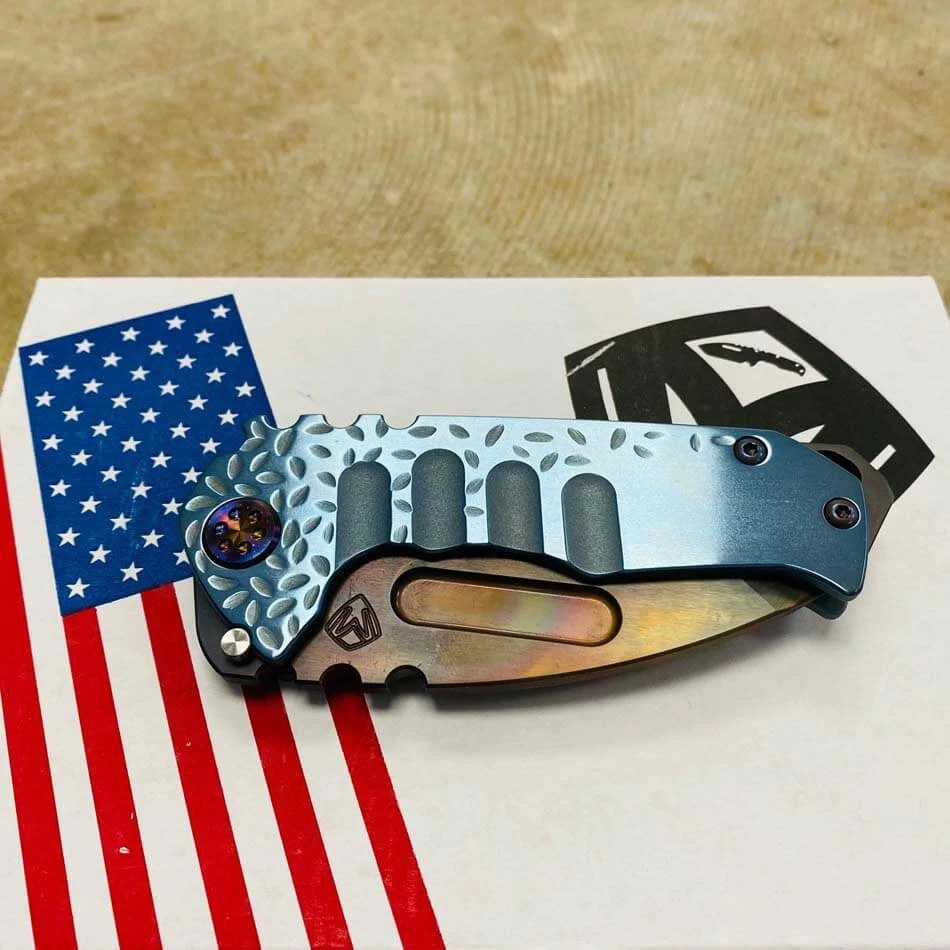 Medford Praetorian Genesis T S35VN vulcan tanto, aquamarine falling leaf handles, flamed hardware, serial 105-098. The Knife was made in its current full size as a printing fluke as a novelty! Who knew it would take the knife world by storm? This was the predetermined size of the design. The Praetorian Genesis is for that “This one is too big, this one is too small” knife nut. The Praetorian Genesis is that middle ground that looks as bad-ass as ever but is still large enough for nearly anything. Limited Edition!