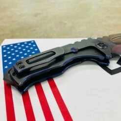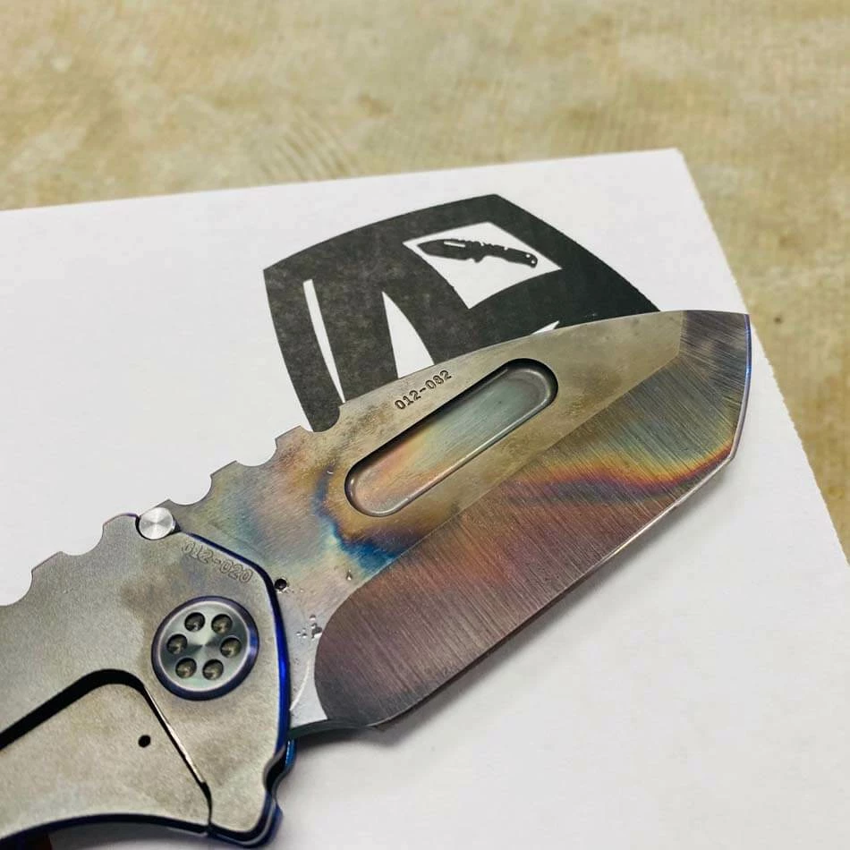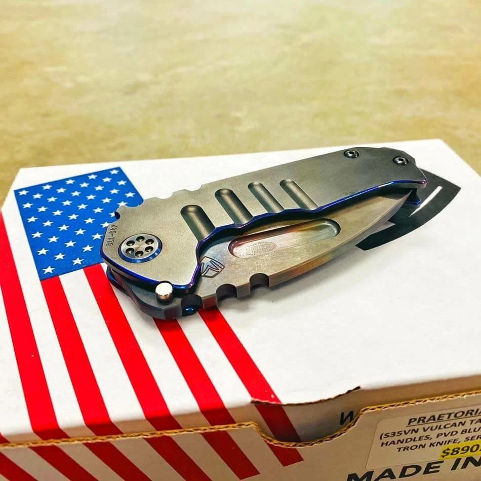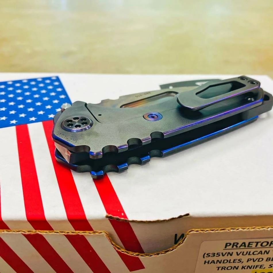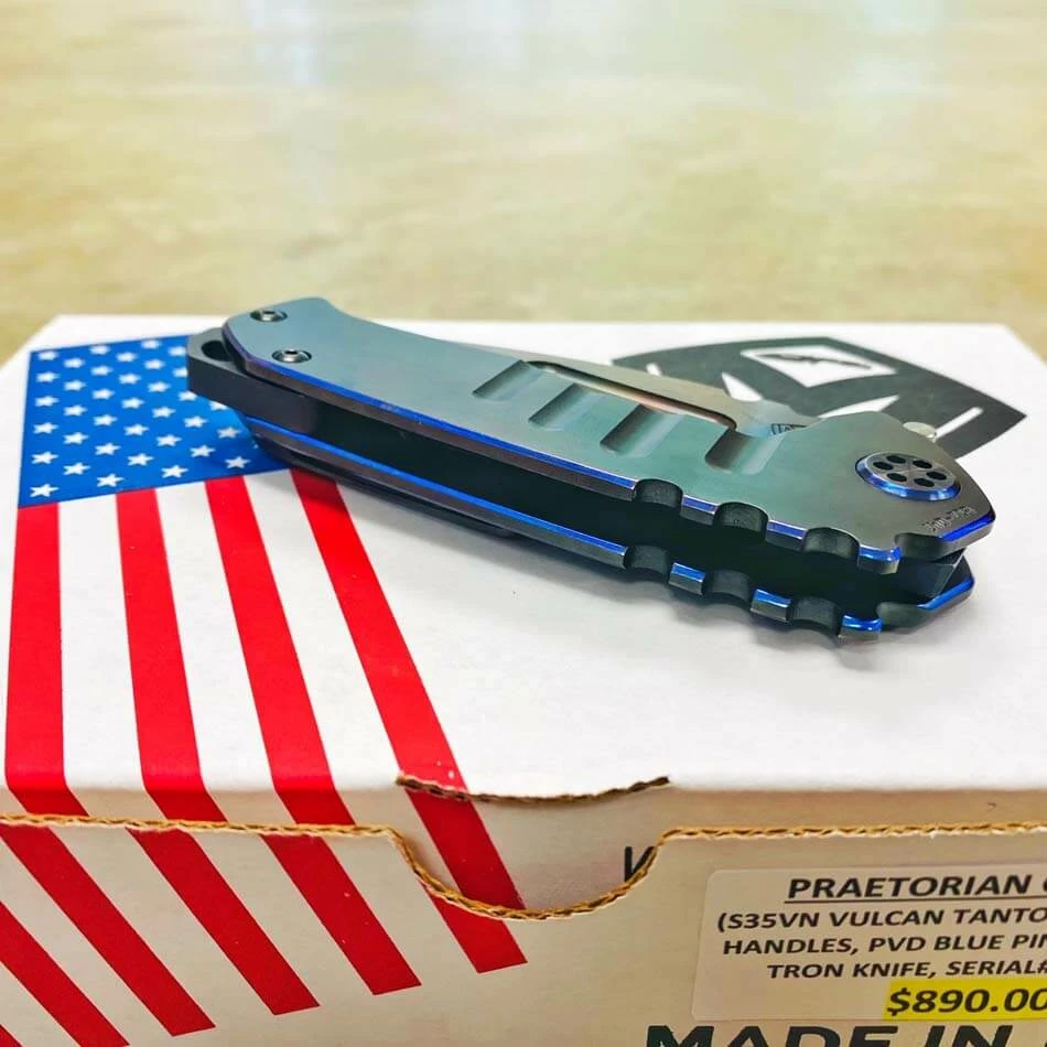Medford Praetorian Genesis T S35VN vulcan tanto, pvd handles with blue pinstripping. The Knife was made in its current full size as a printing fluke as a novelty! Who knew it would take the knife world by storm? This was the predetermined size of the design. The Praetorian Genesis is for that “This one is too big, this one is too small” knife nut. The Praetorian Genesis is that middle ground that looks as bad-ass as ever but is still large enough for nearly anything. Limited Edition!