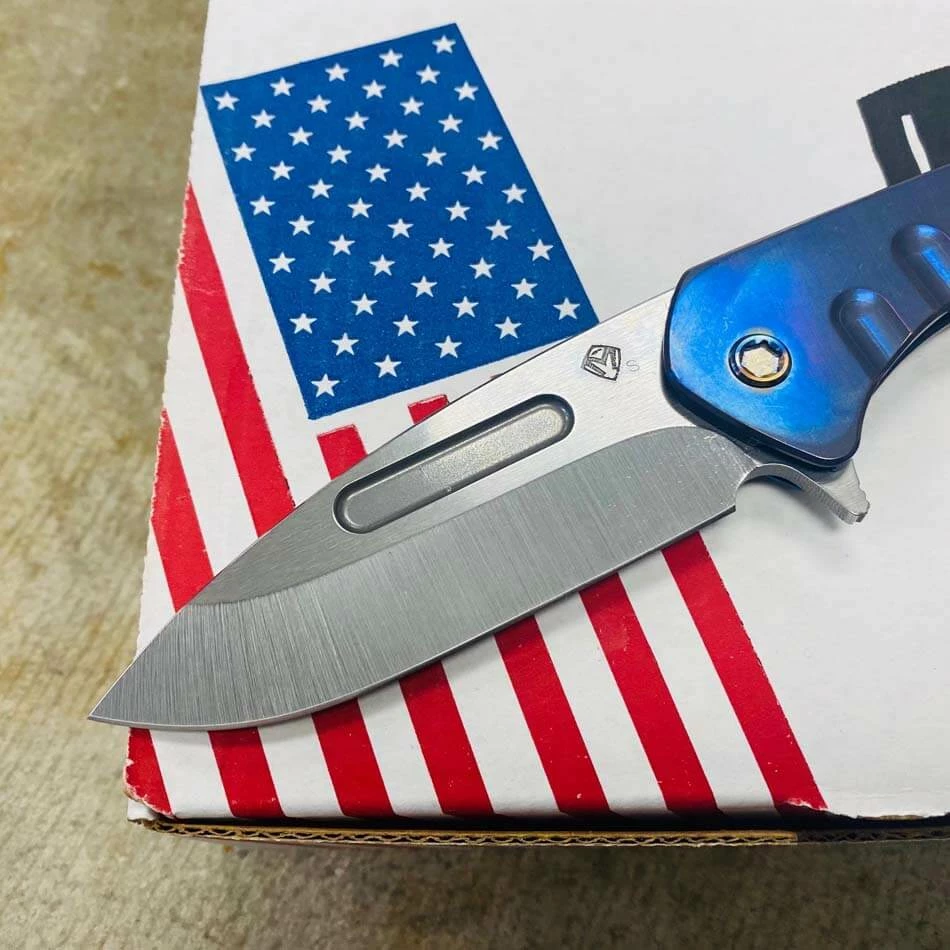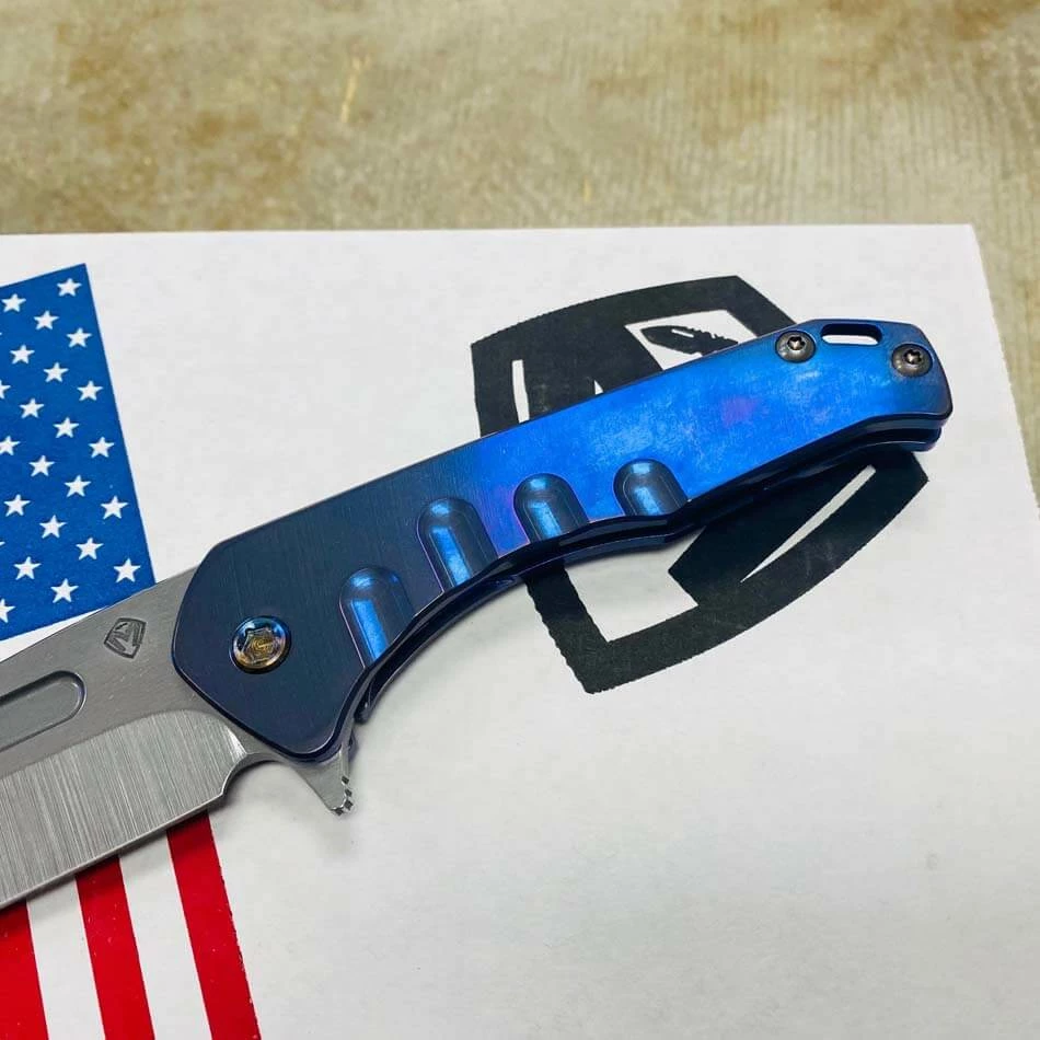 This knife has all the sexy appeal of the standard “Slim” but the action of an auto. Drop point blade, dark blue handles, flamed hardware, flamed clip. The flipper-cam is yummy and well placed for comfort in both the open and closed positions. The blade rides on 18 bearings and has the most satisfying snap both open and closed action. Titanium, S35Vn and all American Made. The design speaks to Greg’s design evolution and our connection to the evolving sentiments within the knife community. Not everyone wants a large aggressive tactical folder but they may want the style and performance. This knife is for them…