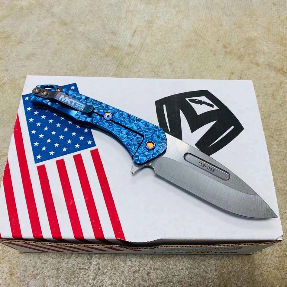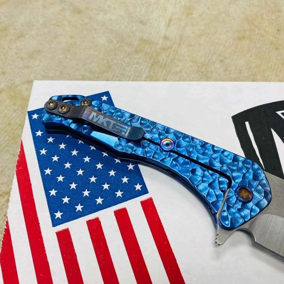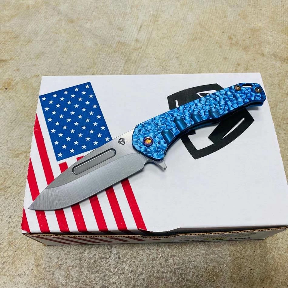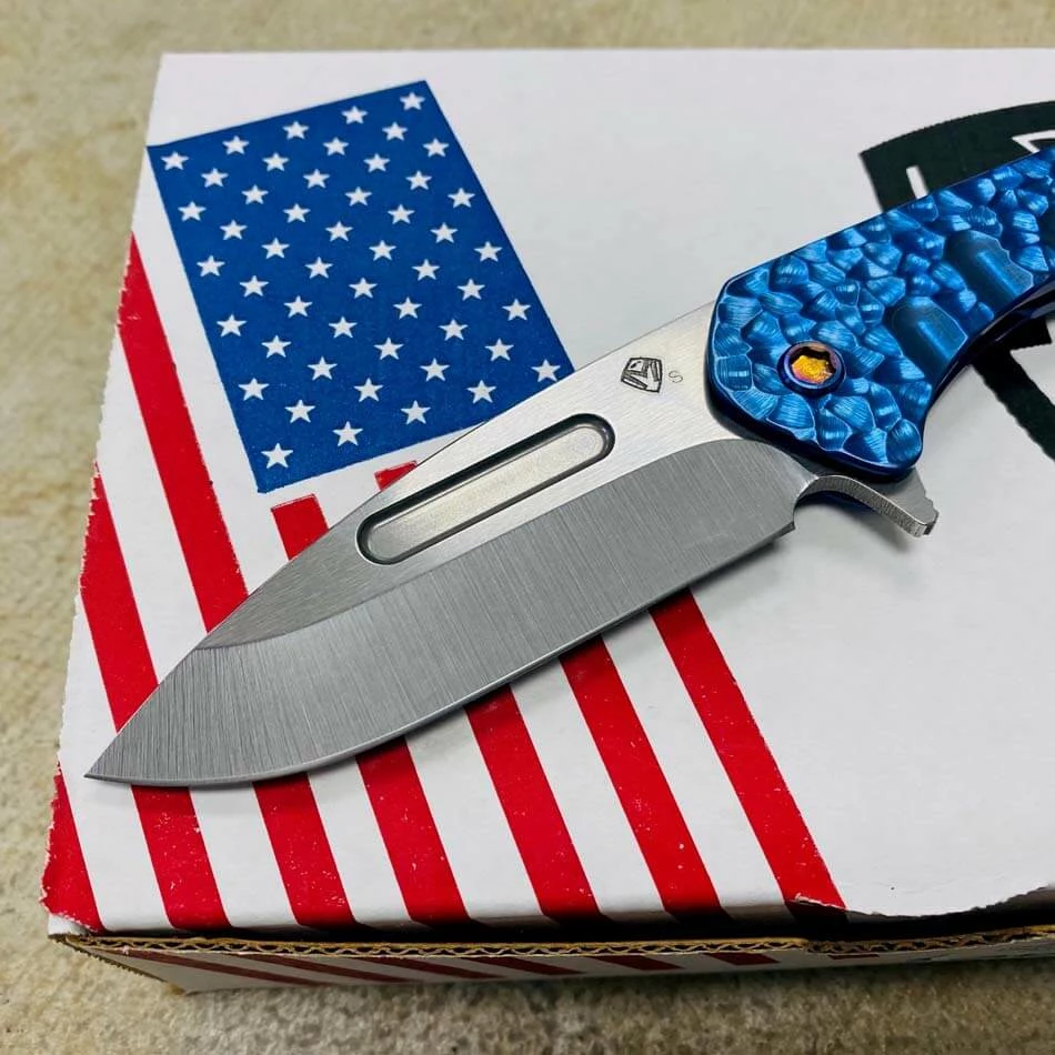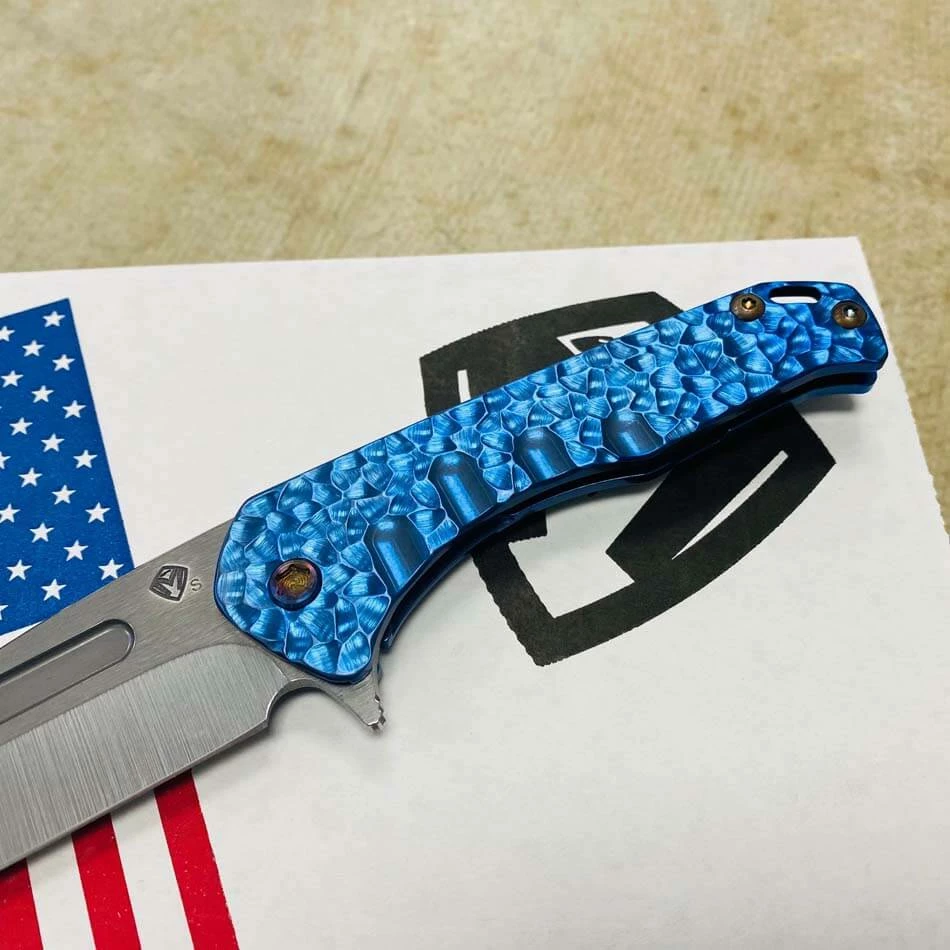 This knife has all the sexy appeal of the standard “Slim” but the action of an auto. Drop point blade, blue peaks and valleys handles, flamed hardware, flamed clip. The flipper-cam is yummy and well placed for comfort in both the open and closed positions. The blade rides on 18 bearings and has the most satisfying snap both open and closed action. Titanium, S35Vn and all American Made. The design speaks to Greg’s design evolution and our connection to the evolving sentiments within the knife community. Not everyone wants a large aggressive tactical folder but they may want the style and performance. This knife is for them…