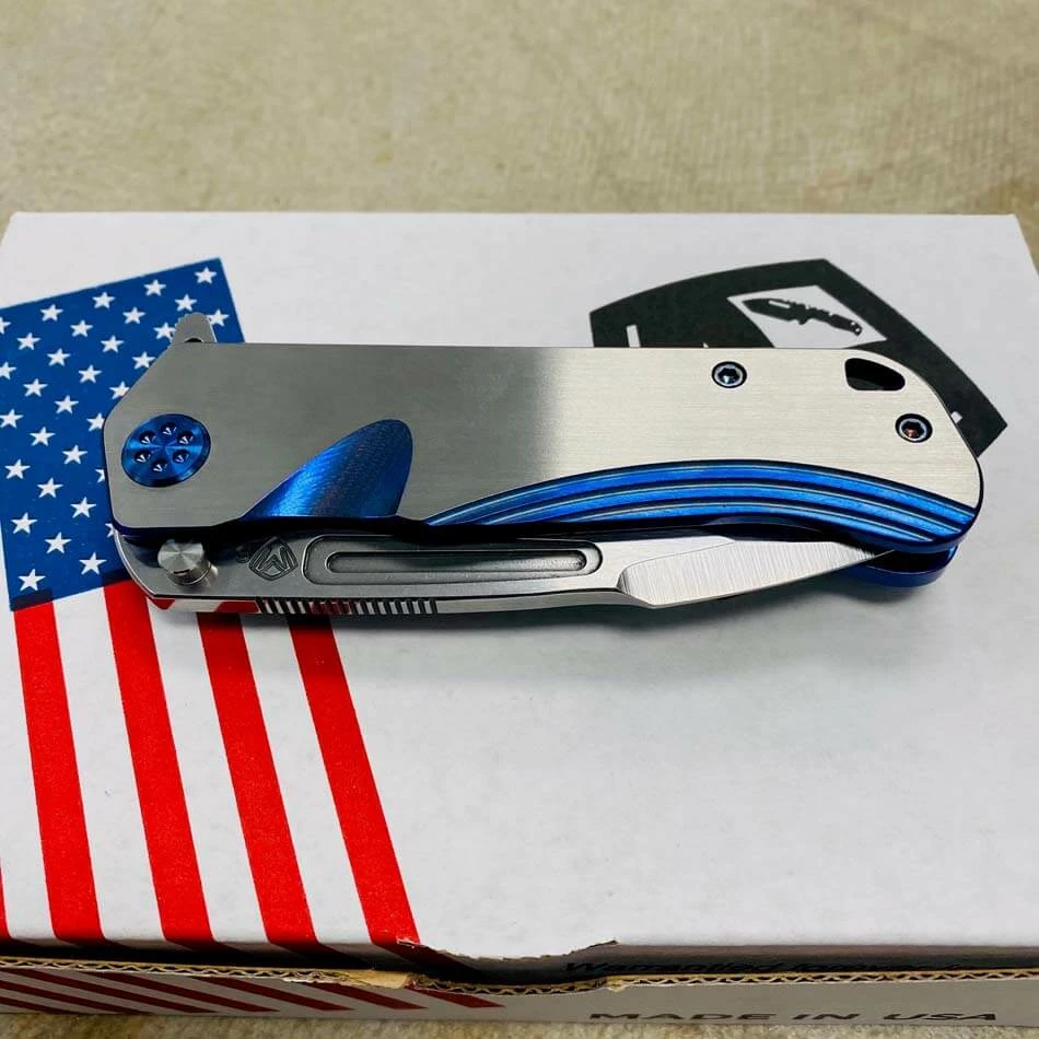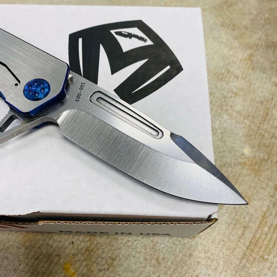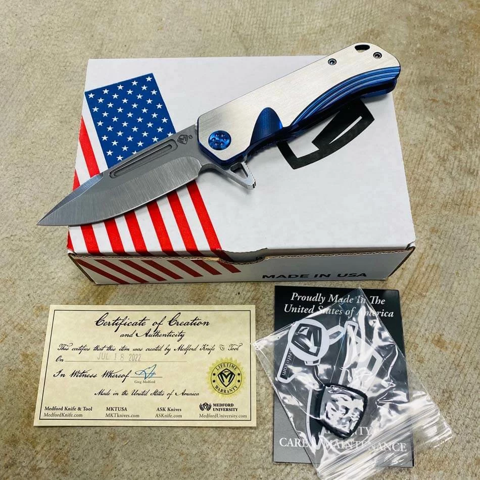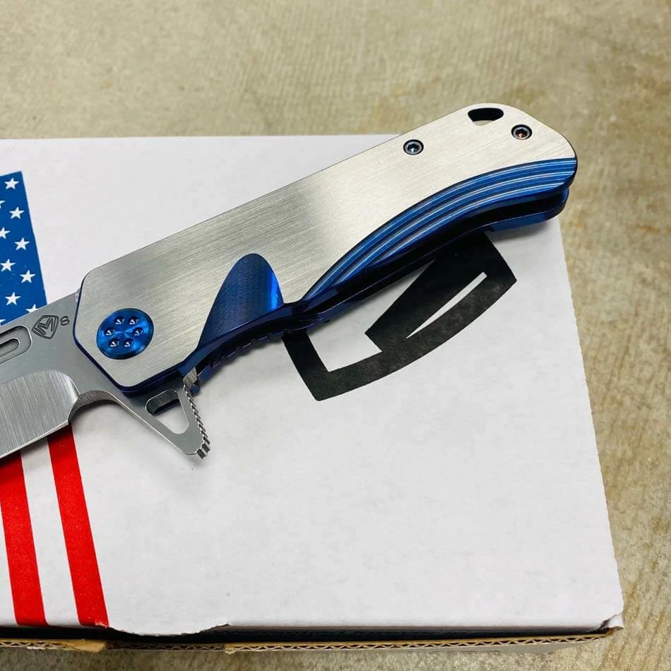 This Medford Proxima has dark blue with silver faced flats handles, dark blue hardware, blue with silver flats clip. The Medford Knife and Tool Proxima started life as the Gigantes. For folks that wanted a larger than life knife it was awesome, but for the rest of planet Earth an adjustment in attitude was required. We drew-down the overall length to 8.8″ with a 4.9″ closed length for the pocket and 3.9″ blade length. All materials are of 3/16″ nominal stock, making for a very EDC friendly thickness. We played with several twists on the original name but as the prototype was carried by Greg, he kept saying, This knife is too awesome to get a spin-off name. Since every time anyone needed to look at the prototype it was in Greg’s pocket… always near, thus: Proxima. This is THE knife carried by Greg these days. As he says: I love the flipper/hilt and the basic meanness of this thing! It just looks bad ass and I look for reasons to snap it out all day What else can we say?