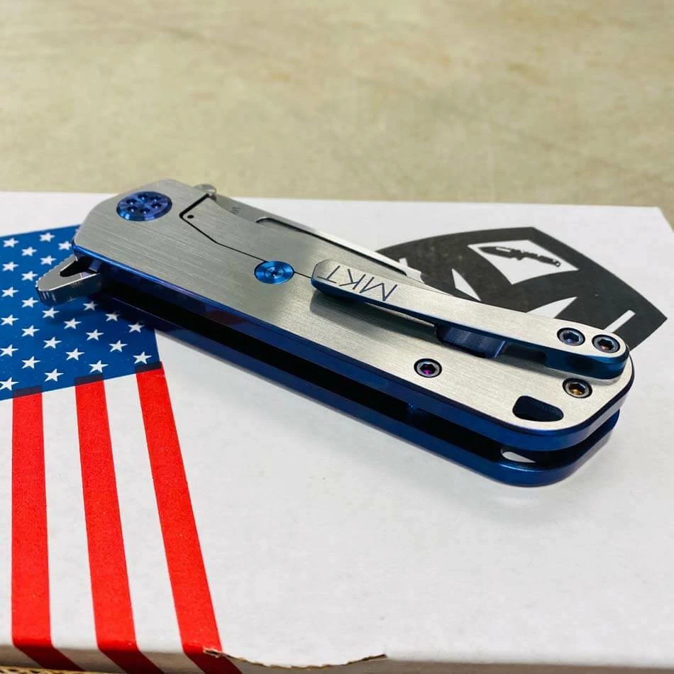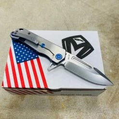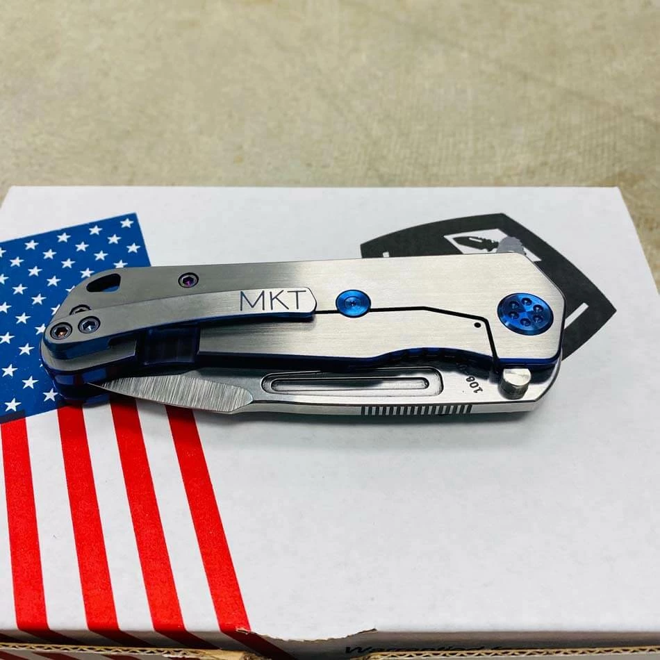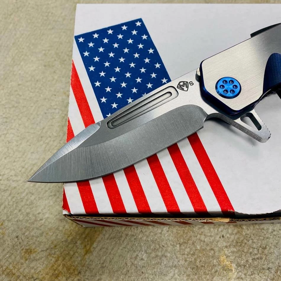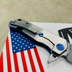 This Medford Proxima has dark blue with silver faced flats handles, dark blue hardware, blue with silver flats clip. The Medford Knife and Tool Proxima started life as the Gigantes. For folks that wanted a larger than life knife it was awesome, but for the rest of planet Earth an adjustment in attitude was required. We drew-down the overall length to 8.8″ with a 4.9″ closed length for the pocket and 3.9″ blade length. All materials are of 3/16″ nominal stock, making for a very EDC friendly thickness. We played with several twists on the original name but as the prototype was carried by Greg, he kept saying, This knife is too awesome to get a spin-off name. Since every time anyone needed to look at the prototype it was in Greg’s pocket… always near, thus: Proxima. This is THE knife carried by Greg these days. As he says: I love the flipper/hilt and the basic meanness of this thing! It just looks bad ass and I look for reasons to snap it out all day What else can we say?