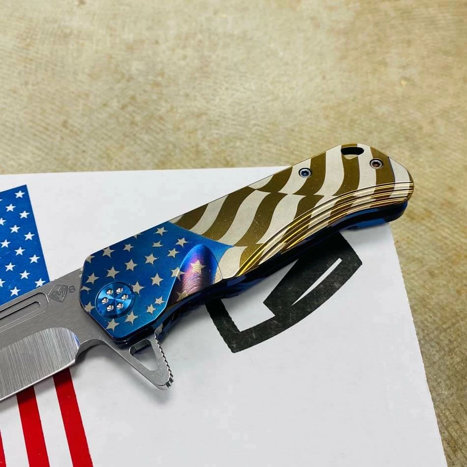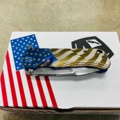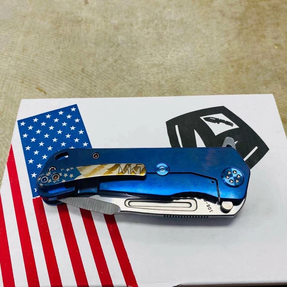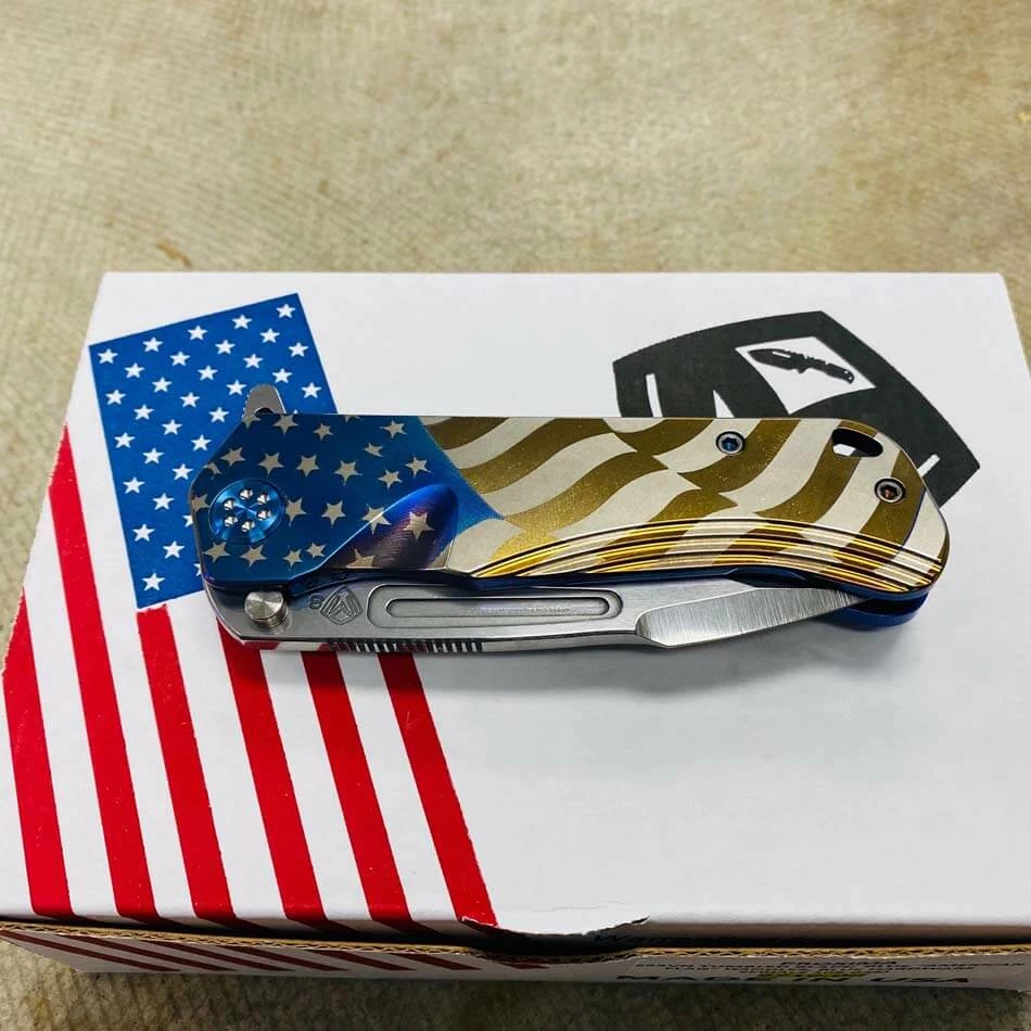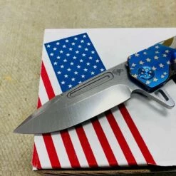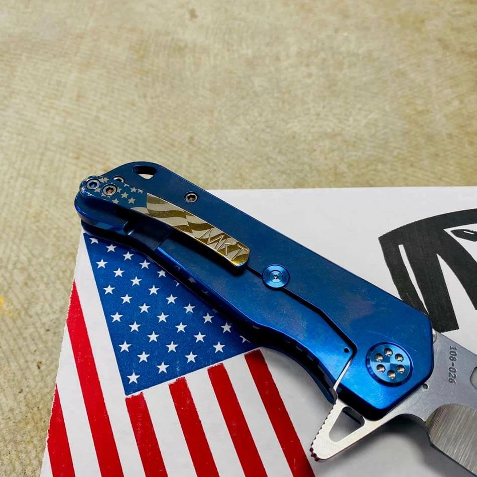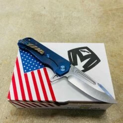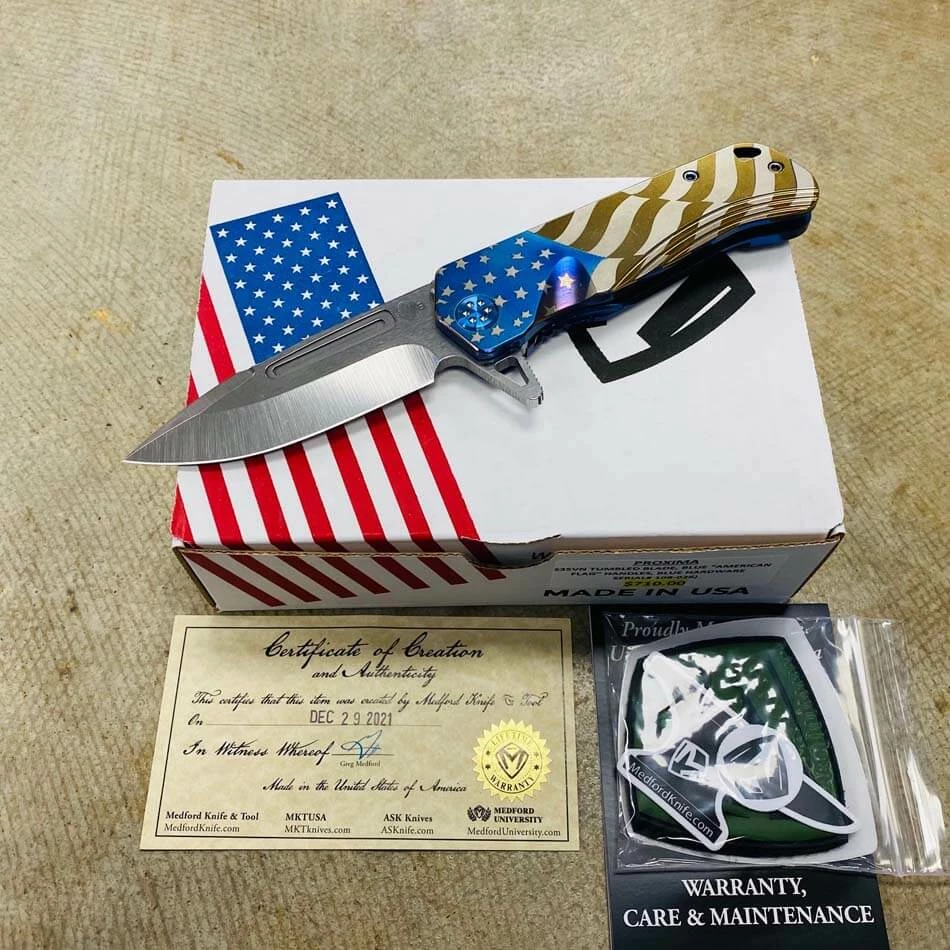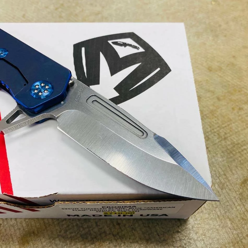 This Medford Proxima has blue American flag handles, blue hardware, blue flag clip. The Medford Knife and Tool Proxima started life as the Gigantes. For folks that wanted a larger than life knife it was awesome, but for the rest of planet Earth an adjustment in attitude was required. We drew-down the overall length to 8.8″ with a 4.9″ closed length for the pocket and 3.9″ blade length. All materials are of 3/16″ nominal stock, making for a very EDC friendly thickness. We played with several twists on the original name but as the prototype was carried by Greg, he kept saying, This knife is too awesome to get a spin-off name. Since every time anyone needed to look at the prototype it was in Greg’s pocket… always near, thus: Proxima. This is THE knife carried by Greg these days. As he says: I love the flipper/hilt and the basic meanness of this thing! It just looks bad ass and I look for reasons to snap it out all day What else can we say?