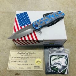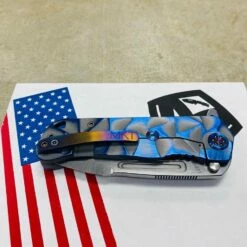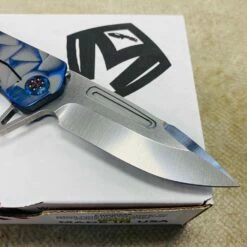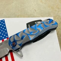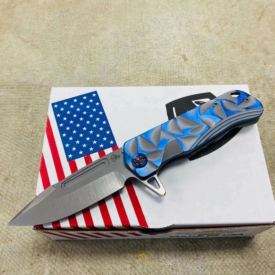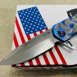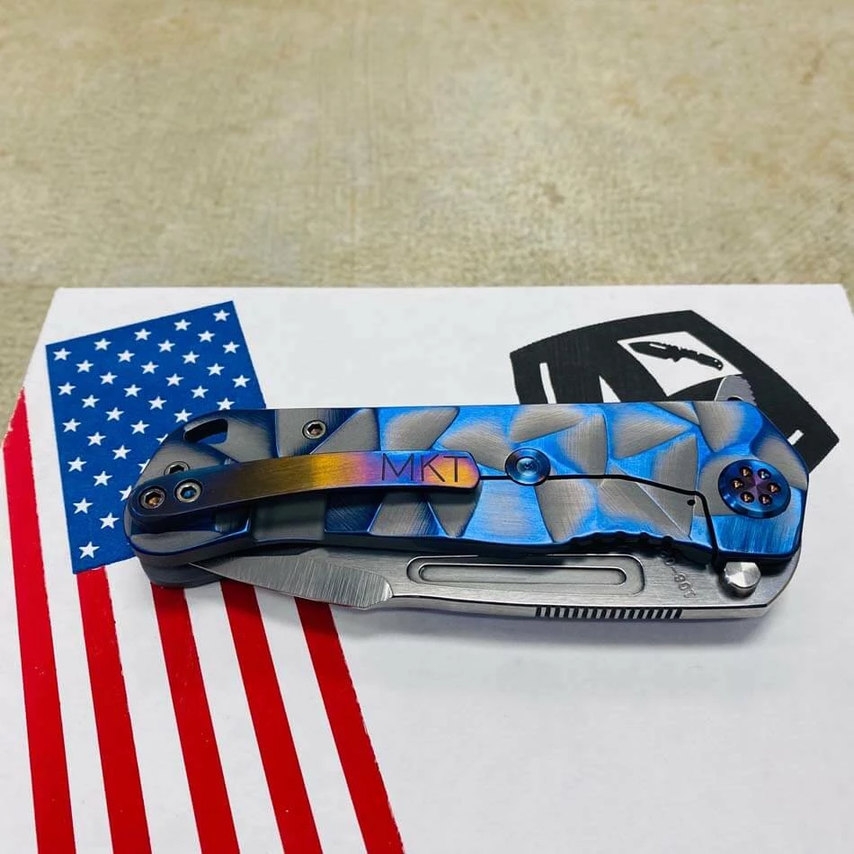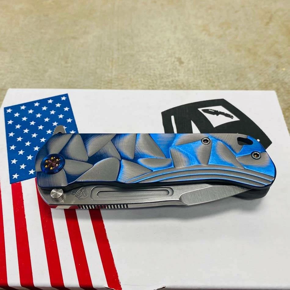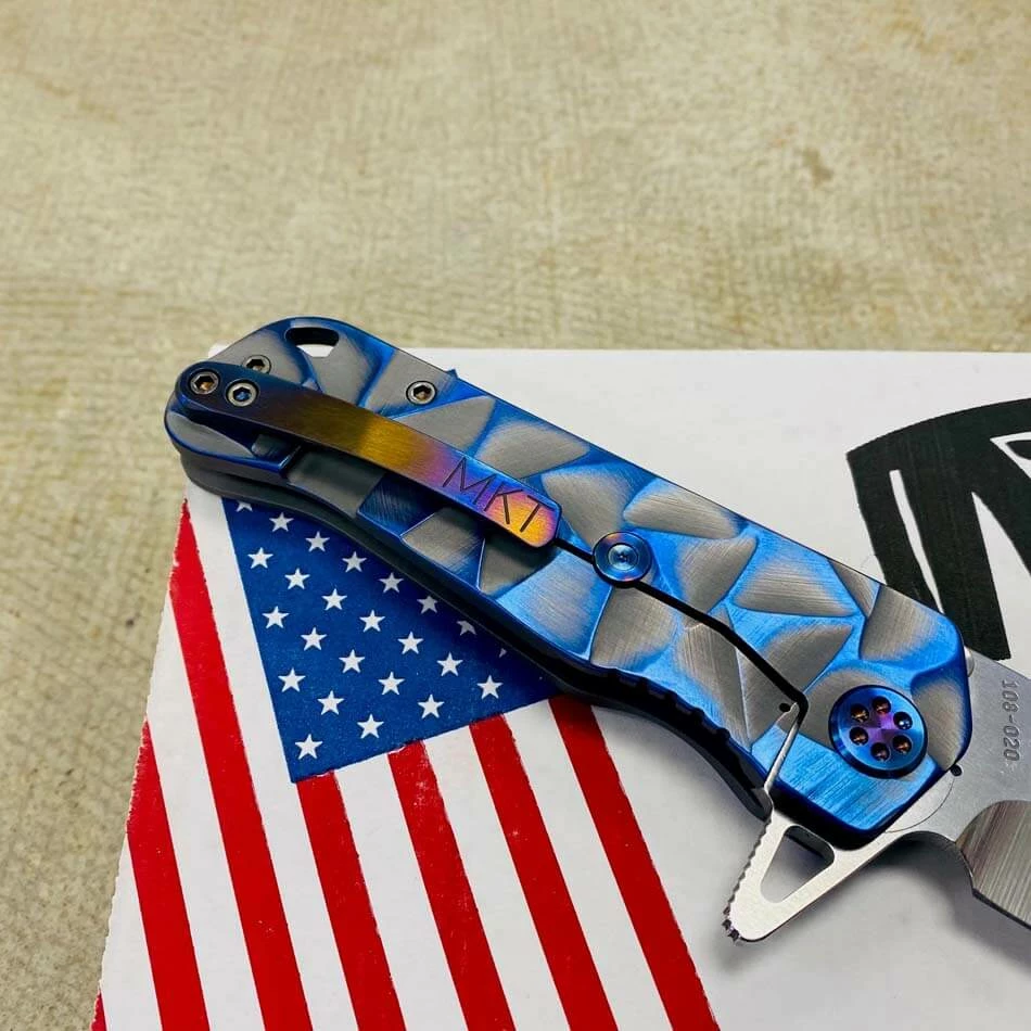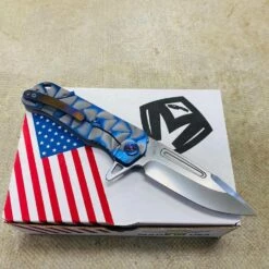 This Medford Proxima has cement with brushed blue flats stained glass handles, flamed hardware, brushed flamed clip The Medford Knife and Tool Proxima started life as the Gigantes. For folks that wanted a larger than life knife it was awesome, but for the rest of planet Earth an adjustment in attitude was required. We drew-down the overall length to 8.8″ with a 4.9″ closed length for the pocket and 3.9″ blade length. All materials are of 3/16″ nominal stock, making for a very EDC friendly thickness. We played with several twists on the original name but as the prototype was carried by Greg, he kept saying, This knife is too awesome to get a spin-off name. Since every time anyone needed to look at the prototype it was in Greg’s pocket… always near, thus: Proxima. This is THE knife carried by Greg these days. As he says: I love the flipper/hilt and the basic meanness of this thing! It just looks bad ass and I look for reasons to snap it out all day What else can we say?