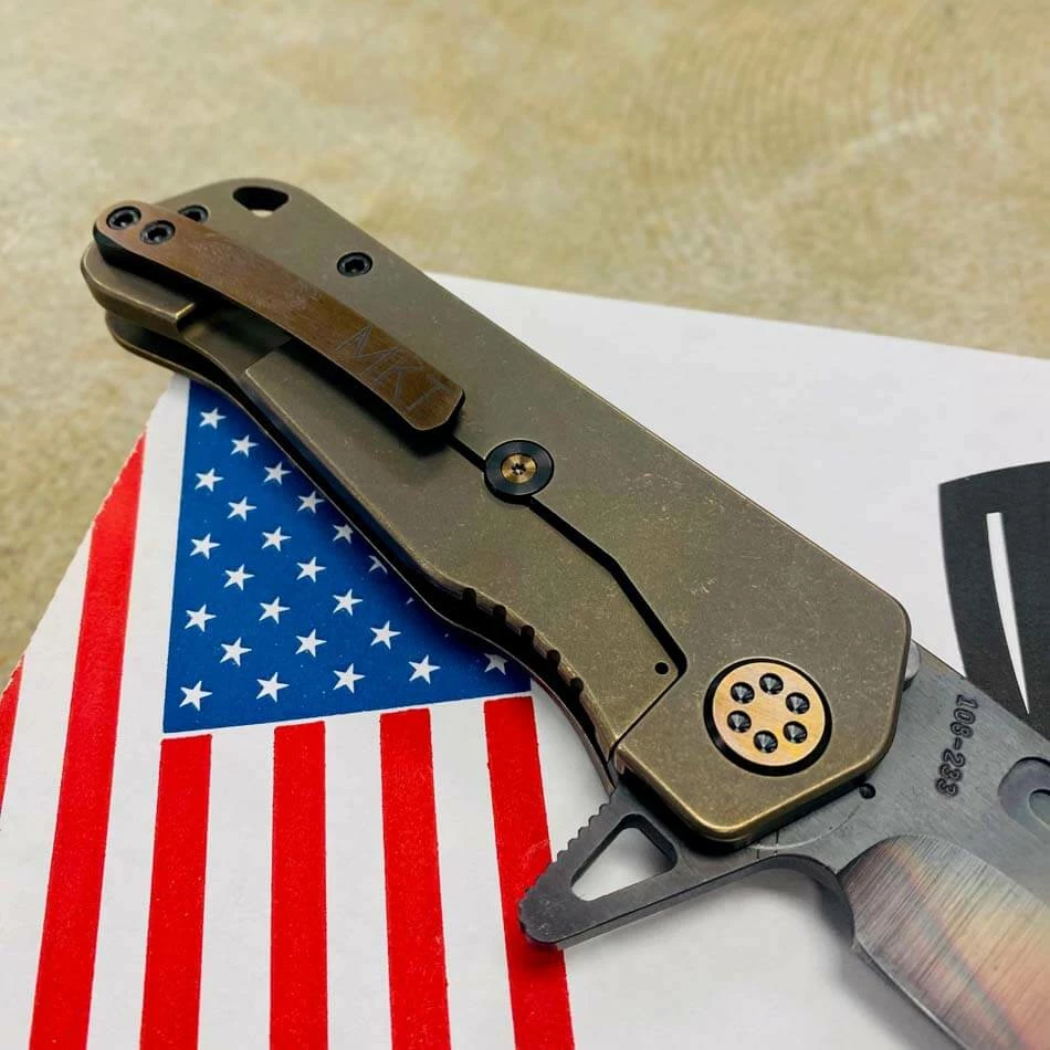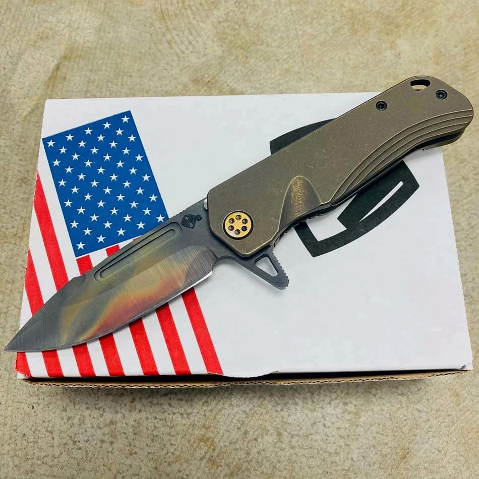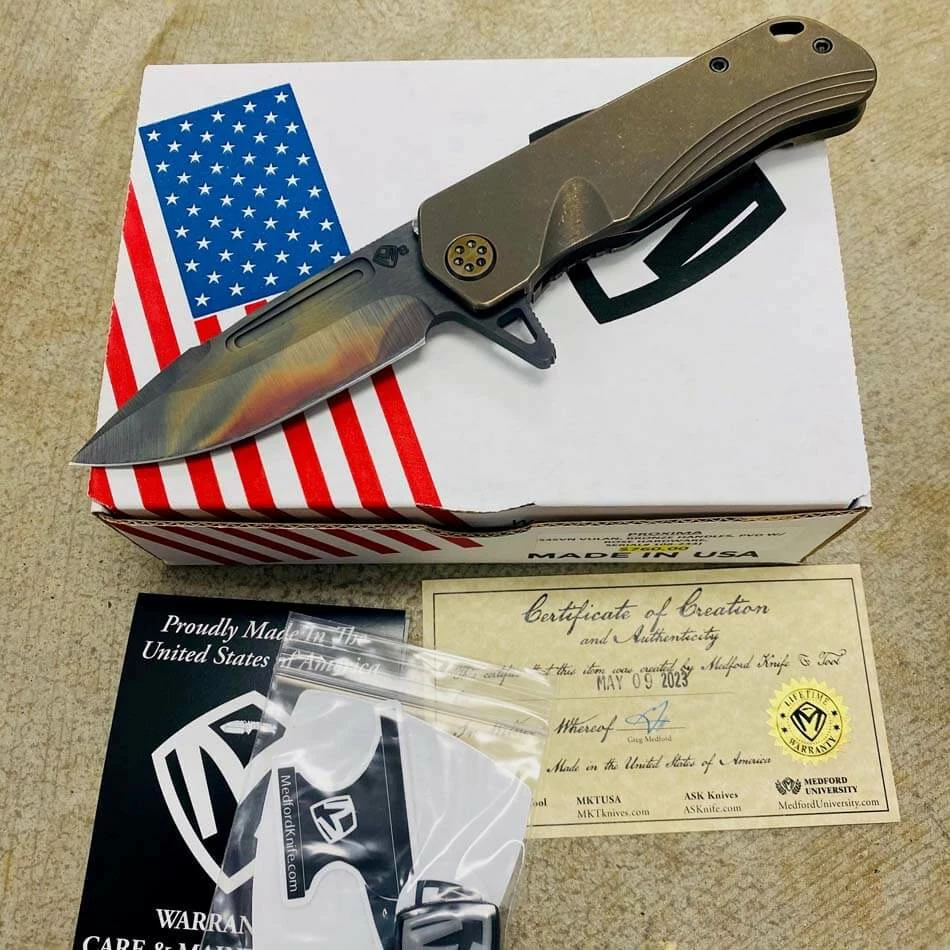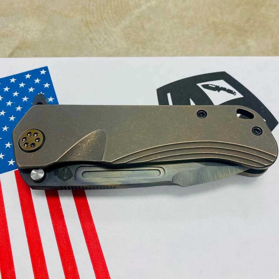 This Medford Proxima has bronze handles, PVD with Rose hardware, PVD with Rose clip The Medford Knife and Tool Proxima started life as the Gigantes. For folks that wanted a larger than life knife it was awesome, but for the rest of planet Earth an adjustment in attitude was required. We drew-down the overall length to 8.8″ with a 4.9″ closed length for the pocket and 3.9″ blade length. All materials are of 3/16″ nominal stock, making for a very EDC friendly thickness. We played with several twists on the original name but as the prototype was carried by Greg, he kept saying, This knife is too awesome to get a spin-off name. Since every time anyone needed to look at the prototype it was in Greg’s pocket… always near, thus: Proxima. This is THE knife carried by Greg these days. As he says: I love the flipper/hilt and the basic meanness of this thing! It just looks bad ass and I look for reasons to snap it out all day What else can we say?