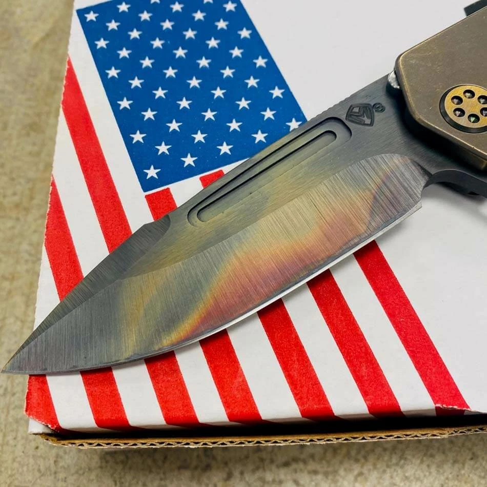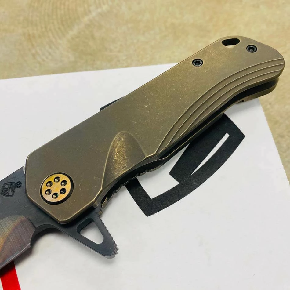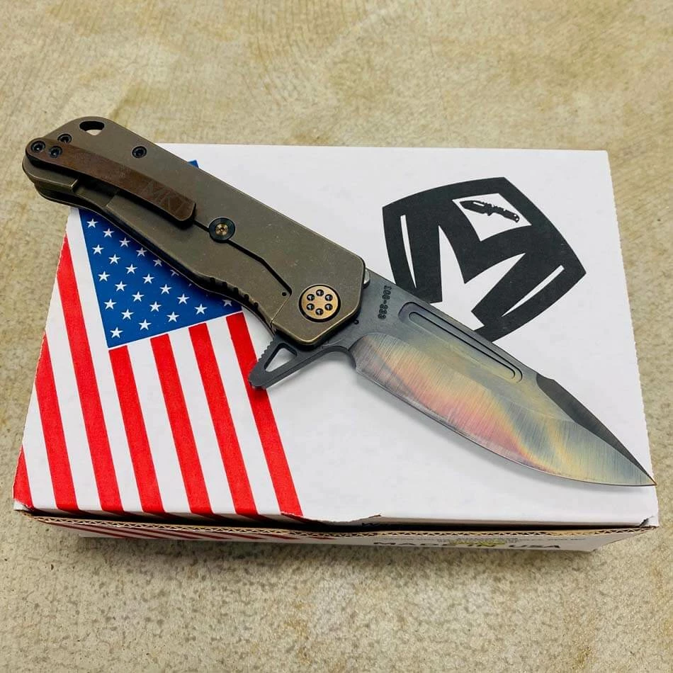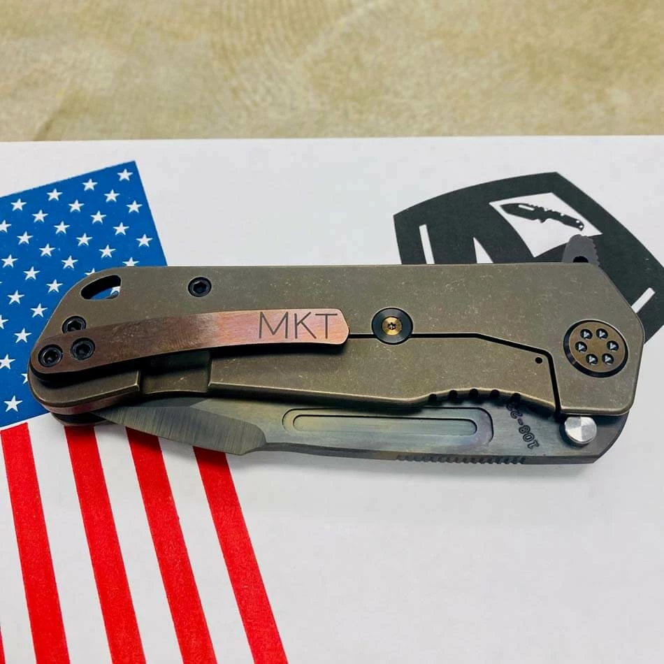 This Medford Proxima has bronze handles, PVD with Rose hardware, PVD with Rose clip The Medford Knife and Tool Proxima started life as the Gigantes. For folks that wanted a larger than life knife it was awesome, but for the rest of planet Earth an adjustment in attitude was required. We drew-down the overall length to 8.8″ with a 4.9″ closed length for the pocket and 3.9″ blade length. All materials are of 3/16″ nominal stock, making for a very EDC friendly thickness. We played with several twists on the original name but as the prototype was carried by Greg, he kept saying, This knife is too awesome to get a spin-off name. Since every time anyone needed to look at the prototype it was in Greg’s pocket… always near, thus: Proxima. This is THE knife carried by Greg these days. As he says: I love the flipper/hilt and the basic meanness of this thing! It just looks bad ass and I look for reasons to snap it out all day What else can we say?
