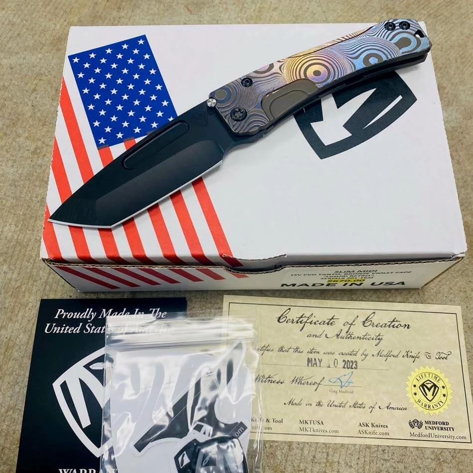 The Medford Slim Midi Knife sports a .125” thick 3V blade and 1/8” thick Ti handle and spring, proving to be one of our most pocket friendly EDC knives. Being known for making knives that are more for tactical, adventure and military use, knives such as these open up a whole new market segment for us – the business class. These are customers who want to carry a Medford in their dress slacks, holster or a purse, but when deployed at almost 8” have the Medford familiarity. These are true EDC knives that don’t “get in the way.”.
