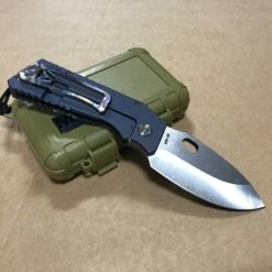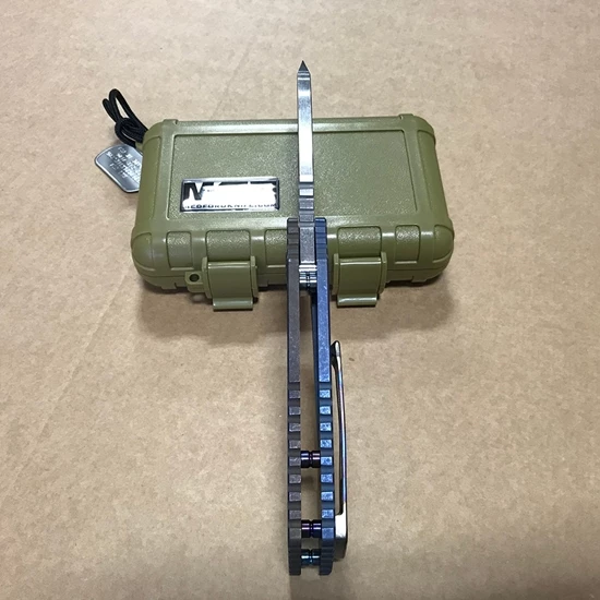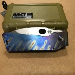 The TFF-1 Fat Daddy “fire rain” flamed handle, blue ano spring, flamed hardward, flamed clip. The blade is meant to be two-hand stowed and unintentional retraction of the blade is nearly impossible.