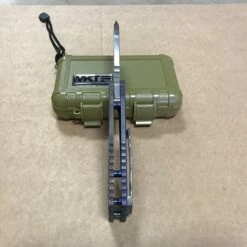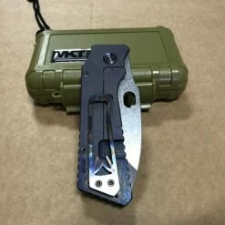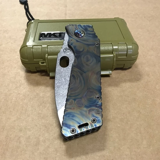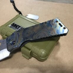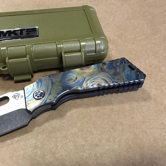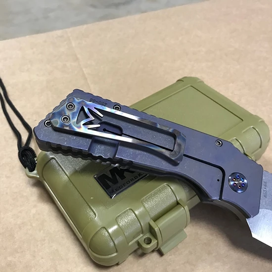 The TFF-1 Fat Daddy “fire rain” flamed handle, blue ano spring, flamed hardward, flamed clip. The blade is meant to be two-hand stowed and unintentional retraction of the blade is nearly impossible.