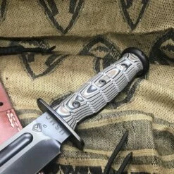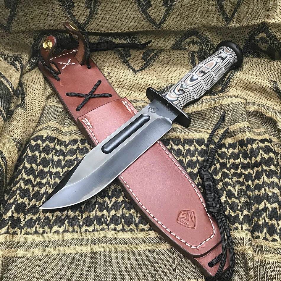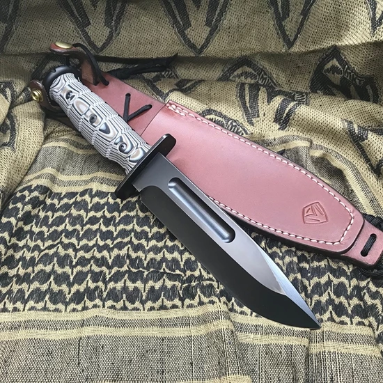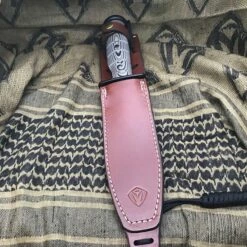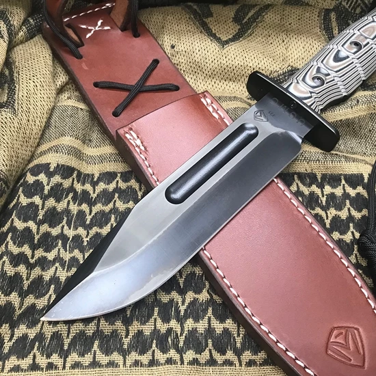 Medford USMC Fighter™: A modern, enhanced version of a classic. This fixed blade sports a .250” thick S35VN PVD blade, measures near 12” in total length, has 3-D surfaced multi-colored G-10 scales, a 2-piece interlocking Ti PVD hilt and solid Ti PVD pommel. This unique full tang design has all the upside of a classic hidden-tang “slide-over” hilt construction with none of the compromises in strength…as you’d expect, a Medford through and through. With a custom brown leather sheath, a true 21st century fighting knife.